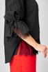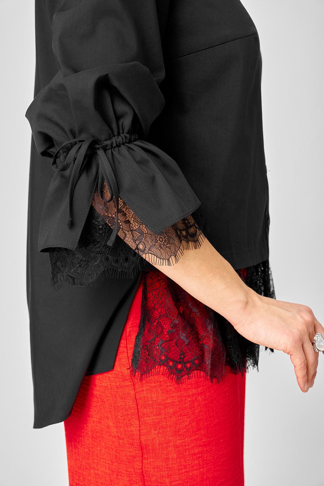 Блузка женская нарядно повседневного элегантного стиля, прямого силуэта с фигурным низом выполнена из шикарного дышащего хлопка в полоску в сочетании с красивым дорогим кружевом. Вырез горловины воротник на стойке рубашечного типа, застежка доверху на обметанные петли и пуговицы. Рукав спущенный, втачной по низу на притачной манжете, в боковых швах обработаны разрезы. На полочке функциональный накладной карман с отделкой из красивого кружева, изящная металлическая бренд лейбл и контрасные пуговицы придают изделию стильный и современный дизайн. Подрез с декоративным кружевом делает изделие трендом сезона. По спинке фигурная кокетка и встречная складка, создают идеальную посадку. Универсальный силуэт, элегантный крой, стильный дизайн - все детали только подчеркивают достоинства фигуры, а декор из кружева создает трендовый образ.