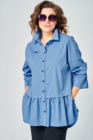 Блузка женская нарядно повседневного элегантного стиля, прямого силуэта с фигурным низом выполнена из шикарного дышащего хлопка. Вырез горловины воротник на стойке рубашечного типа, застежка доверху на обметанные петли и пуговицы. Рукав спущенный, втачной по низу на притачной манжете, в боковых швах обработаны разрезы. На полочке функциональный накладной карман, изящная металлическая бренд лейбл и контрасные пуговицы придают изделию стильный и современный дизайн. Подрез по полочке делает изделие трендом сезона. По спинке фигурная кокетка и встречная складка, создают идеальную посадку. Универсальный силуэт, элегантный крой, стильный дизайн - все детали только подчеркивают достоинства фигуры, а фасон создает трендовый образ.