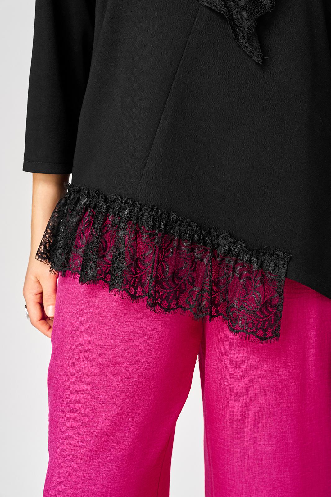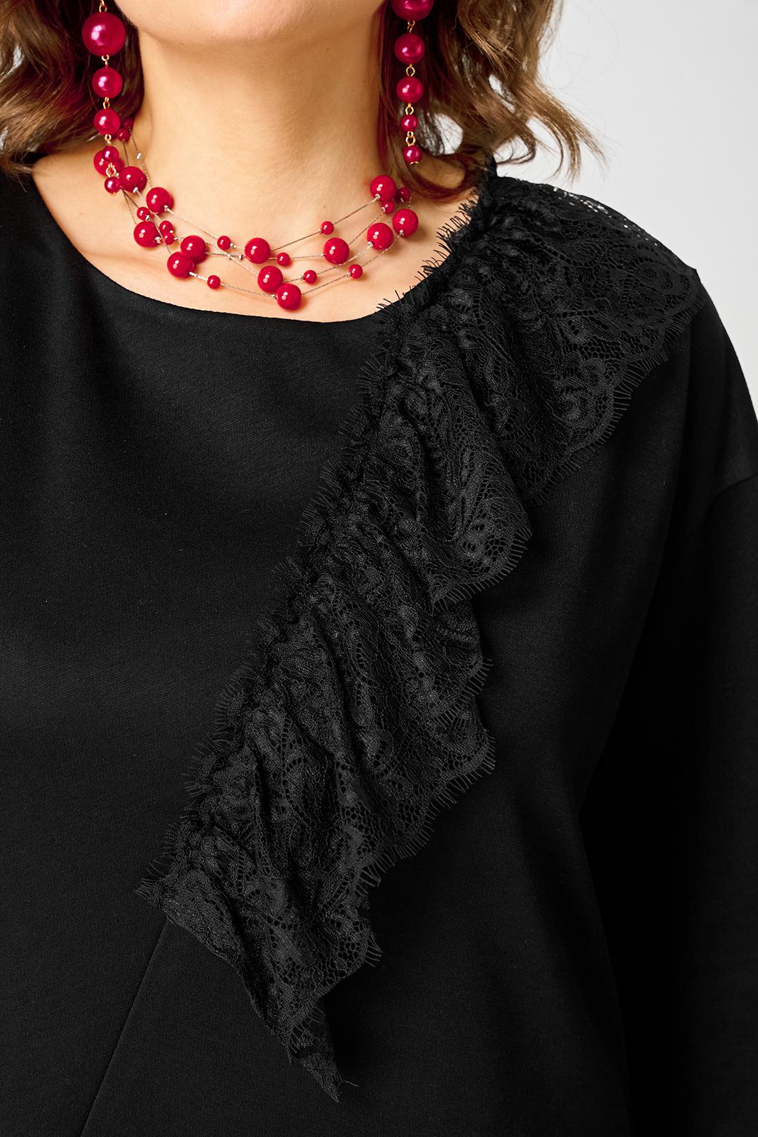 Блуза шикарная красивая женская нарядно-повседневная полуприлегающего силуэта, создает образ элегантной обладательницы, выполнена из дорогого трикотажа в сочетании с итальянским кружевом. Вырез горловины круглый на обтачке, плечо спущенное, рукав втачной 7/8 по центру с небольшими разрезами. Такой дизайн рукава создает свободу облегания и придает утонченность фигуре. Низ блузы фигурный, стильно декорирован кружевом.