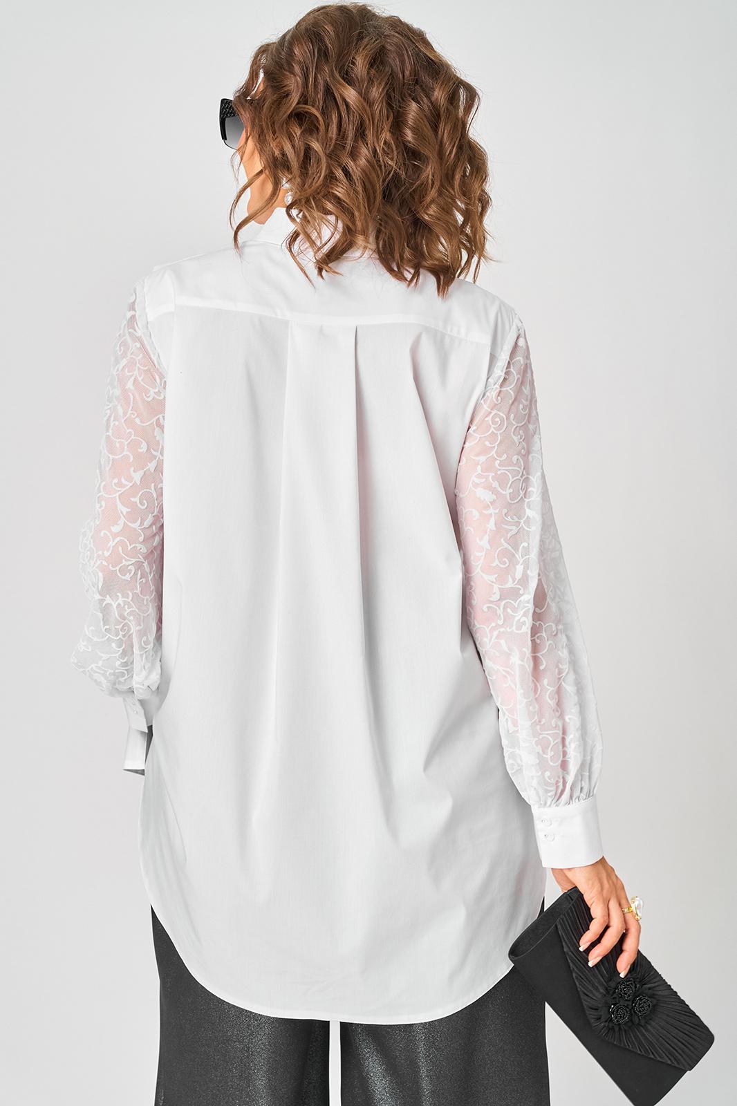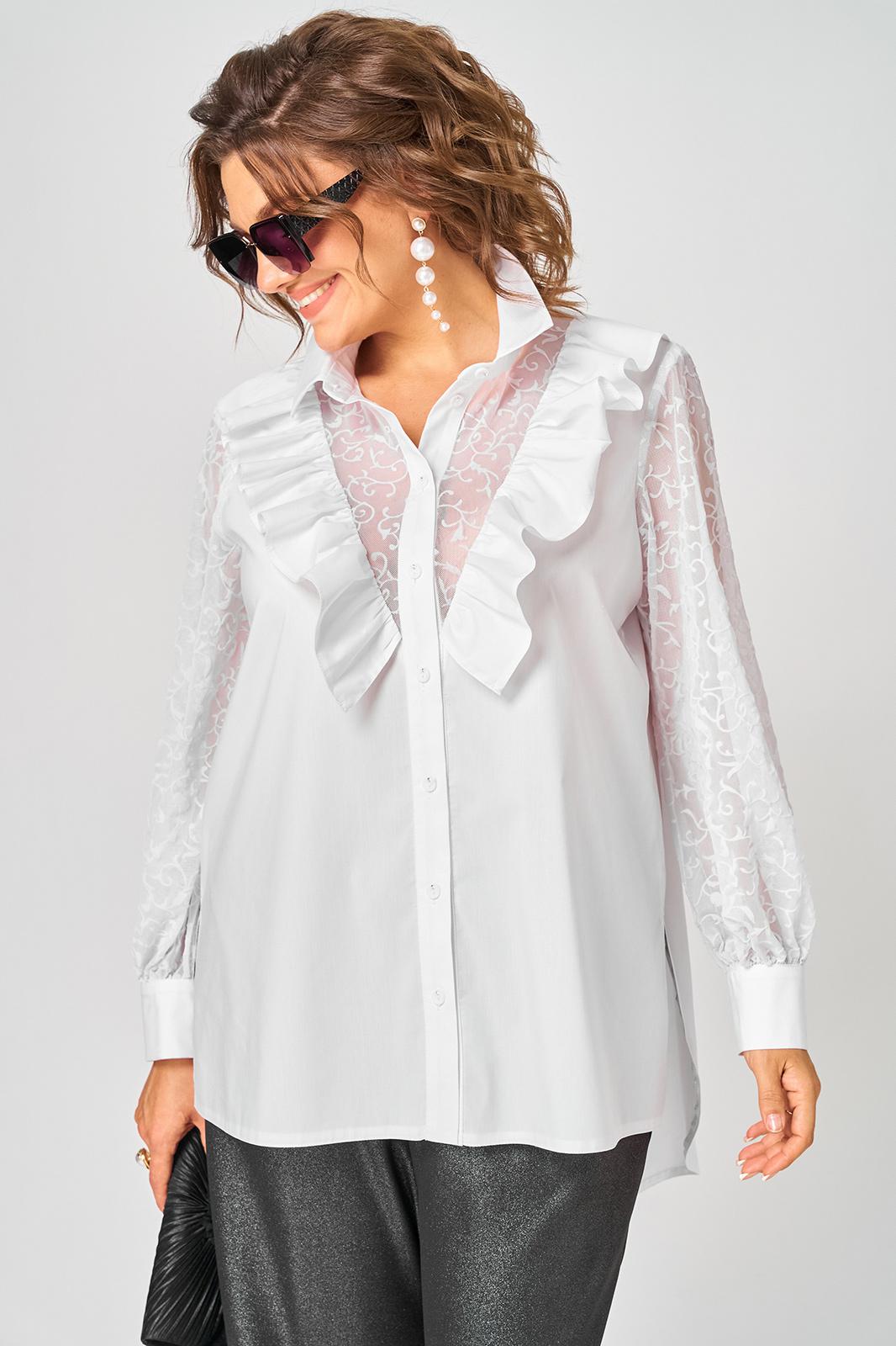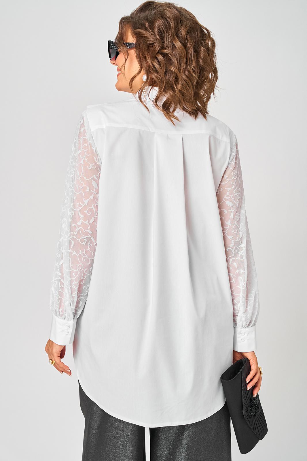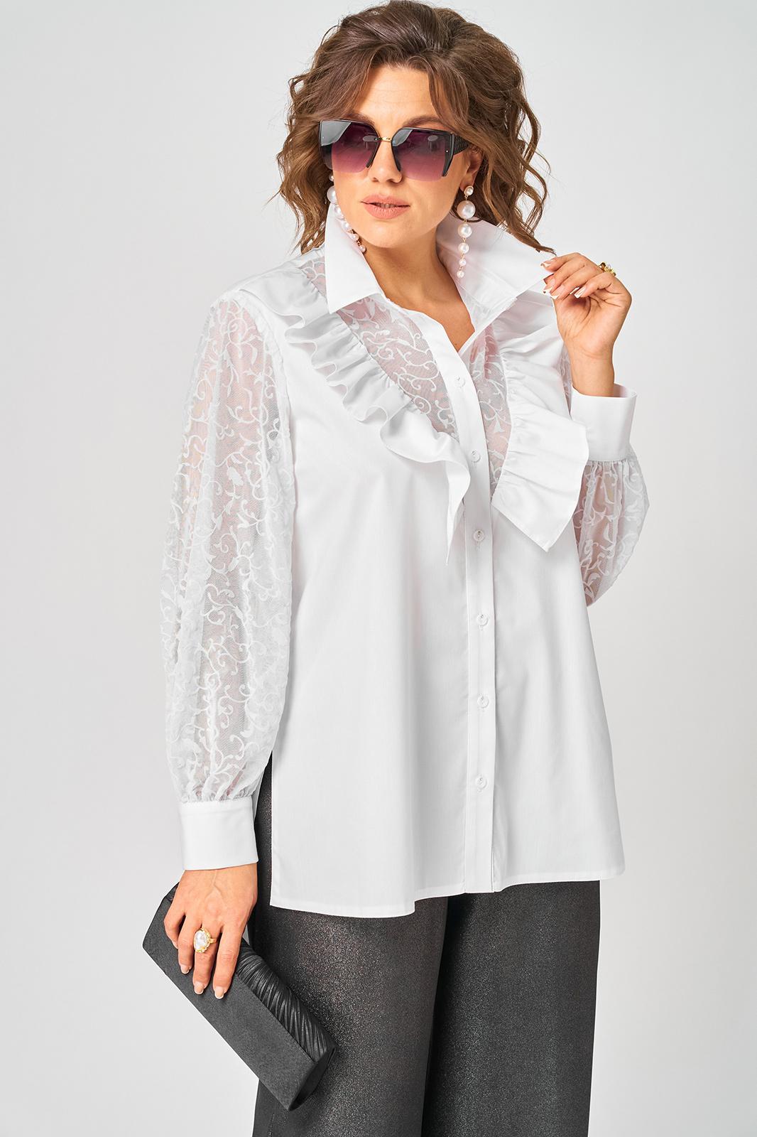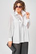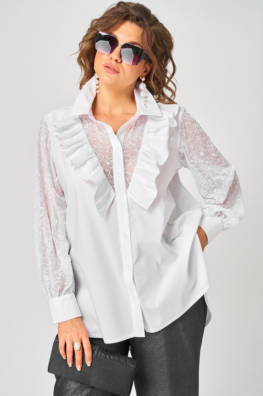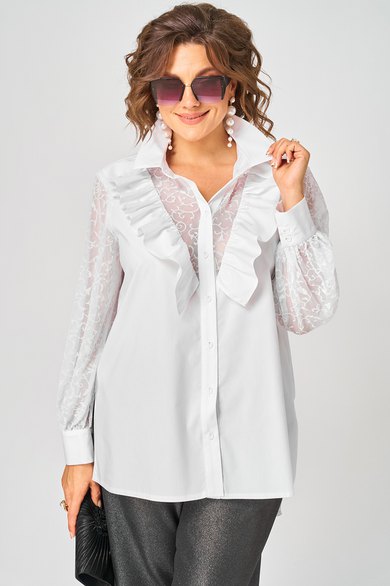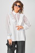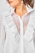 Блузка - шикарная женская элегантная нарядная свободного силуэта выполнена из хлопка в сочетании с гипюром (сеткой с флоком). Вырез горловины воротник на стойке рубашечного типа, рукав втачной из гипюра (сетки) по низу на сборке и притачной манжете. Застежка доверху на обметанные петли и пуговицы. По полочке фигурные вставки из гипюра (сетки) с притачной рюшей с двух сторон. Рюша входит в плечо. В боковых швах обработаны разрезы. Низ блузы фигурный. Декором блузы служит дизайн гипюра (сетки) и рюши со сборкой.