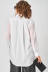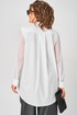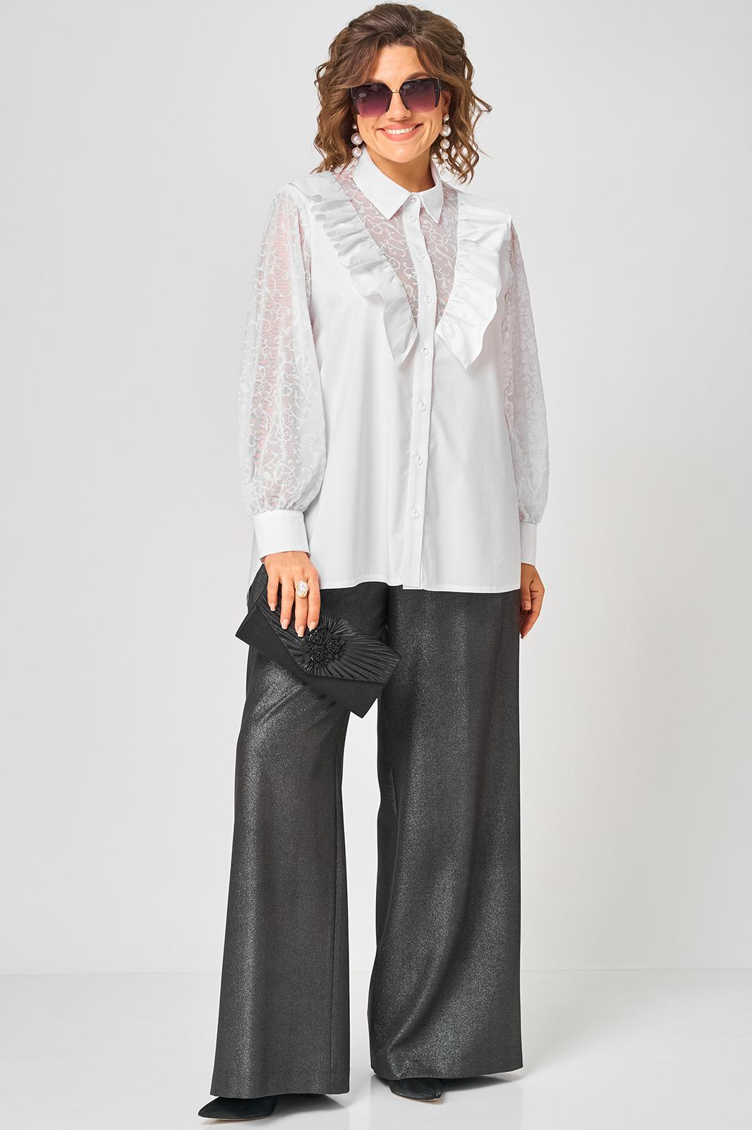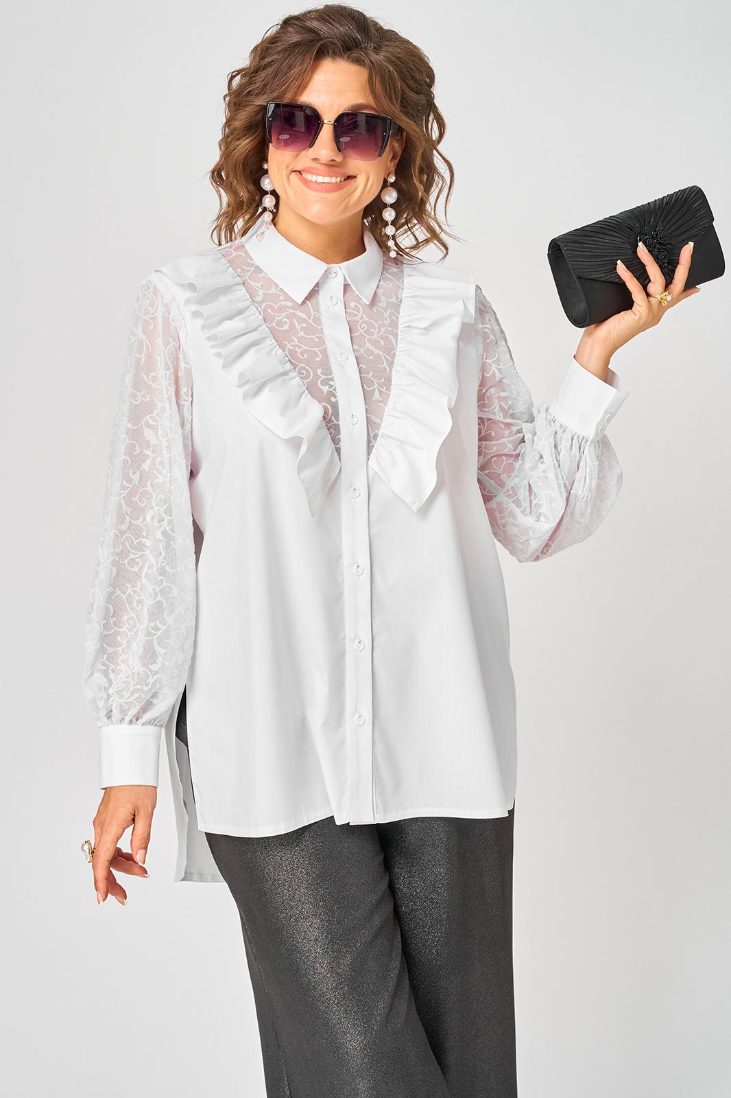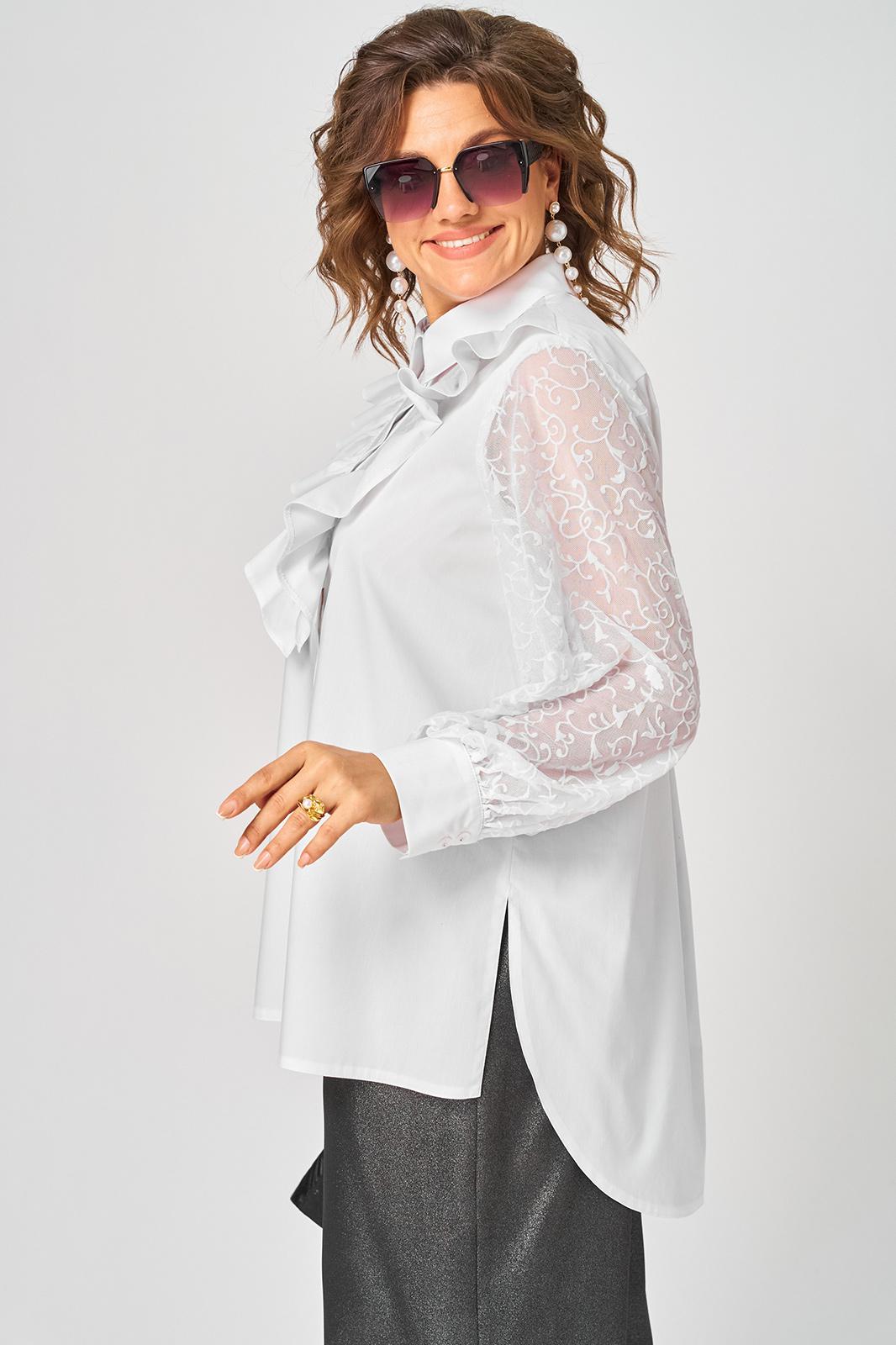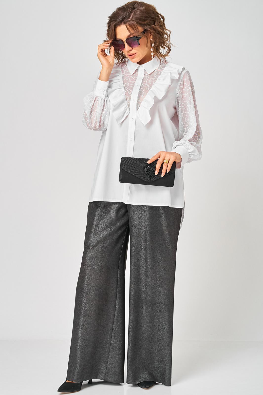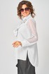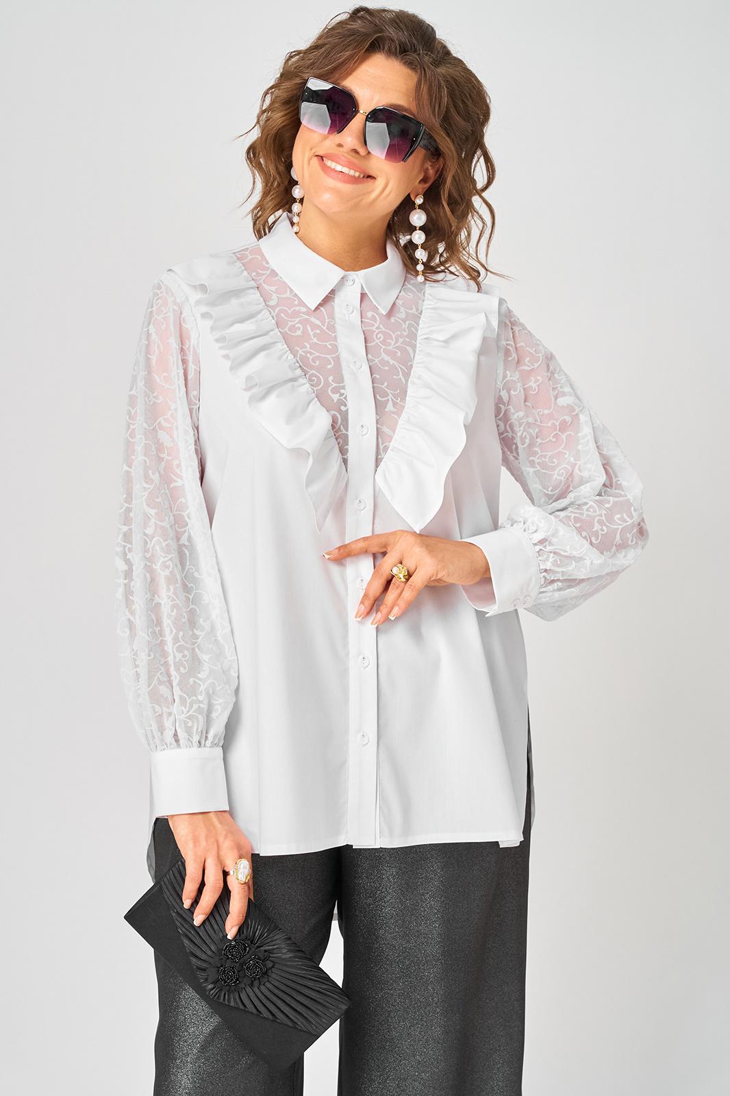 Блузка - шикарная женская элегантная нарядная свободного силуэта выполнена из хлопка в сочетании с гипюром (сеткой с флоком). Вырез горловины воротник на стойке рубашечного типа, рукав втачной из гипюра (сетки) по низу на сборке и притачной манжете. Застежка доверху на обметанные петли и пуговицы. По полочке фигурные вставки из гипюра (сетки) с притачной рюшей с двух сторон. Рюша входит в плечо. В боковых швах обработаны разрезы. Низ блузы фигурный. Декором блузы служит дизайн гипюра (сетки) и рюши со сборкой.