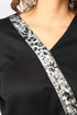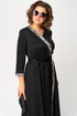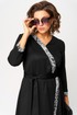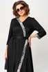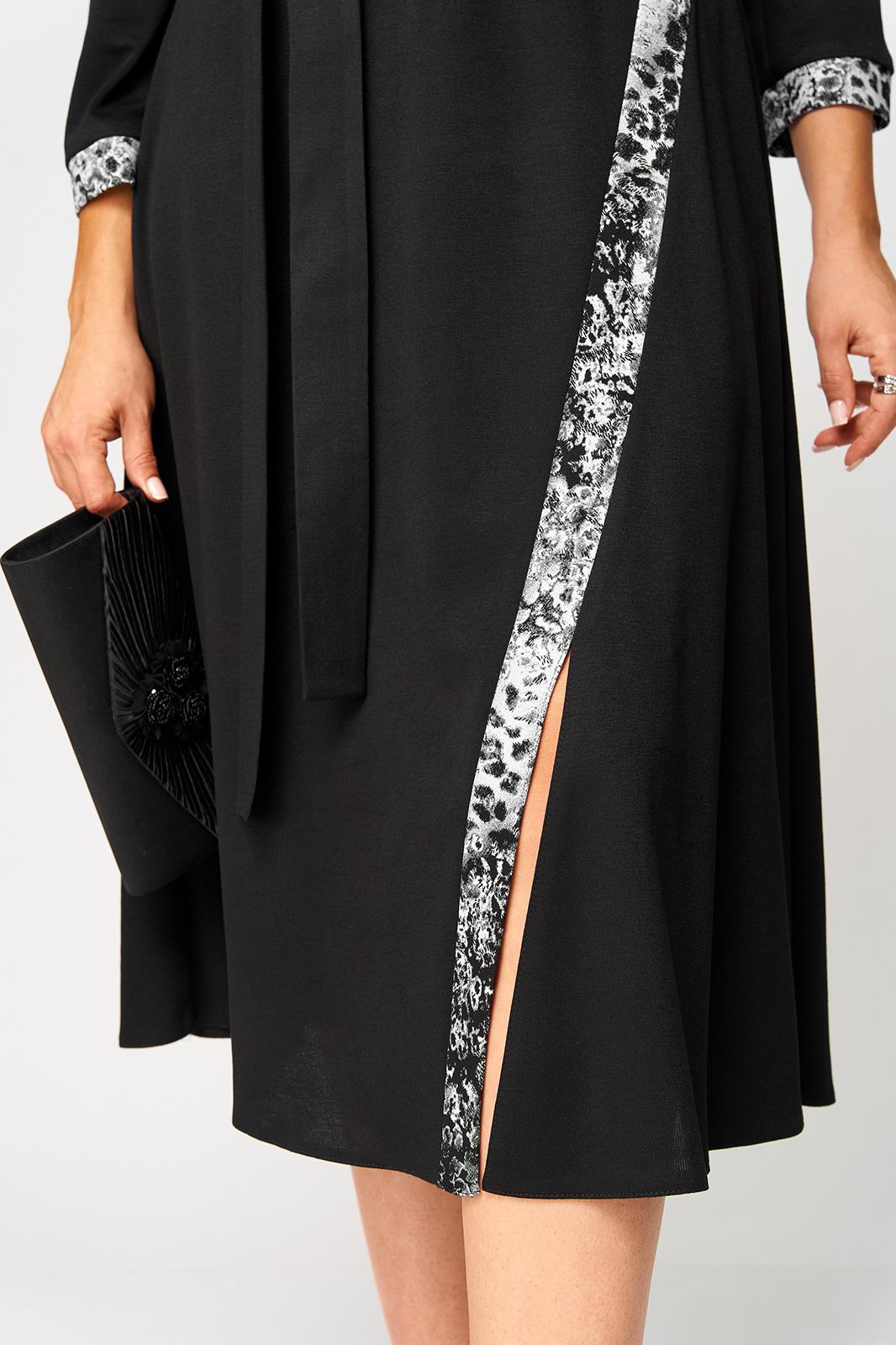 Плате женское повседневное полуприлегающего силуэта выполнено из трикотажного полотна в сочетании с отделкой. Вырез горловины V-образный на обтачке. Рукав втачной 7/8 по низу на притачной манжете из отделочной ткани. По переду патье с выточками и отрезными ассиметричными элементами из отделочной ткани. По центру платья обработан небольшой разрез. Декором платья служит съемный пояс из основной ткани.