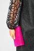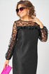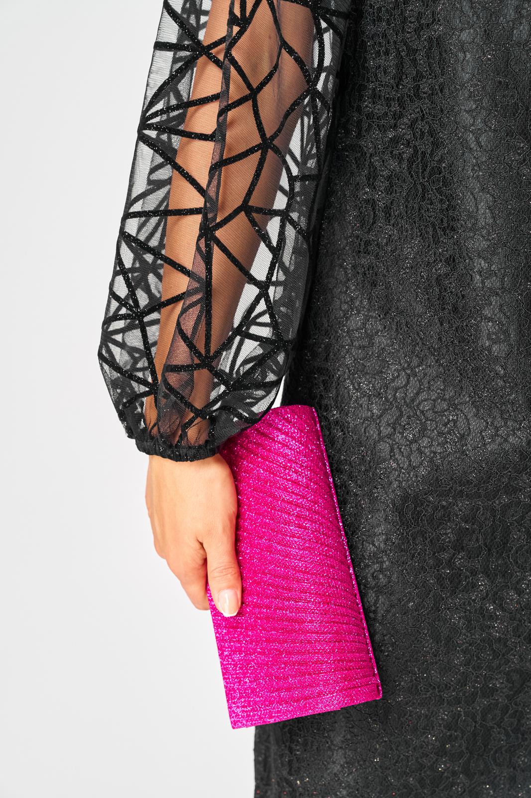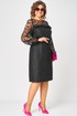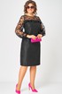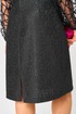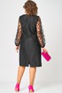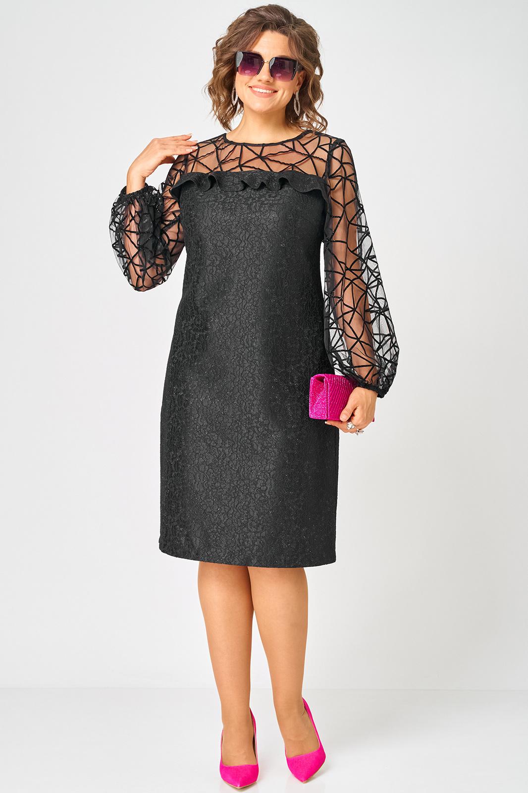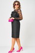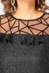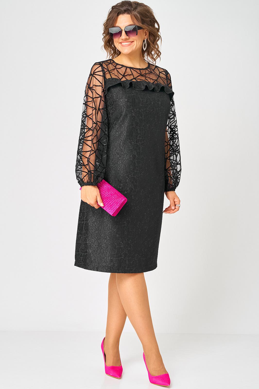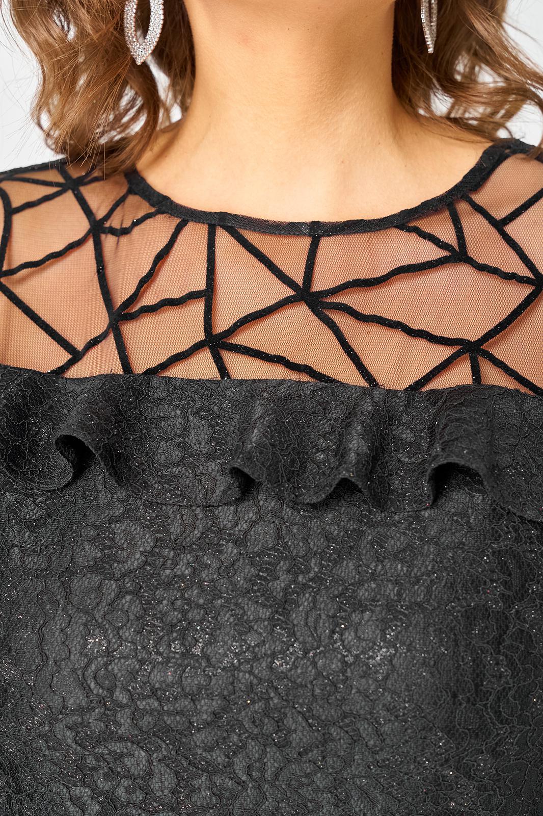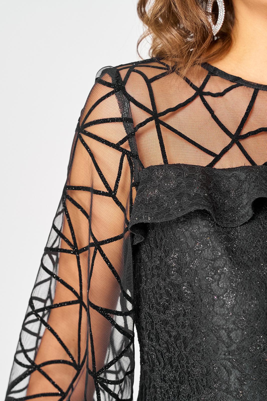 Платье женское нарядное полуприлегающего силуэта выполнено из плательной ткани с набивным рисунком с блестками (не сыпется) в сочетании с сеткой с флоком. Вырез горловины круглый обработан косой бейкой, рукав втачной из сетки по низу собран на резинку. По полочке кокетка из сетки и отделочный элемент в виде волана. По полочке нагрудные вытачки. Спинка с центральным швом, вытачками и небольшим разрезом. Застежка - потайная тесьма молния. Декором платья служит дизайн сетки и волан по полочке.