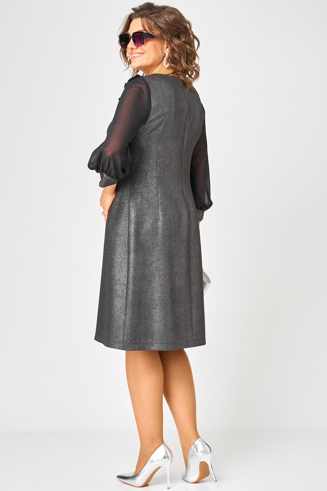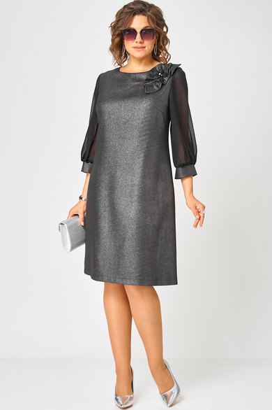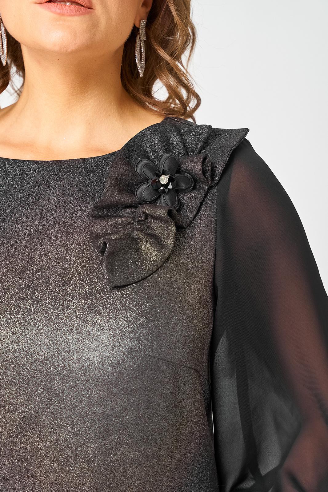Платье женское полуприлегающего силуэта выполнено из плательной ткани с мерцающим пропитанным блеском (не сыпется) в сочетании с шифоном. Вырез горловины круглый на обтачке, по полочке нагрудные втачки, рукав втачной из шифона 7/8 по низу на сборке и притачной манжете. По спинке потайная тесьма - молния и вытачки. Декором платья служит декоративный пришивной элемент со съемной брошью.