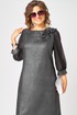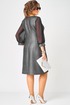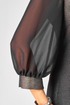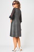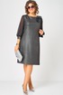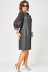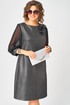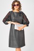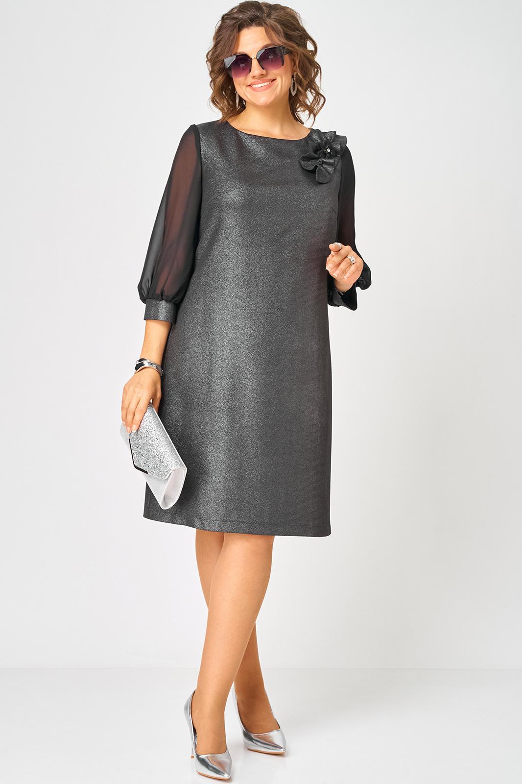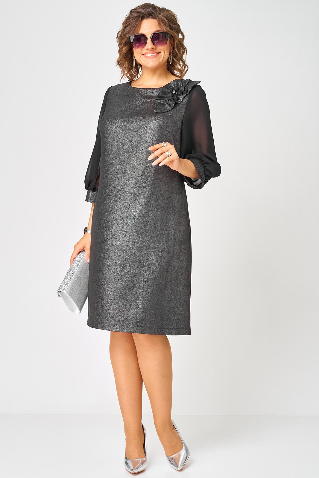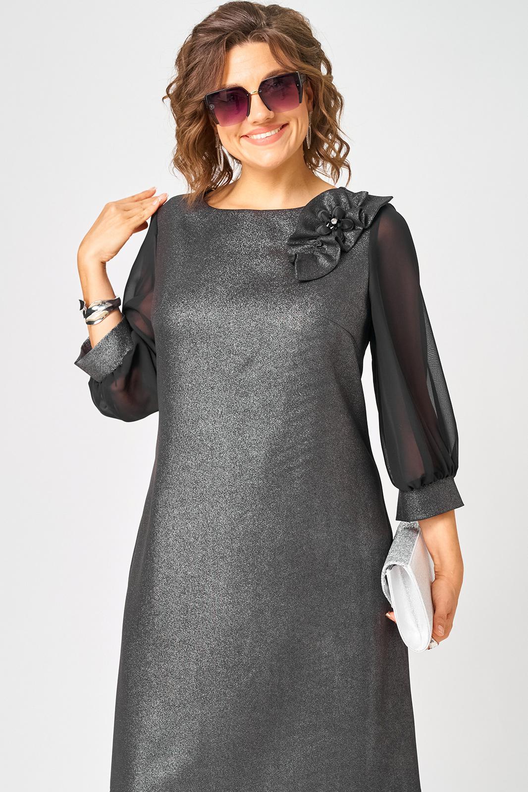 Платье женское полуприлегающего силуэта выполнено из плательной ткани с мерцающим пропитанным блеском (не сыпется) в сочетании с шифоном. Вырез горловины круглый на обтачке, по полочке нагрудные втачки, рукав втачной из шифона 7/8 по низу на сборке и притачной манжете. По спинке потайная тесьма - молния и вытачки. Декором платья служит декоративный пришивной элемент со съемной брошью.