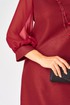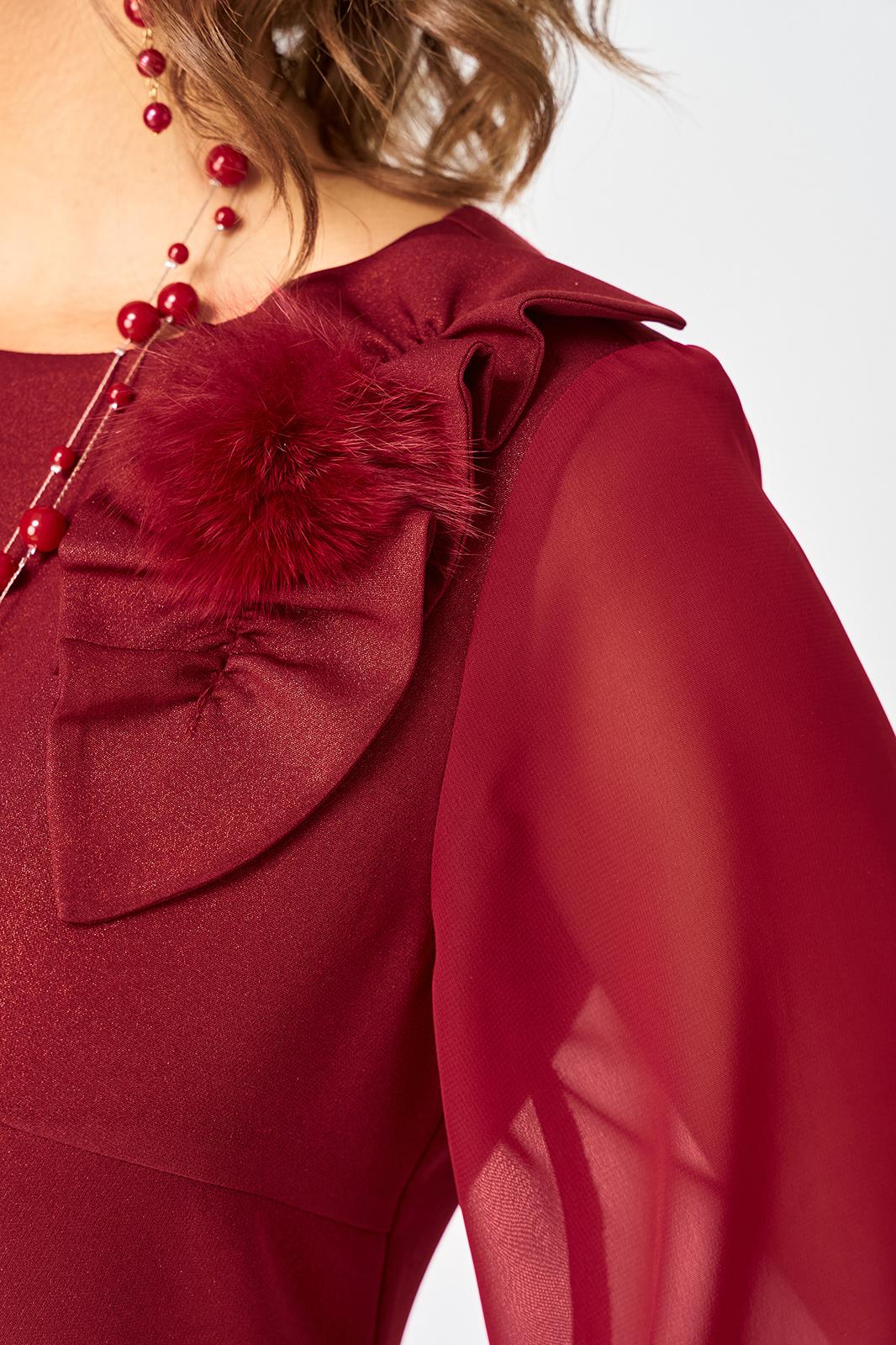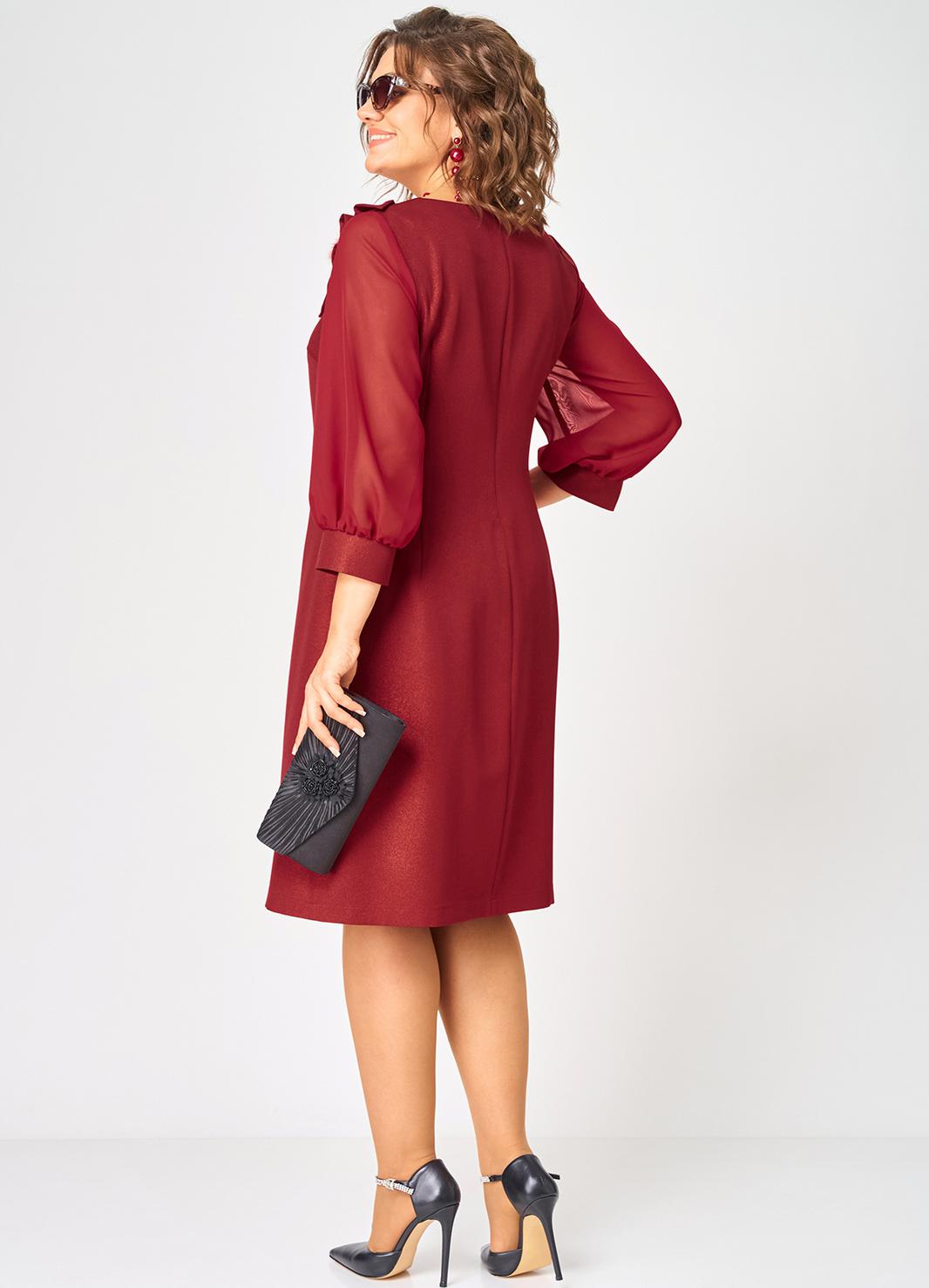 Платье женское полуприлегающего силуэта выполнено из плательной ткани с мерцающим пропитанным блеском (не сыпется) в сочетании с шифоном. Вырез горловины круглый на обтачке, по полочке нагрудные втачки, рукав втачной из шифона 7/8 по низу на сборке и притачной манжете. По спинке потайная тесьма - молния и вытачки. Декором платья служит декоративный пришивной элемент со съемной брошью.