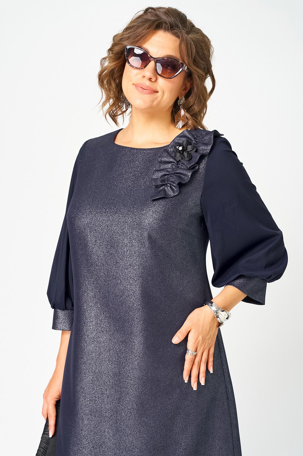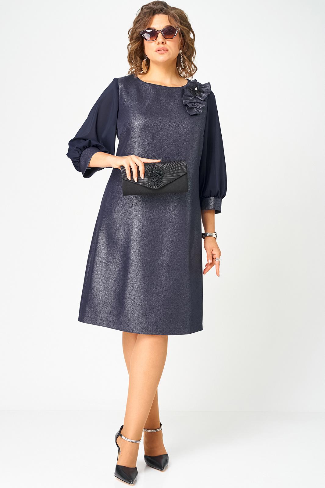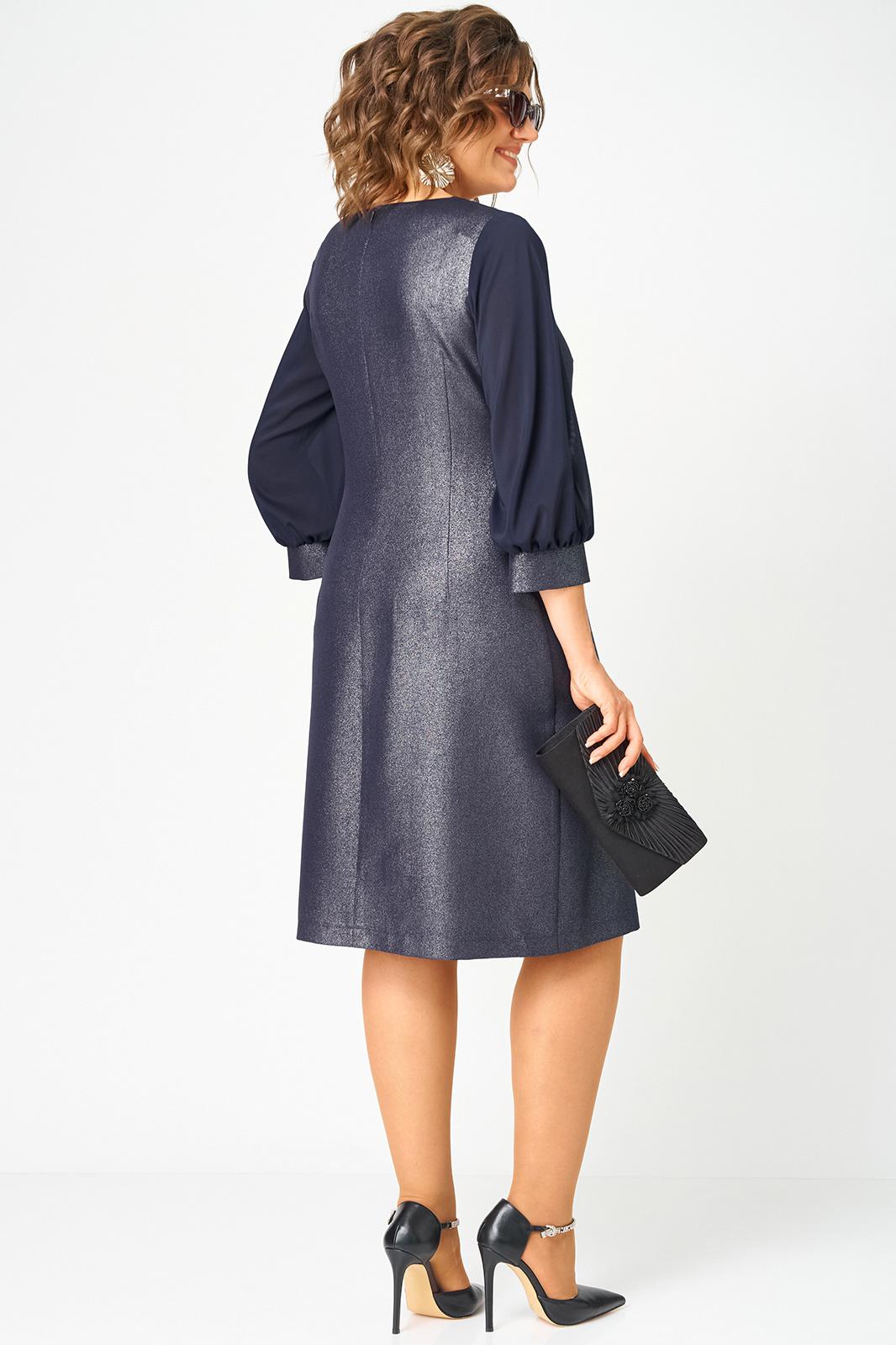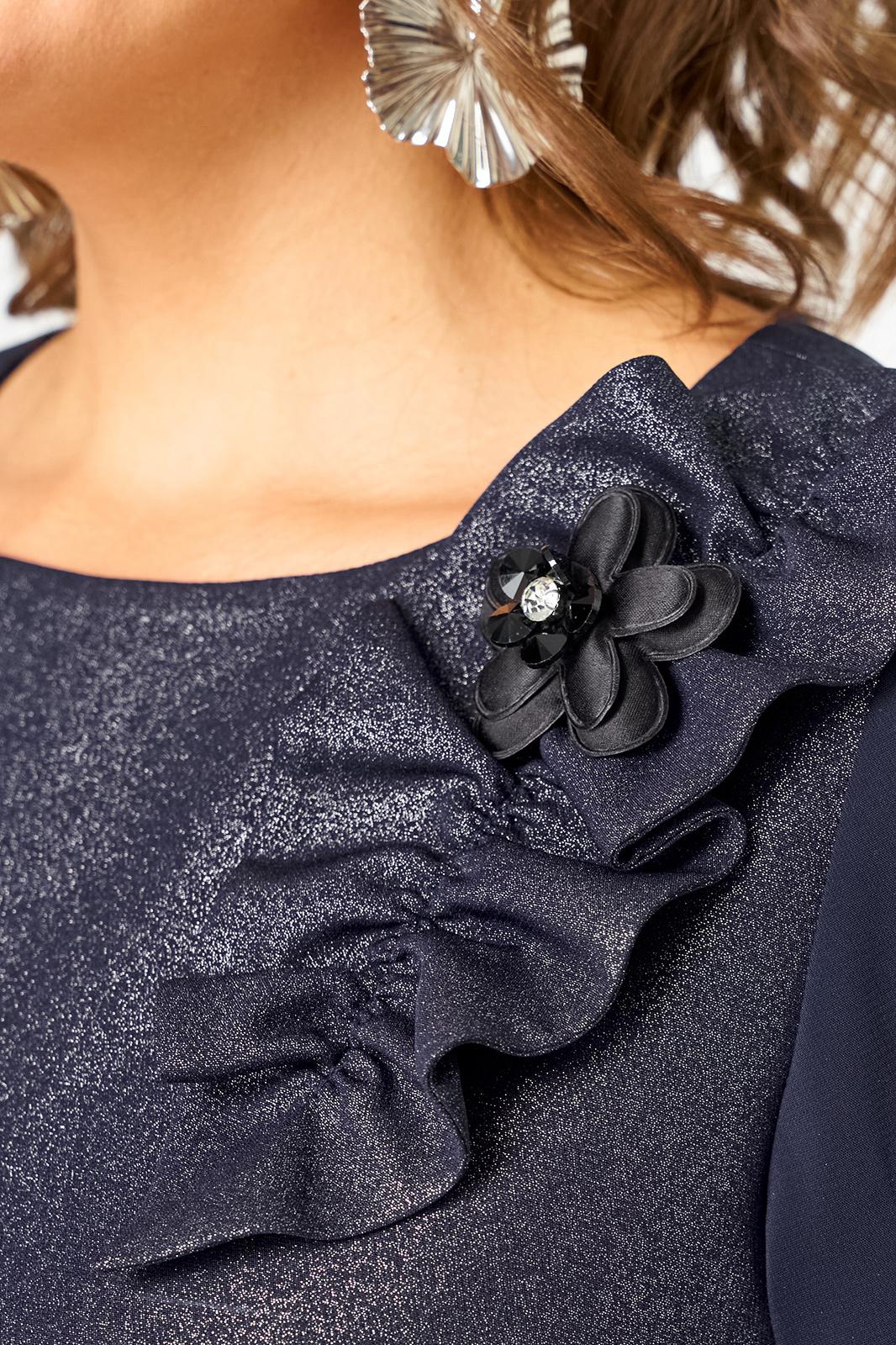 Платье женское полуприлегающего силуэта выполнено из плательной ткани с мерцающим пропитанным блеском (не сыпется) в сочетании с шифоном. Вырез горловины круглый на обтачке, по полочке нагрудные втачки, рукав втачной из шифона 7/8 по низу на сборке и притачной манжете. По спинке потайная тесьма - молния и вытачки. Декором платья служит декоративный пришивной элемент со съемной брошью.