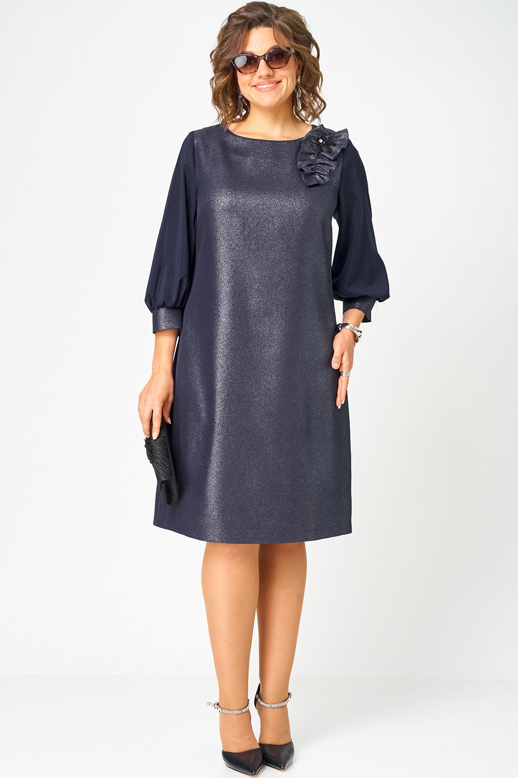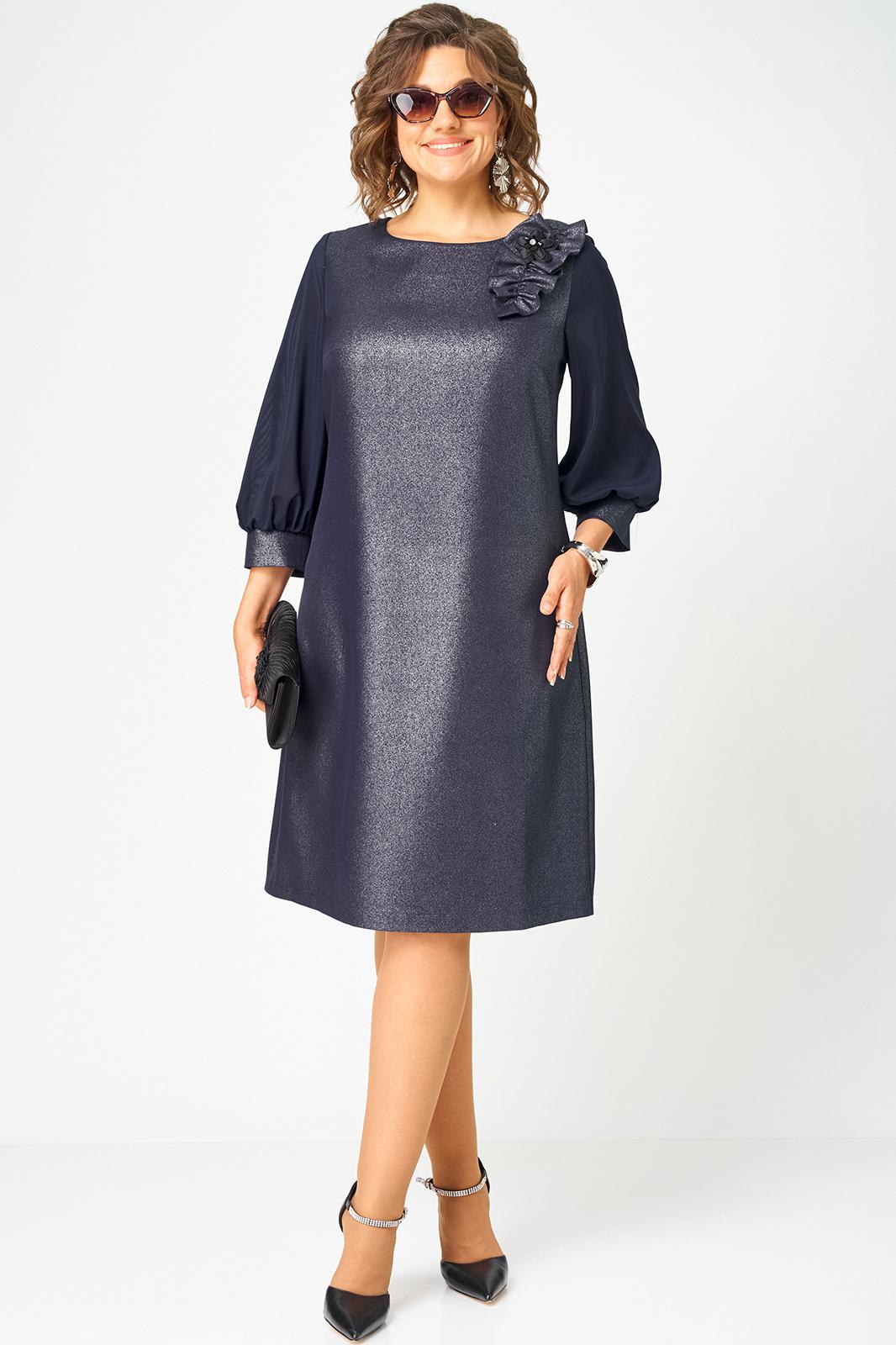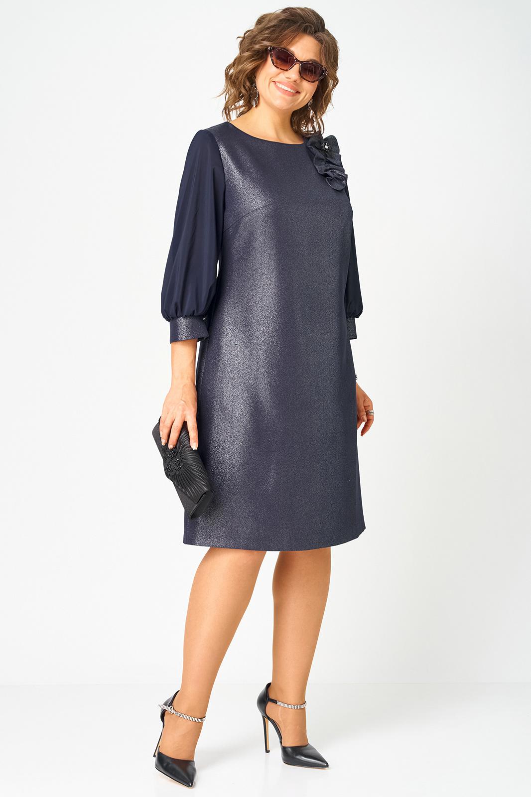 Платье женское полуприлегающего силуэта выполнено из плательной ткани с мерцающим пропитанным блеском (не сыпется) в сочетании с шифоном. Вырез горловины круглый на обтачке, по полочке нагрудные втачки, рукав втачной из шифона 7/8 по низу на сборке и притачной манжете. По спинке потайная тесьма - молния и вытачки. Декором платья служит декоративный пришивной элемент со съемной брошью.