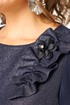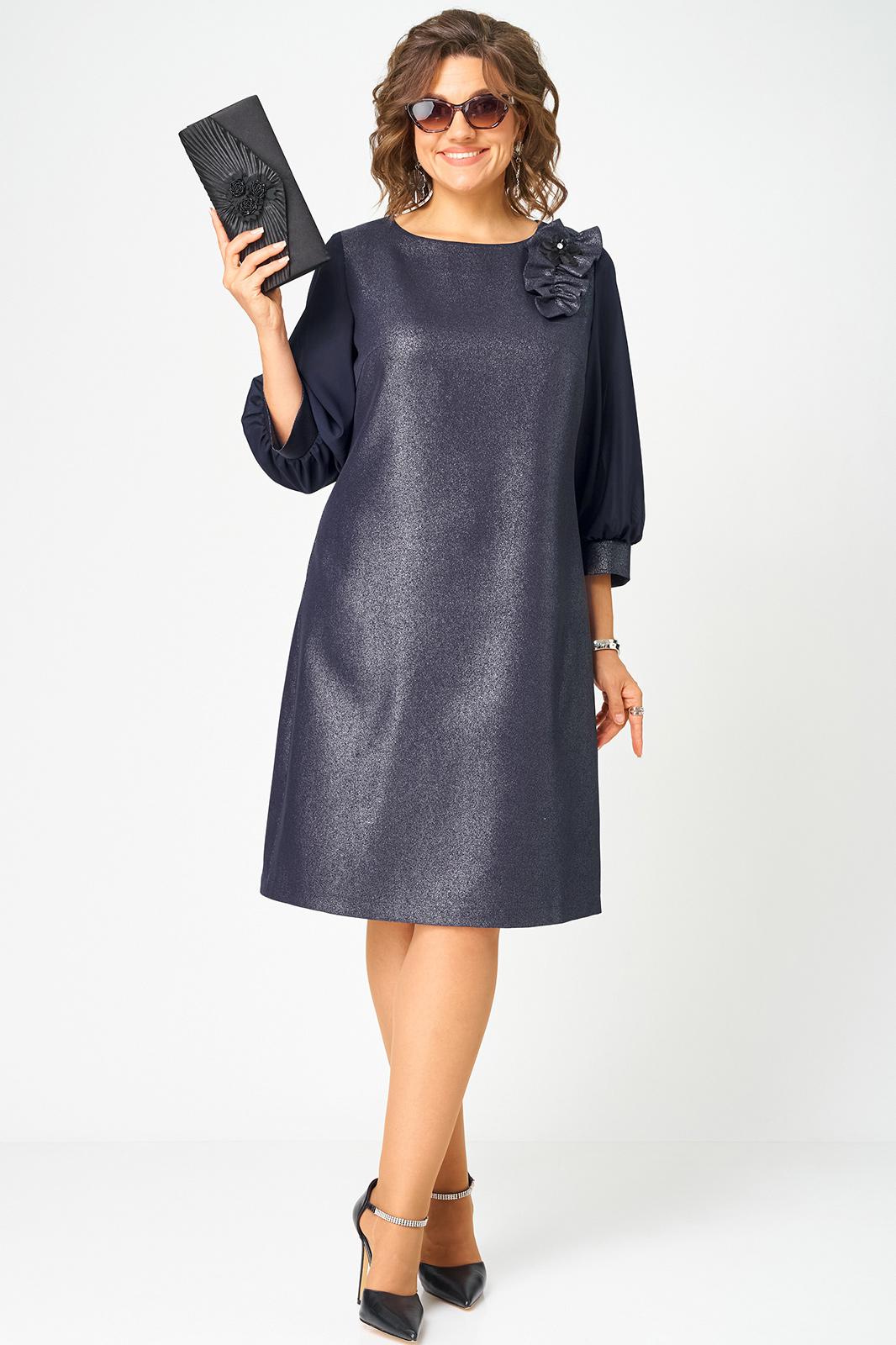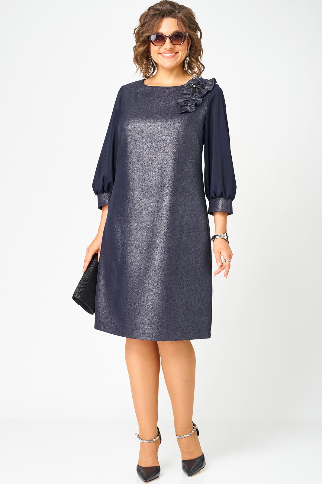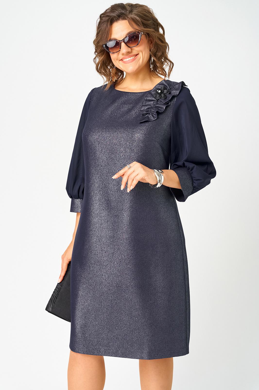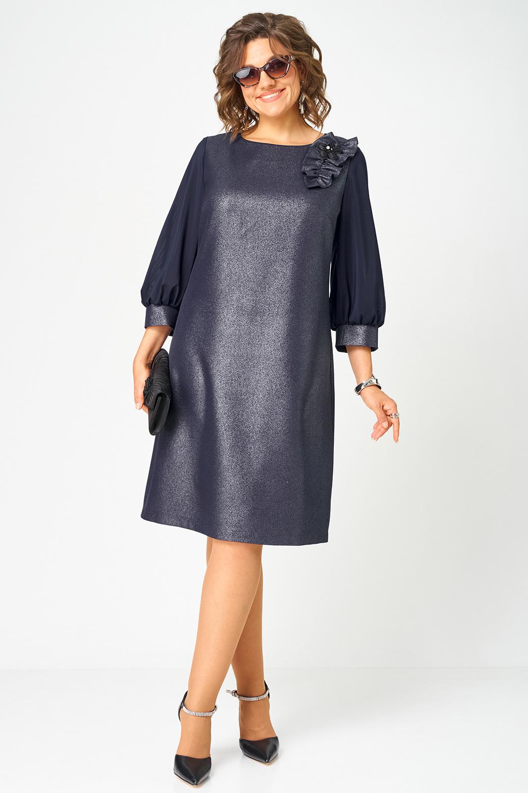 Платье женское полуприлегающего силуэта выполнено из плательной ткани с мерцающим пропитанным блеском (не сыпется) в сочетании с шифоном. Вырез горловины круглый на обтачке, по полочке нагрудные втачки, рукав втачной из шифона 7/8 по низу на сборке и притачной манжете. По спинке потайная тесьма - молния и вытачки. Декором платья служит декоративный пришивной элемент со съемной брошью.