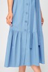 Платье женское нарядно-повседневное полуприлегающего силуэта расширенное к низу. Выполнено из хлопка. .Вырез горловины фигурный, воротник на стойке с фигурным вырезом. Рукав спущенный из отделочной ткани по низу с воланом собранным на сборку. Платье отрезное по лиии талии. Юбка ассиметричная с застежкой доверху на обметанные петли и пуговицы на подкладке. По низу юбки притачной волан из основной ткани. Декором платья служит дизайн ткани, съемный пояс из основной ткани и отделочные пуговицы.