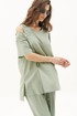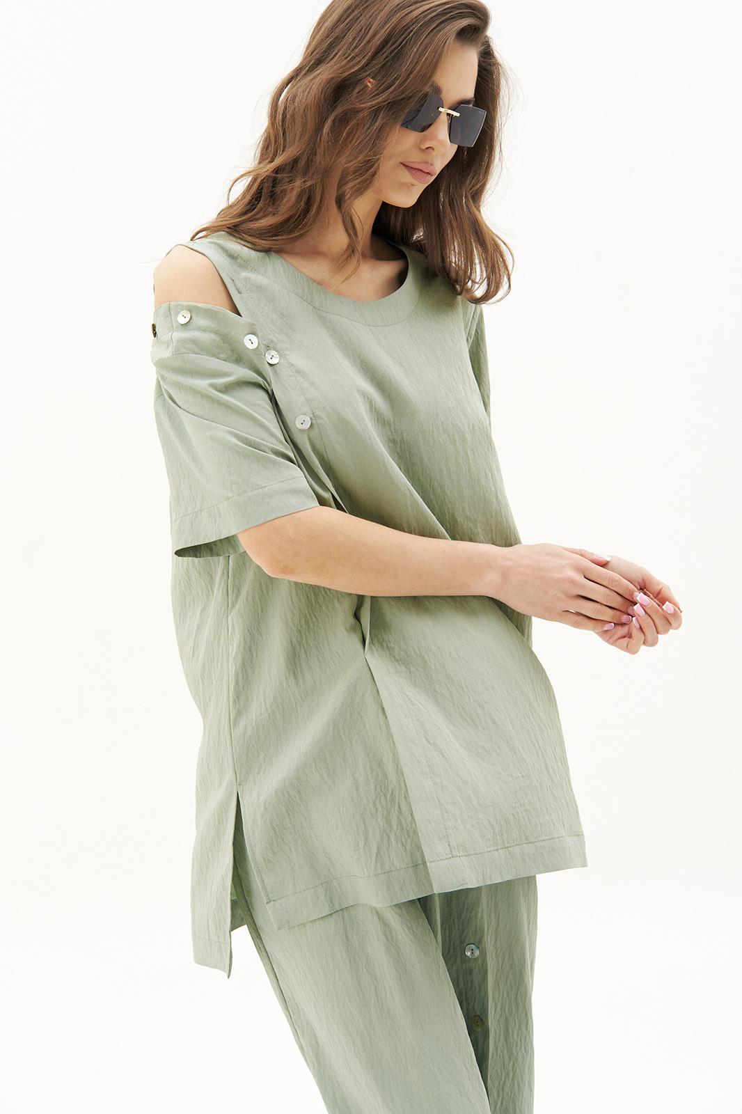 Блуза удлинённая, свободного, оригинального кроя с эффектными подрезами по полочке и спинке (образующими открытый участок в области плеча). Застёгивается на пуговицы справа, по бокам небольшие разрезы.