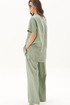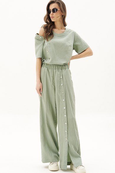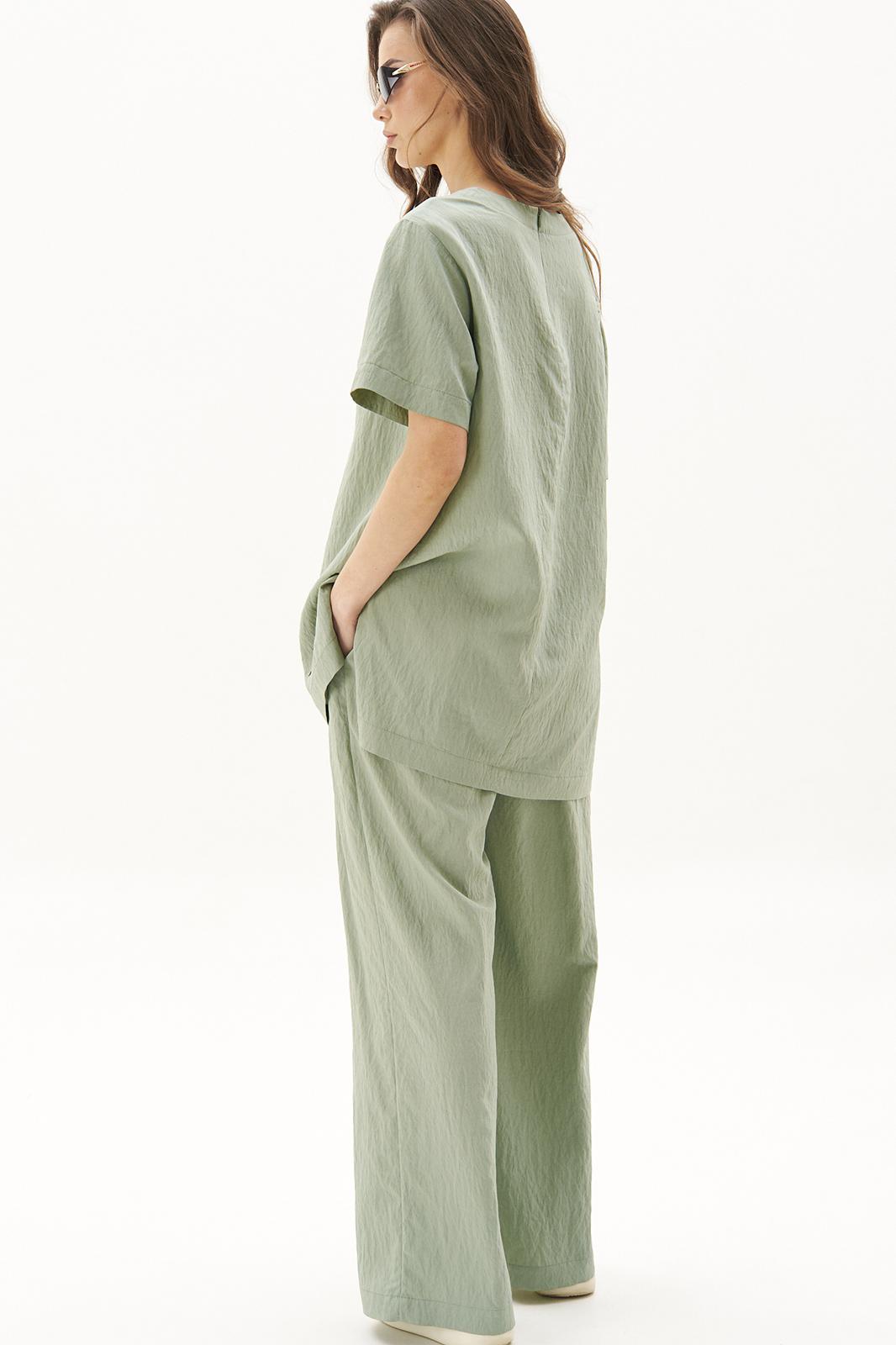 Брюки свободные, широкие, на эластичном поясе с наклонными карманами. Левая передняя половинка брюк со сквозной шлицей и пуговицами.