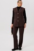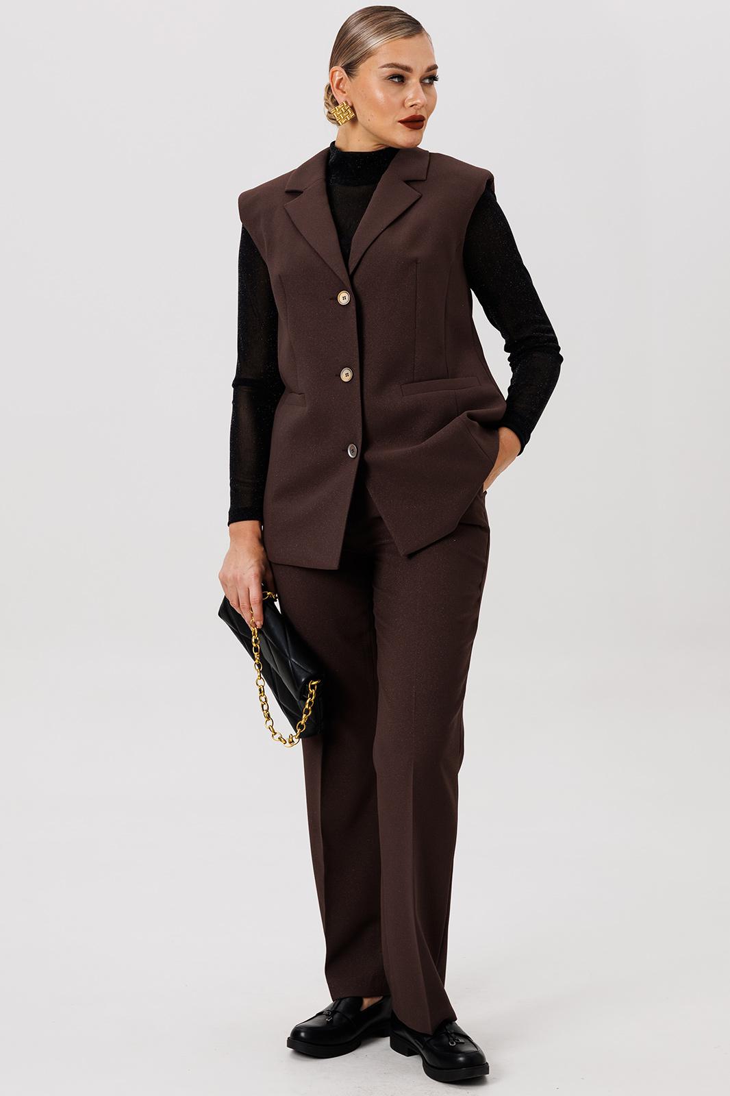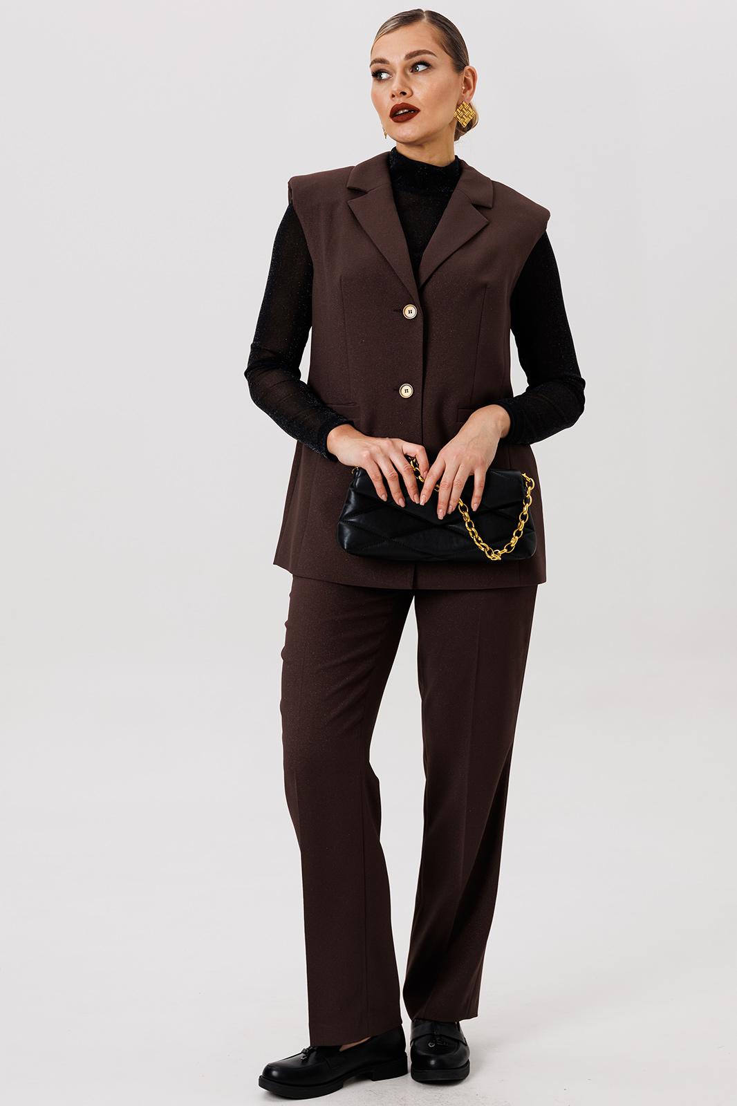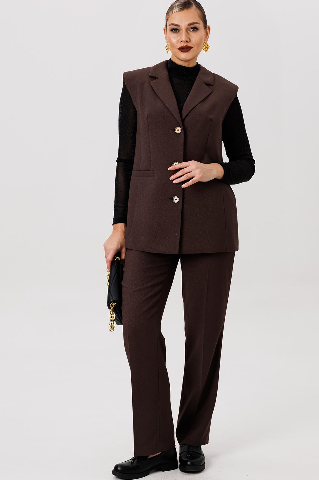 Полуприлегающий удлинённый жилет и прямые брюки отлично подчёркивают фигуру, а слегка расширенные плечи жилета придают дополнительную изюминку образу.