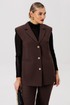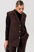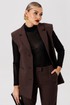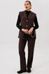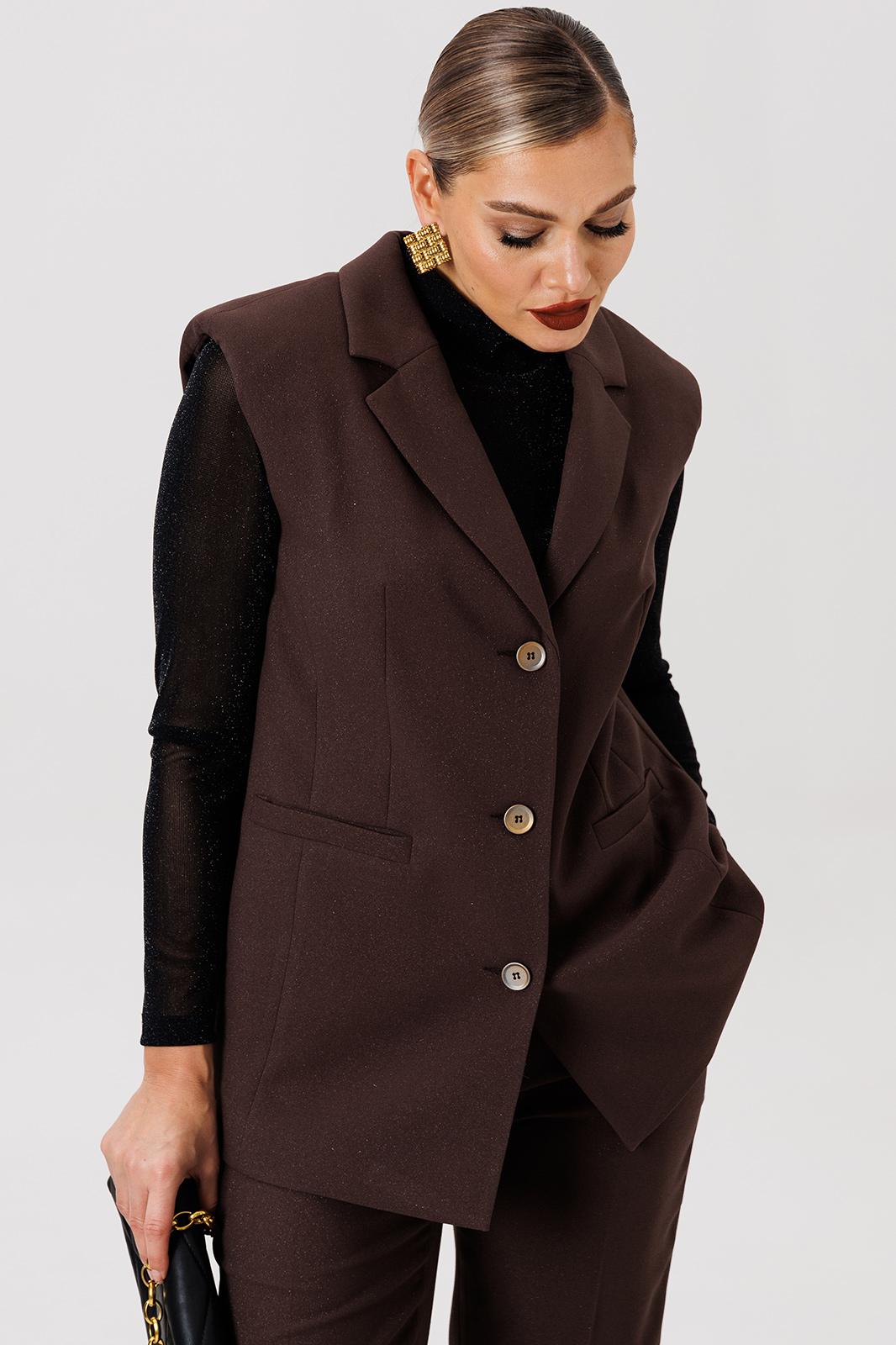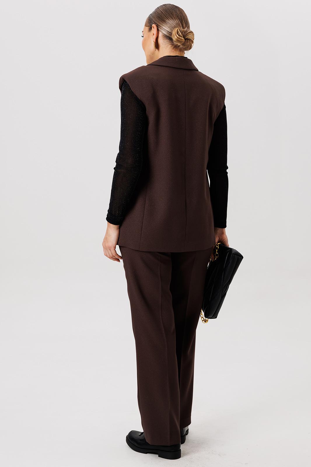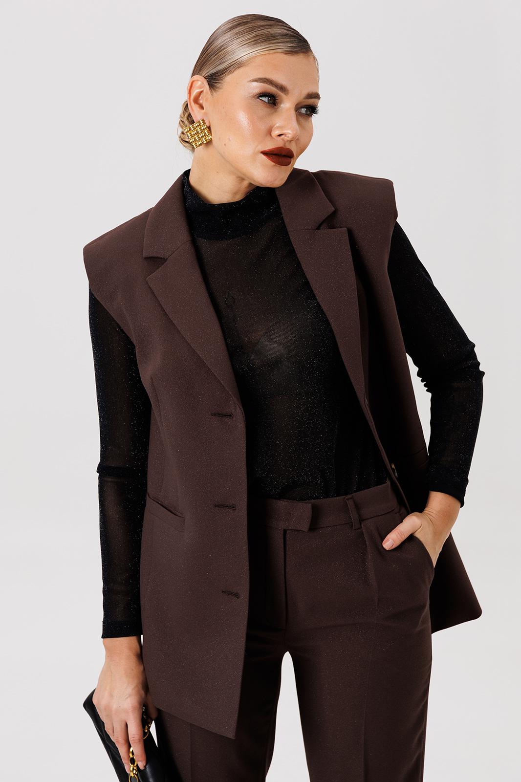 Полуприлегающий удлинённый жилет и прямые брюки отлично подчёркивают фигуру, а слегка расширенные плечи жилета придают дополнительную изюминку образу.