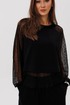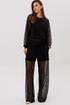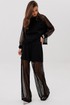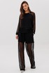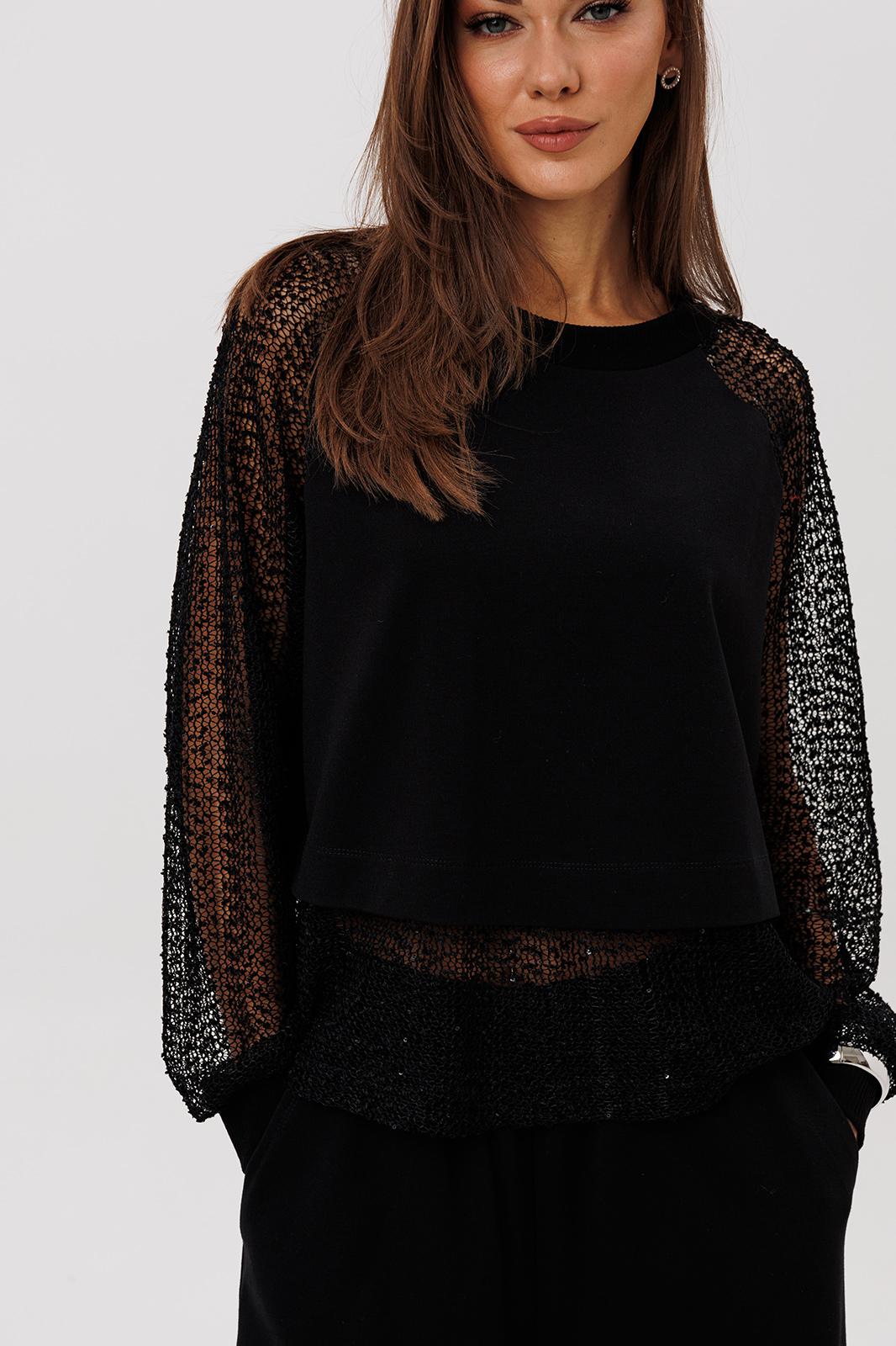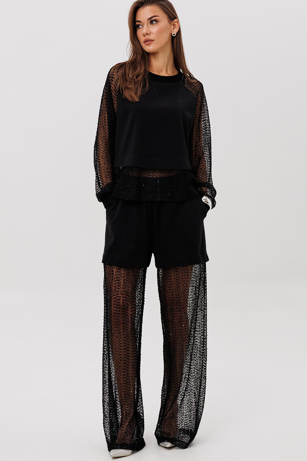 Современный брючный комплект, который создаёт эффект многослойности и лёгкого сияния. Джемпер выполнен из мягкого, комфортного вискозного полотна с нейлоном и дополнен воздушными рукавами из мерцающей сетки с россыпью микропайетки. Брюки на удобном эластичном поясе имеют прозрачную нижнюю часть в тон — подвижную, блестящую и подчёркивающую силуэт. Стильное решение для тех, кто ценит тренды и оригинальное звучание образа.