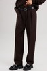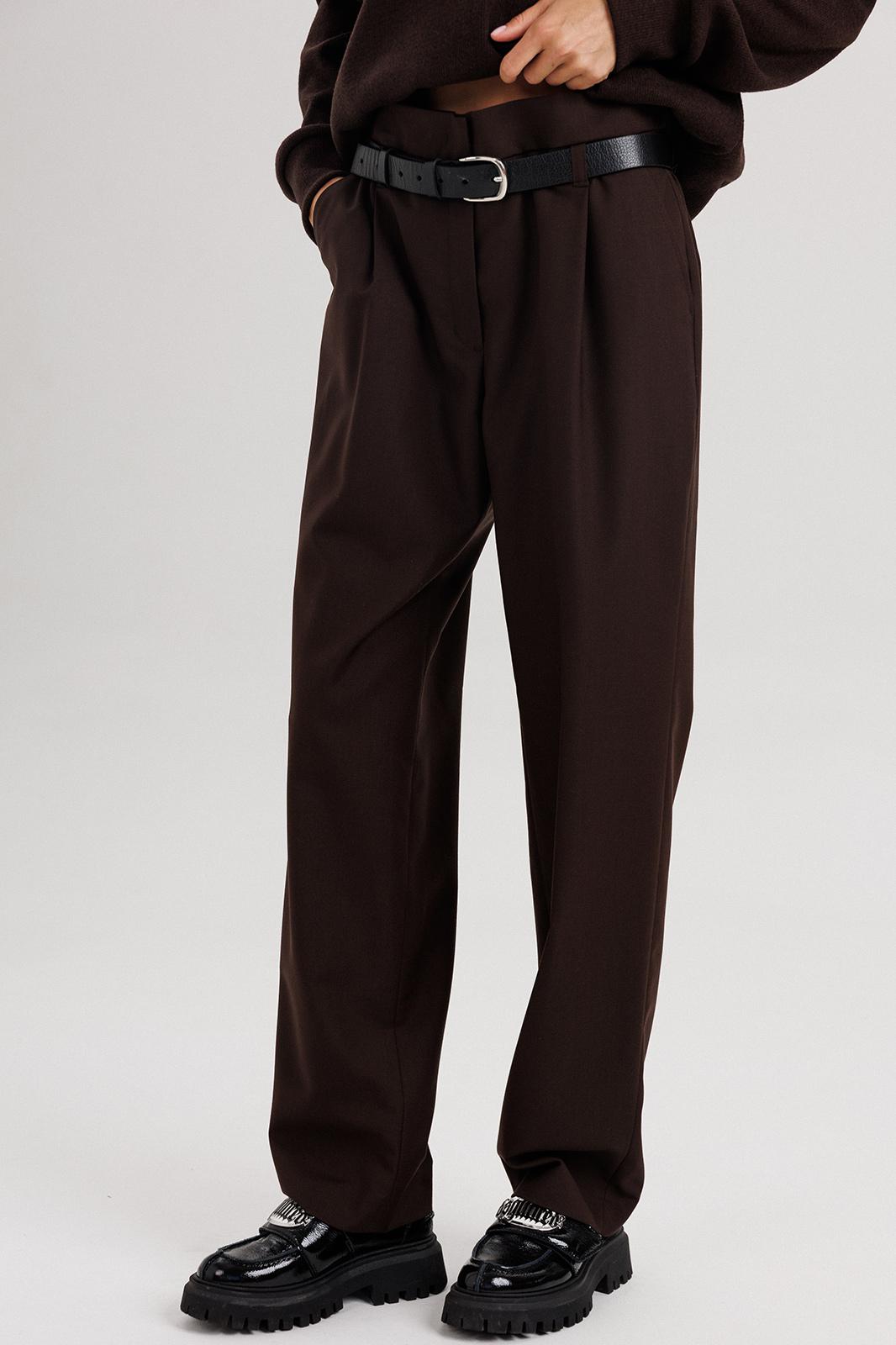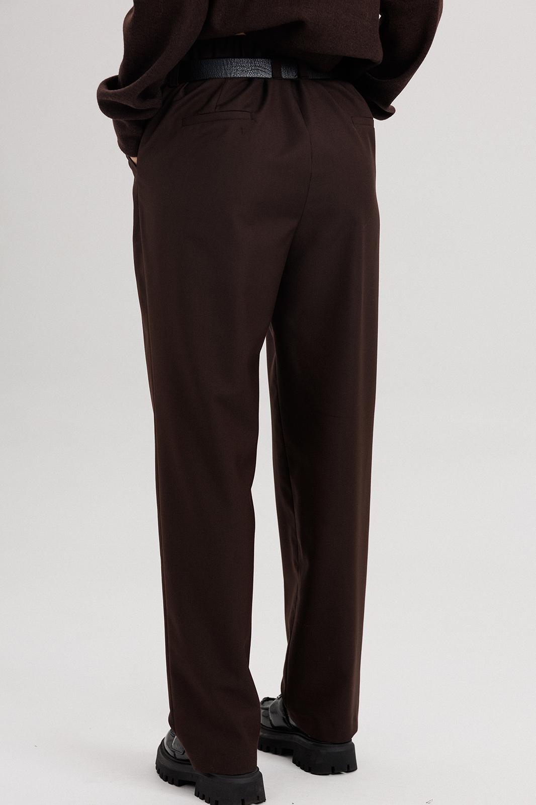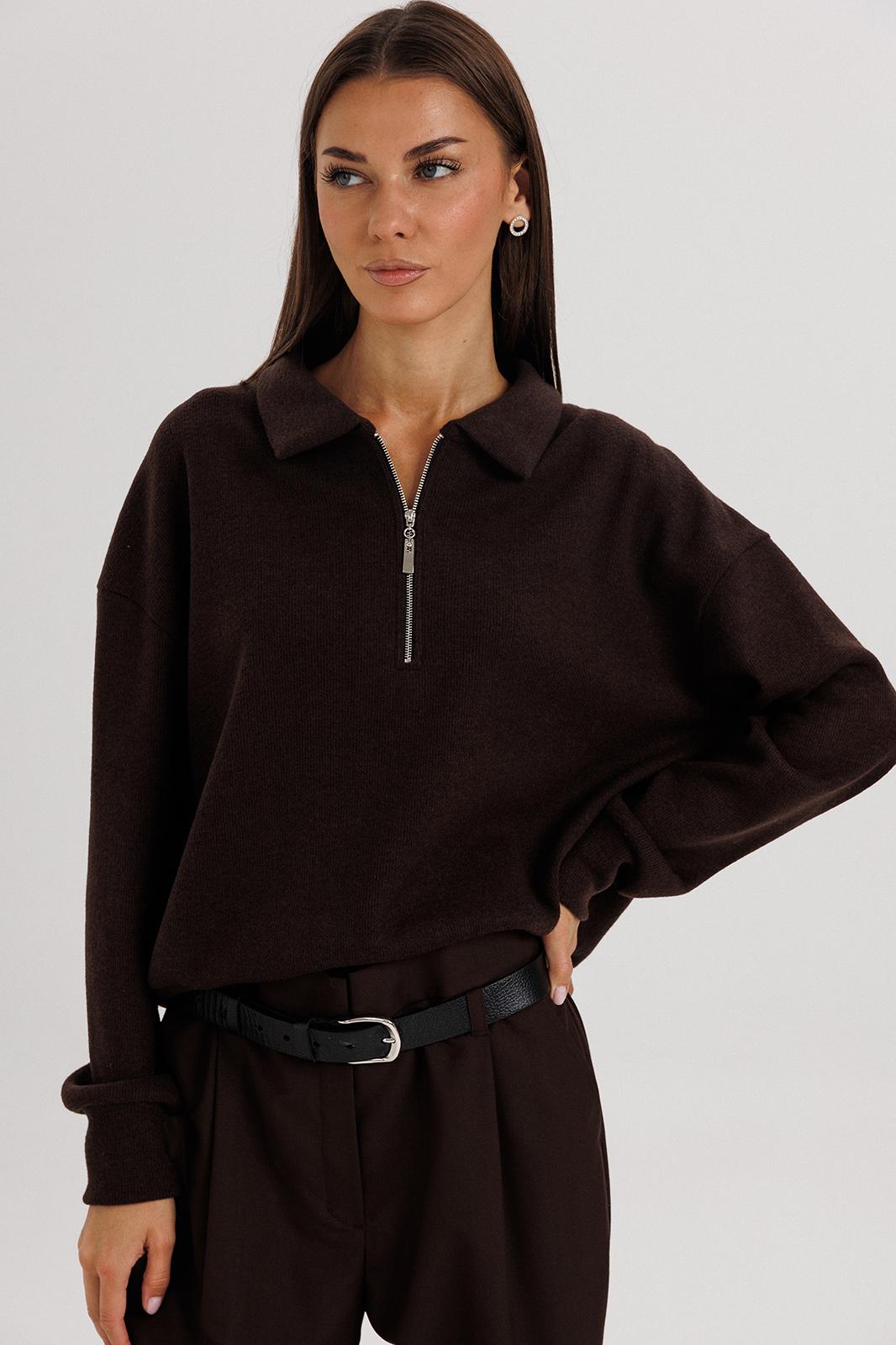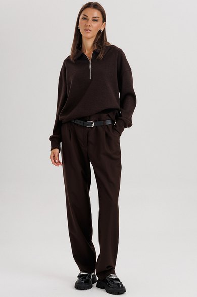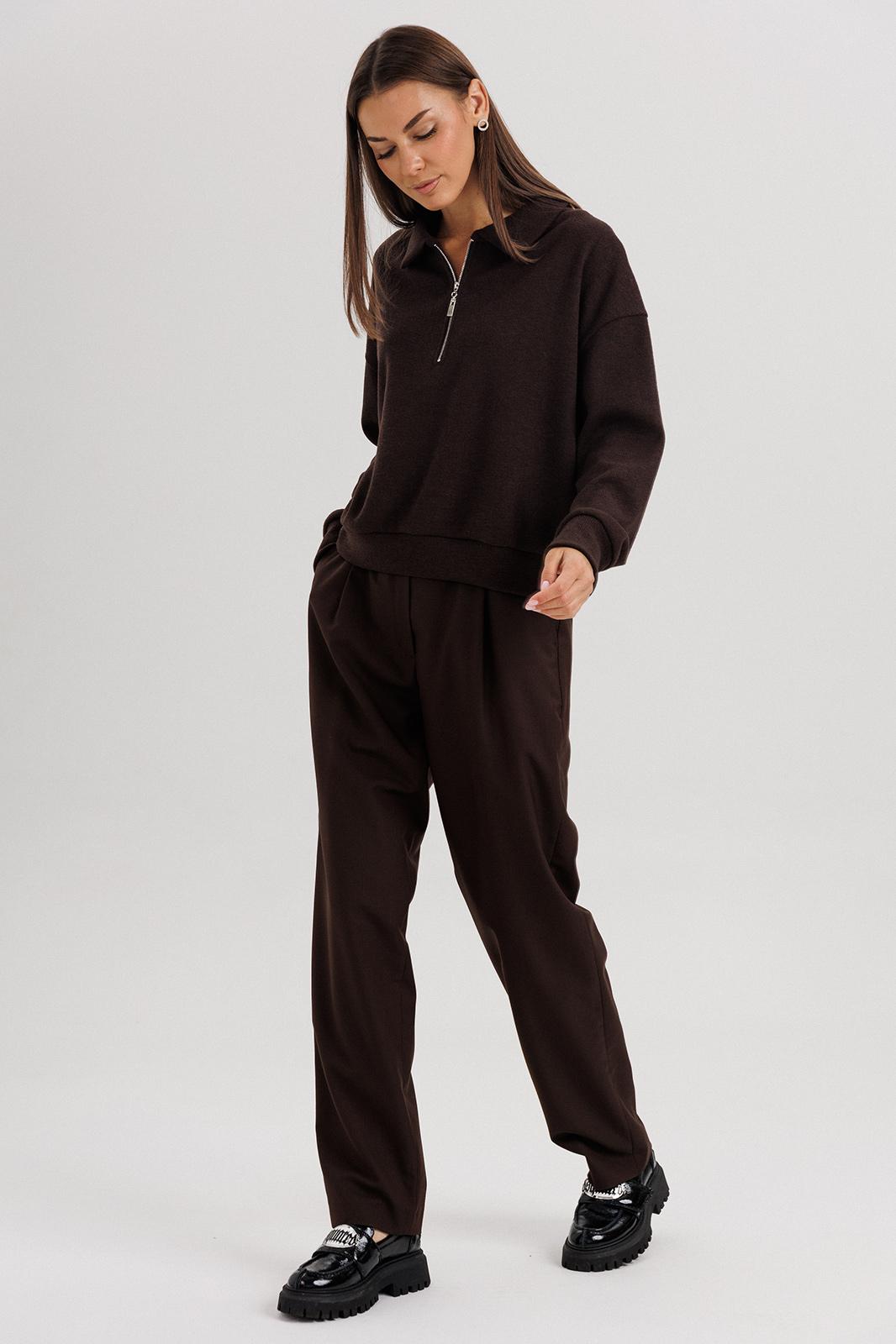 Джемпер из трикотажа. Это одна из базовых вещей осенне-зимнего сезона. Он тёплый, удобный и невероятно комфортный. К тому же, настолько универсален, что его можно стилизовать абсолютно разными способами. Свободный покрой с заниженной линией плеча, рукав рубашечного покроя на отрезной манжете, воротник классический, по центру полочки частичная застёжка-молния. По низу джемпера - отрезной пояс. Брюки классические, прямые, на отрезном поясе со шлевками, эластичном в области спинки. Передние половинки брюк с талиевыми вытачками и наклонными боковыми карманами.