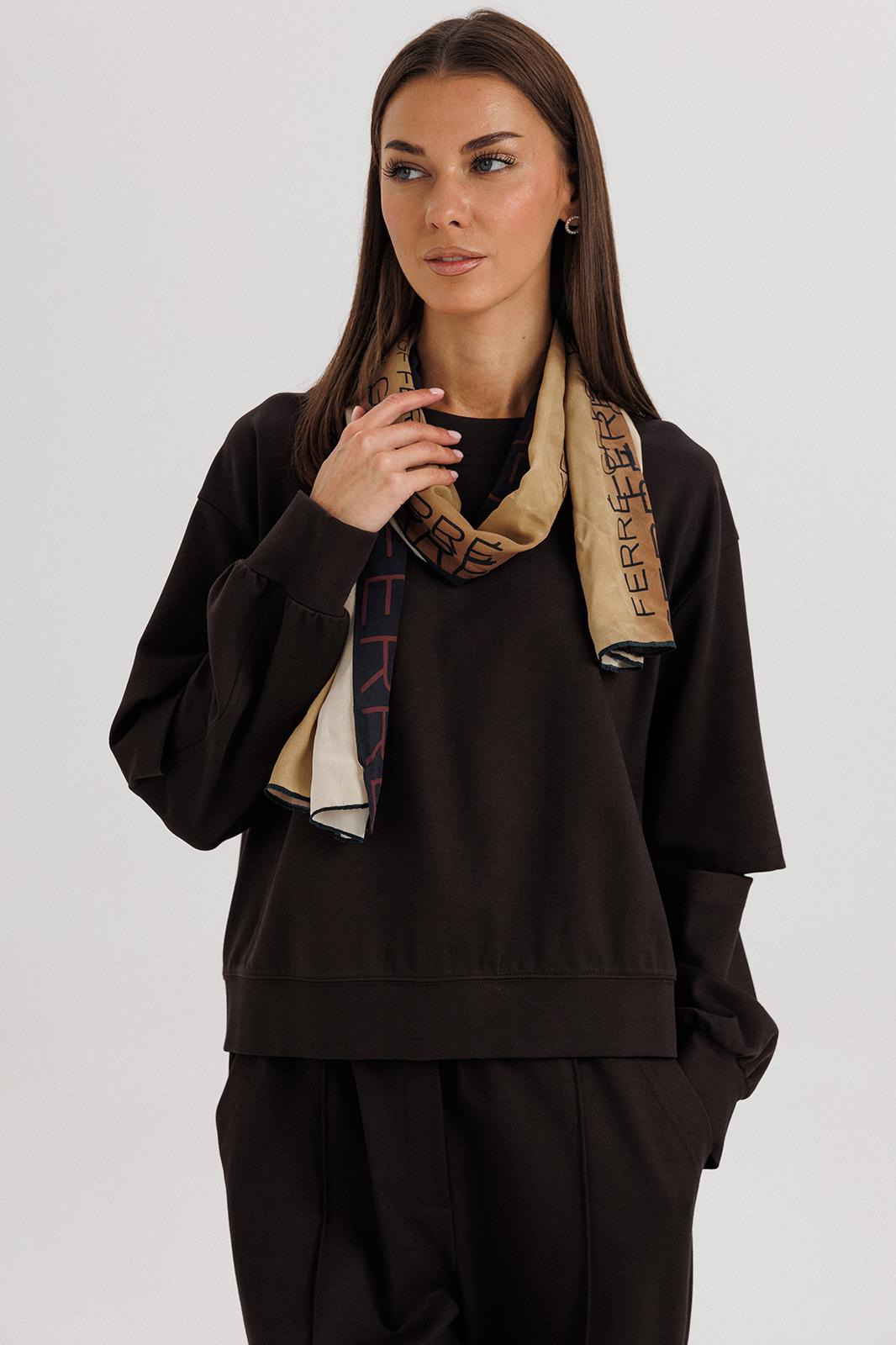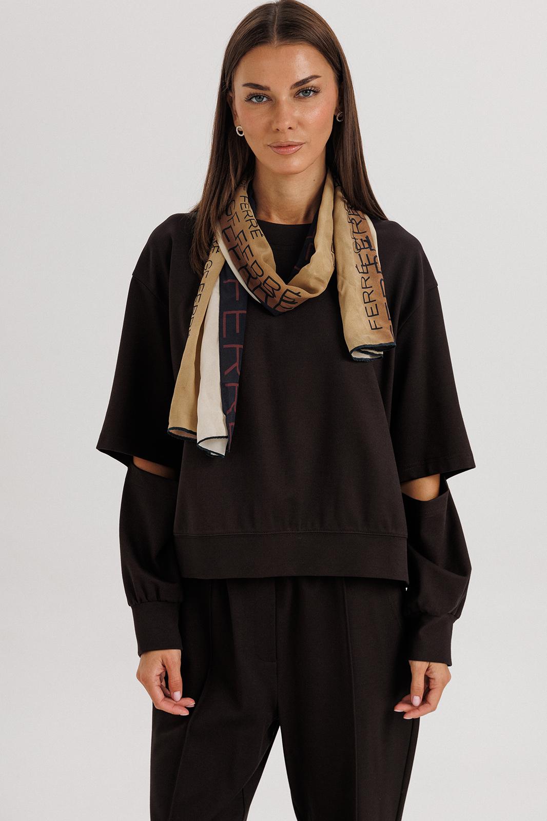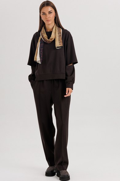 Свободный оверсайз свитшот с заниженной линией плеча, рукавом расширенным в области оката. По низу изделия и рукавов - притачной эластичный манжет. Рукав из 4-х частей с эффектным разрезом в области локтя.