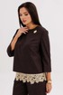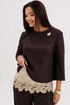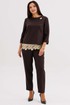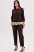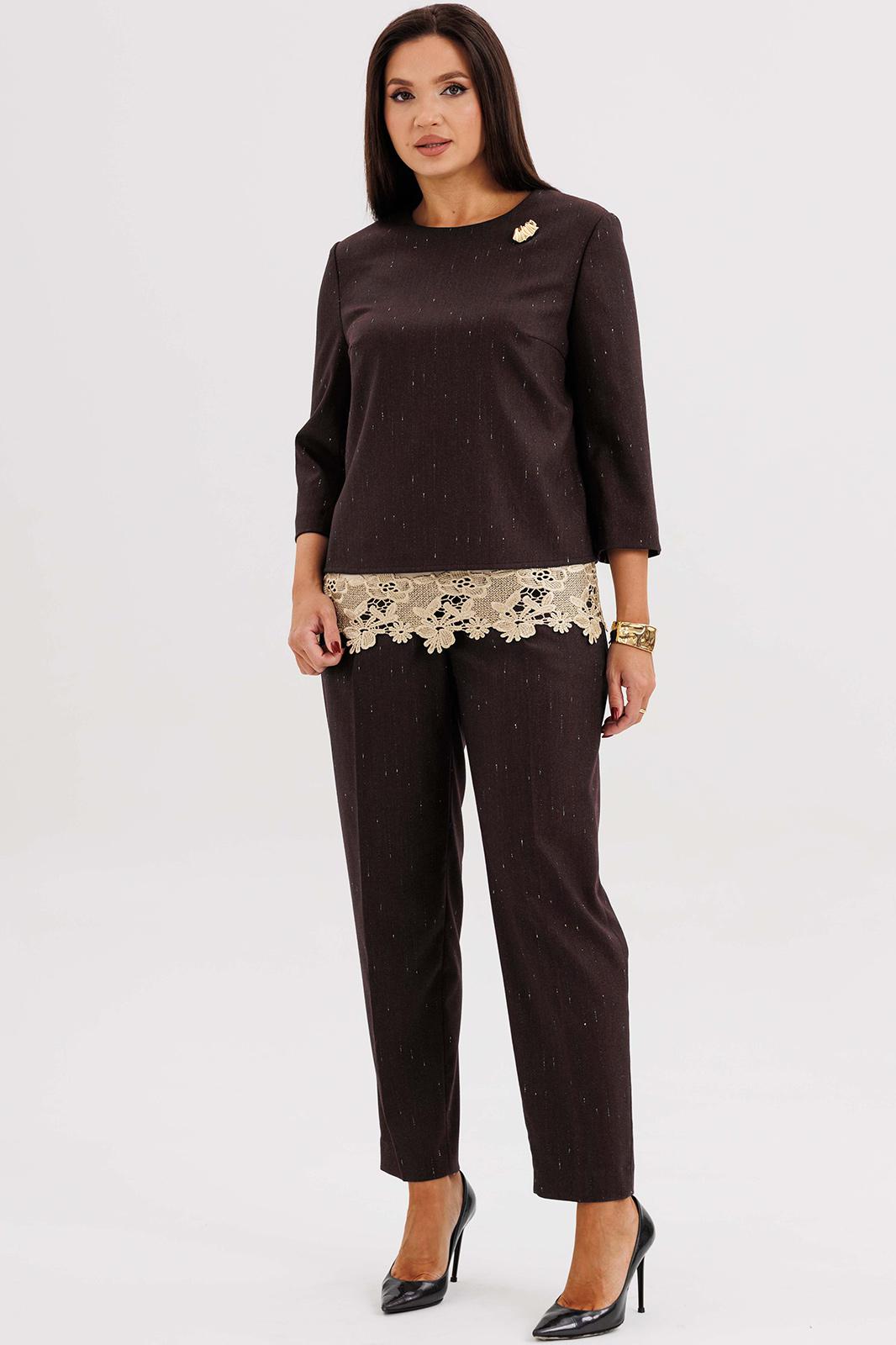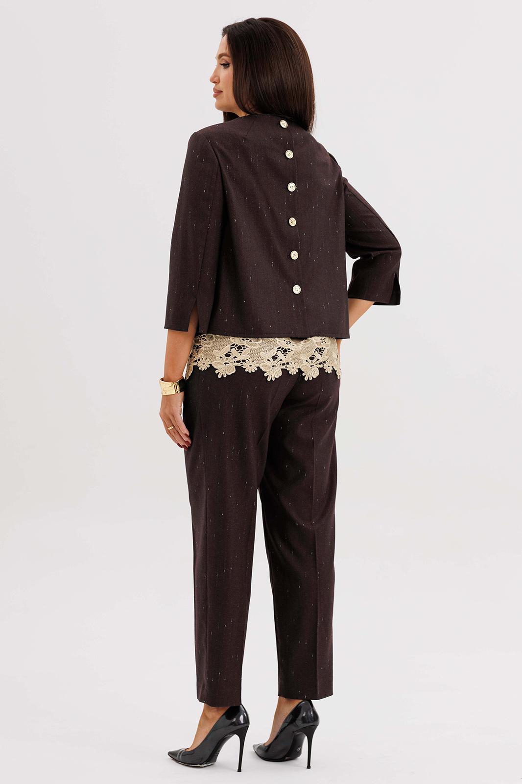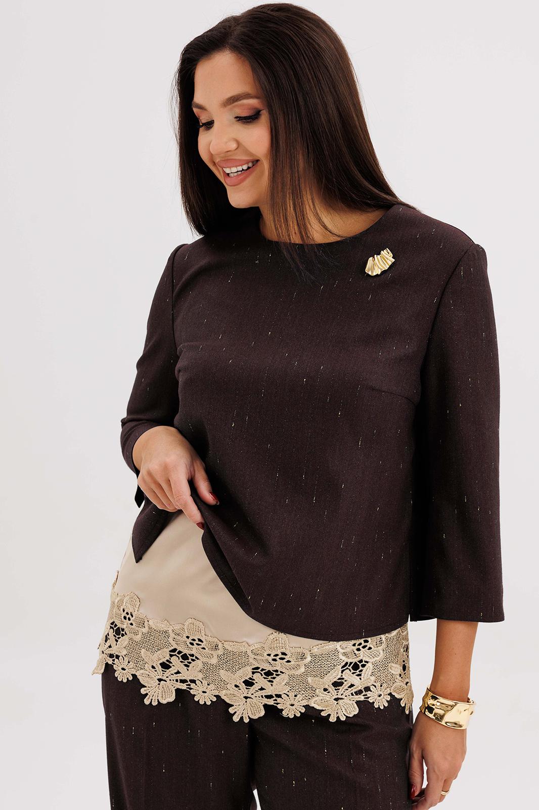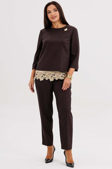 Главный акцент комплекта — нижний атласный топ с роскошной кружевной отделкой, создающий эффект многослойности и добавляющий наряду нотку романтичности. Верхняя блуза с рукавом ¾ лаконична и элегантна, а прямые брюки визуально вытягивают силуэт, делая образ стройнее и гармоничнее.