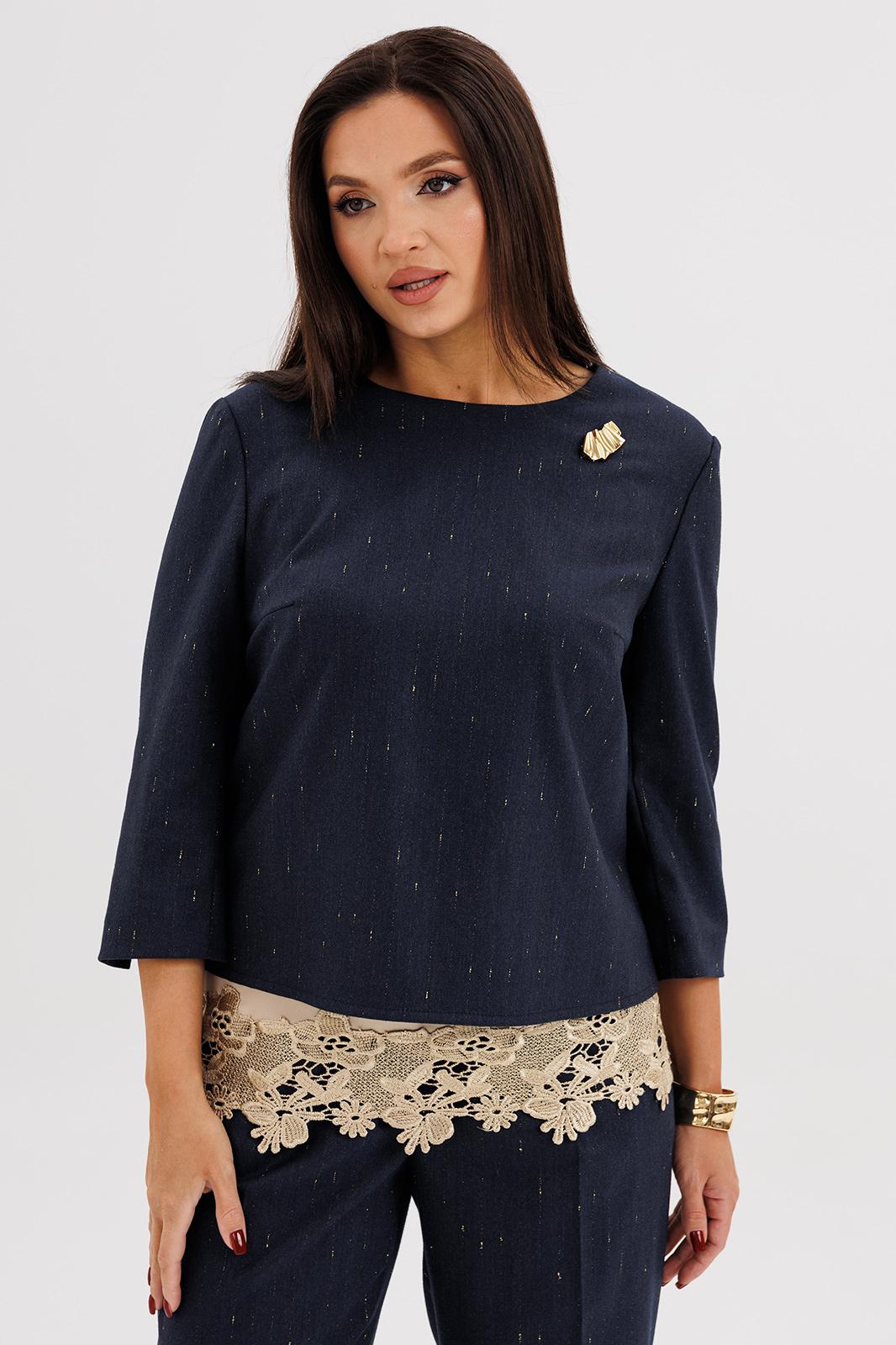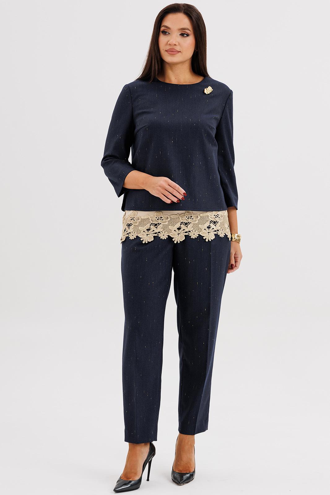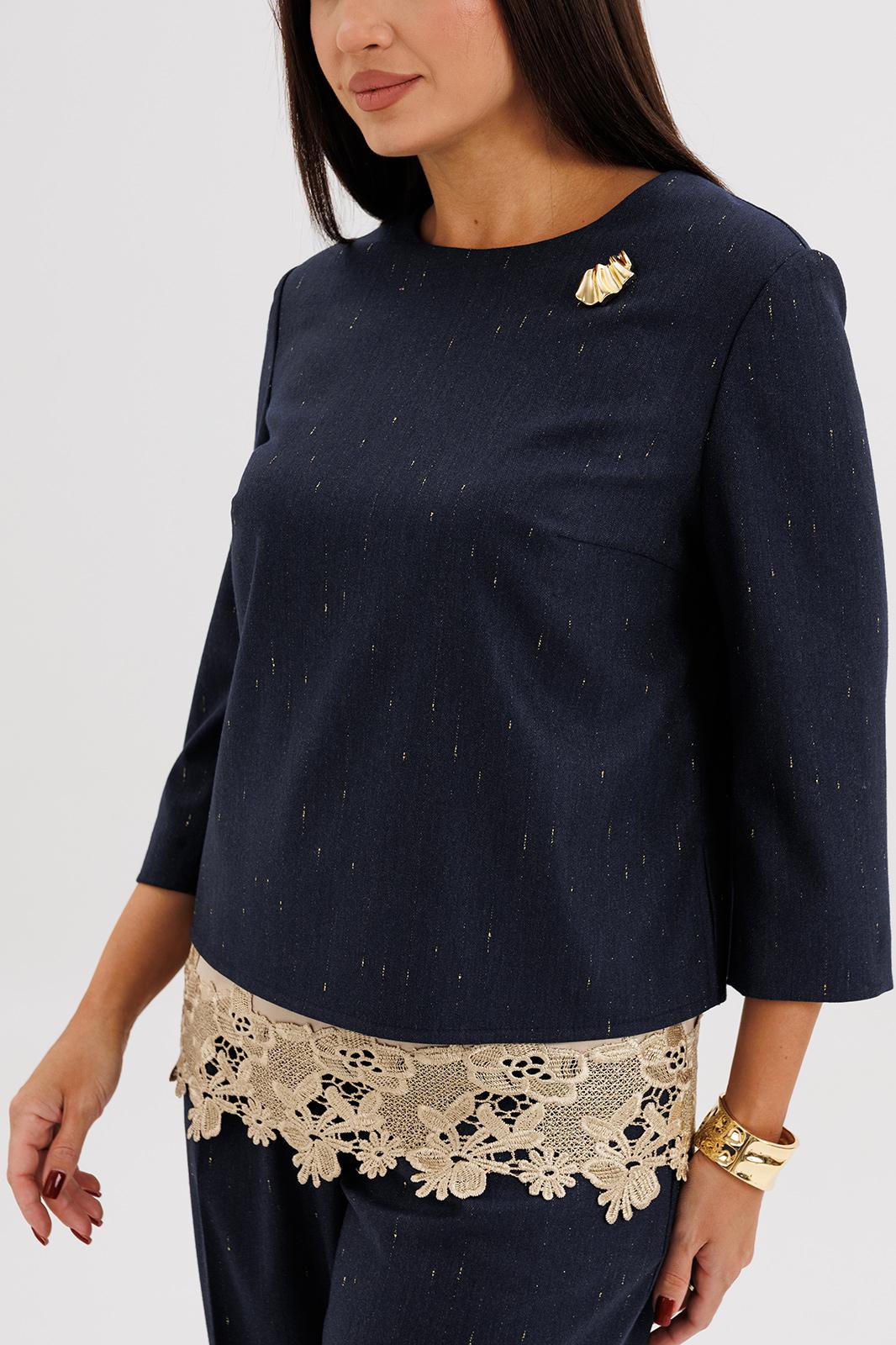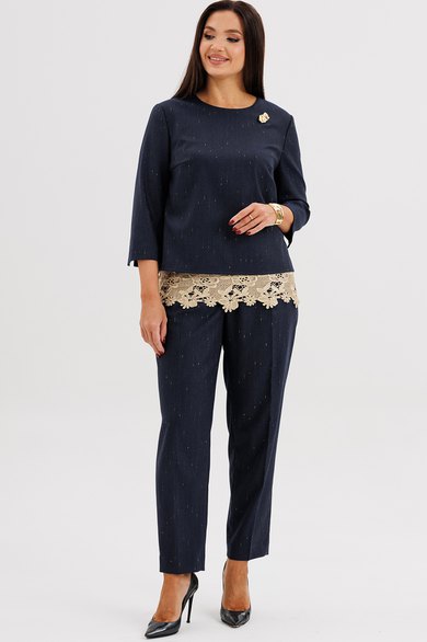 Главный акцент комплекта — нижний атласный топ с роскошной кружевной отделкой, создающий эффект многослойности и добавляющий наряду нотку романтичности. Верхняя блуза с рукавом ¾ лаконична и элегантна, а прямые брюки визуально вытягивают силуэт, делая образ стройнее и гармоничнее.