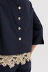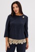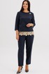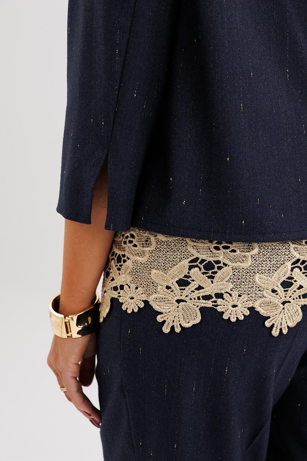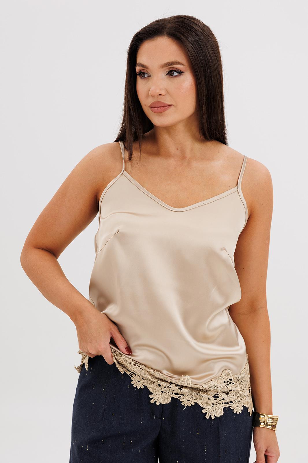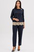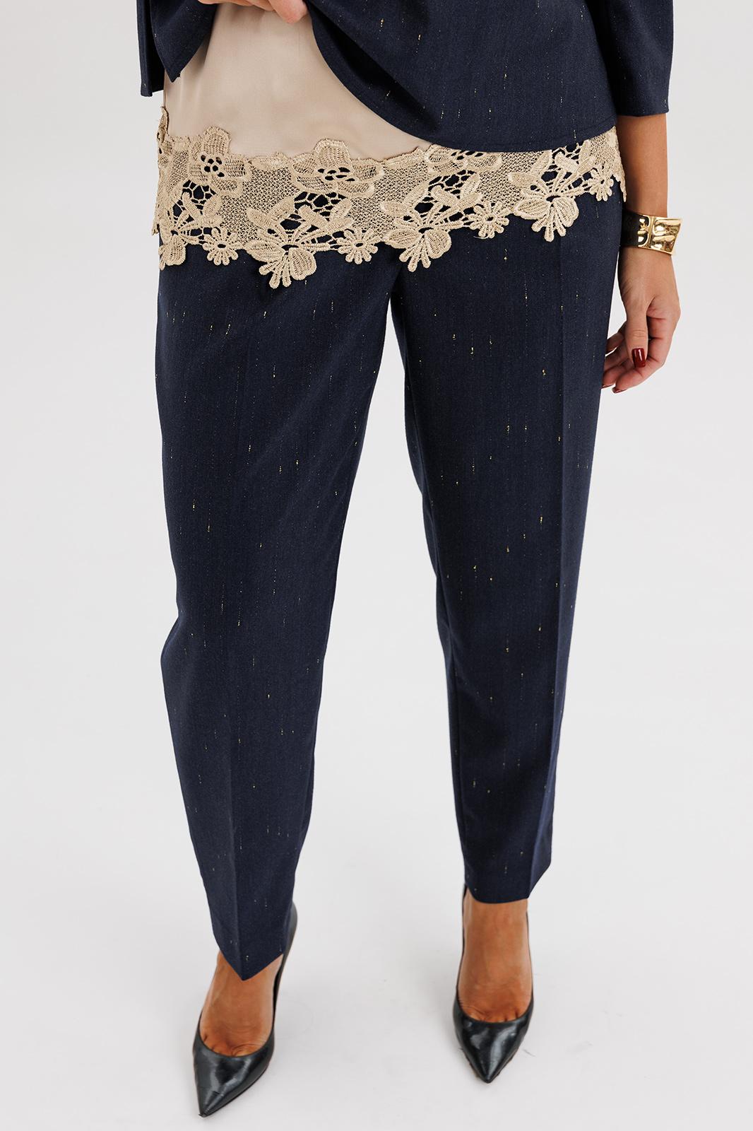 Главный акцент комплекта — нижний атласный топ с роскошной кружевной отделкой, создающий эффект многослойности и добавляющий наряду нотку романтичности. Верхняя блуза с рукавом ¾ лаконична и элегантна, а прямые брюки визуально вытягивают силуэт, делая образ стройнее и гармоничнее.