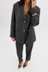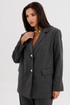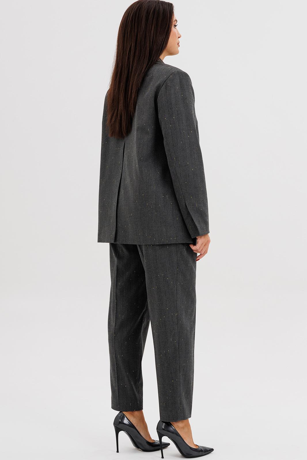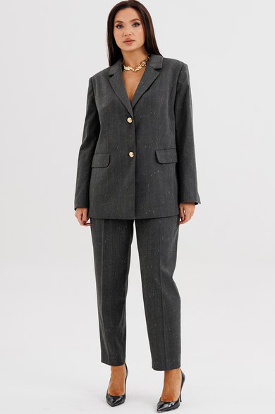 Жакет свободного расширенного силуэта, втачного покроя с центральной застёжкой и классическим английским воротником. Полочка с отрезным бочком, нагрудной вытачкой и прорезным карманом с клапаном. Спинка с центральным швом, шлицей и отрезным бочком. Рукав двухшовный с отлетной шлицей.