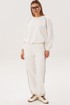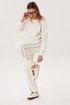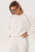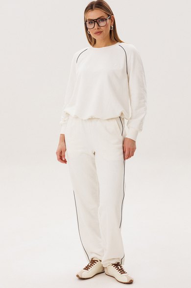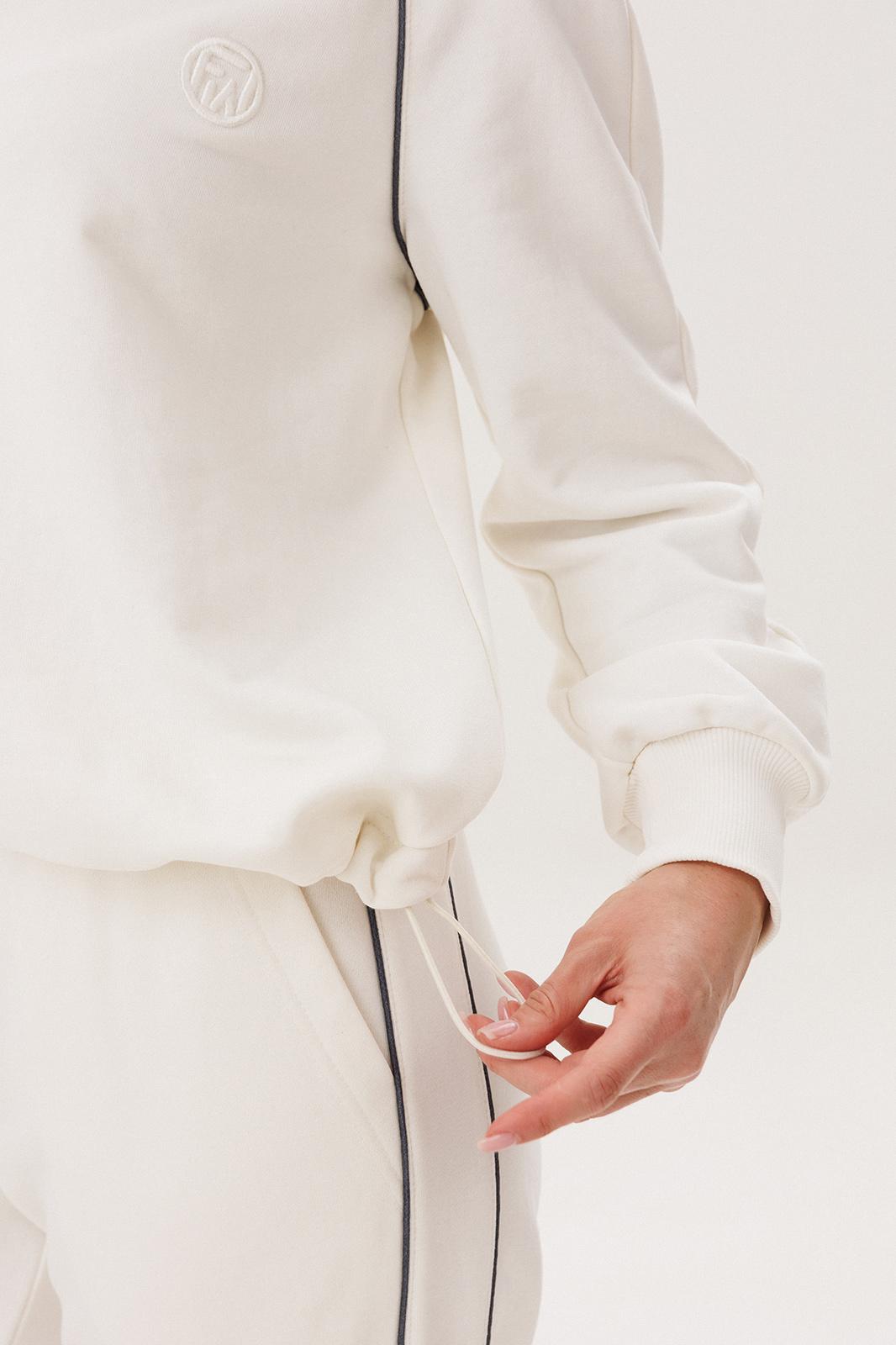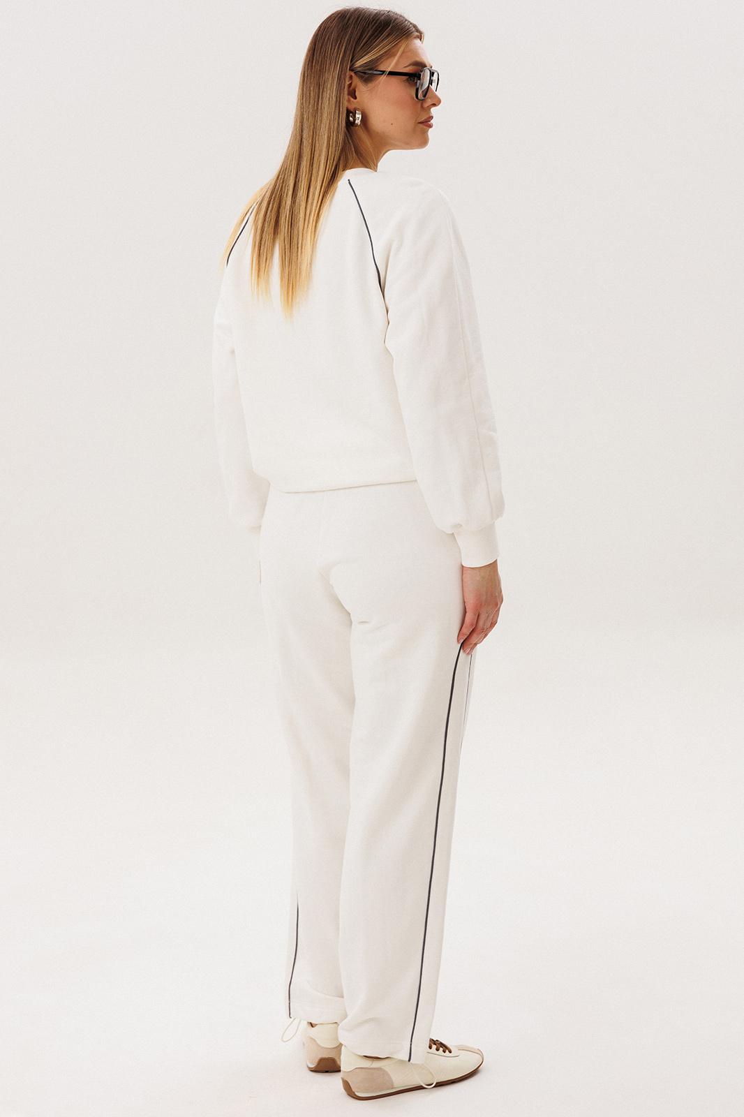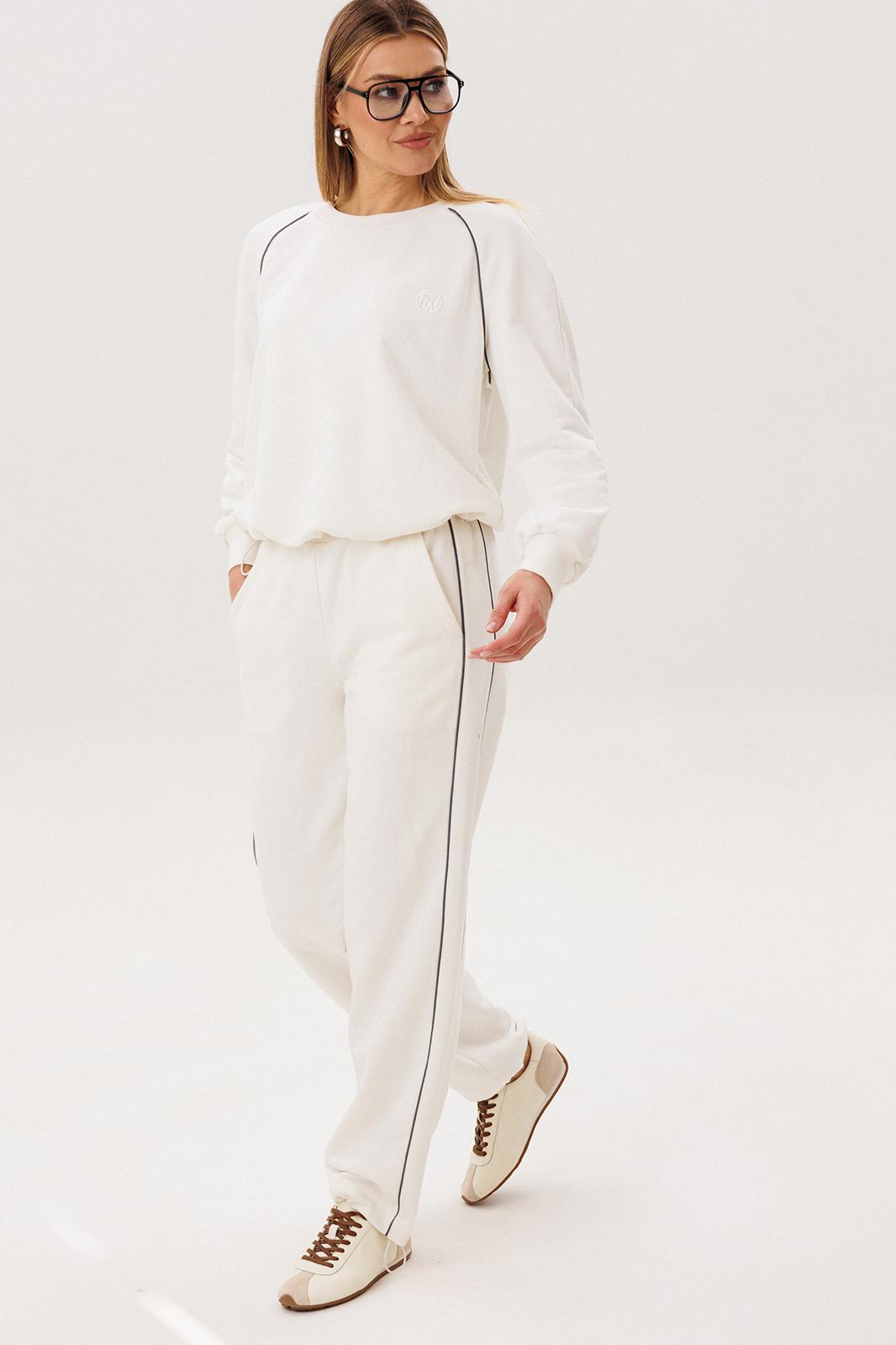 Спортивный костюм не предназначенный для занятия спортом, эдакая разновидность спортивной одежды в современной моде, выражающая характерную для спорта эстетику с помощью динамического кроя и отделки. Свободный свитшот покроя реглан с отделочными контрастными кантами по линии притачивая рукава и брендовой вышивкой на полочке.