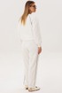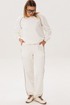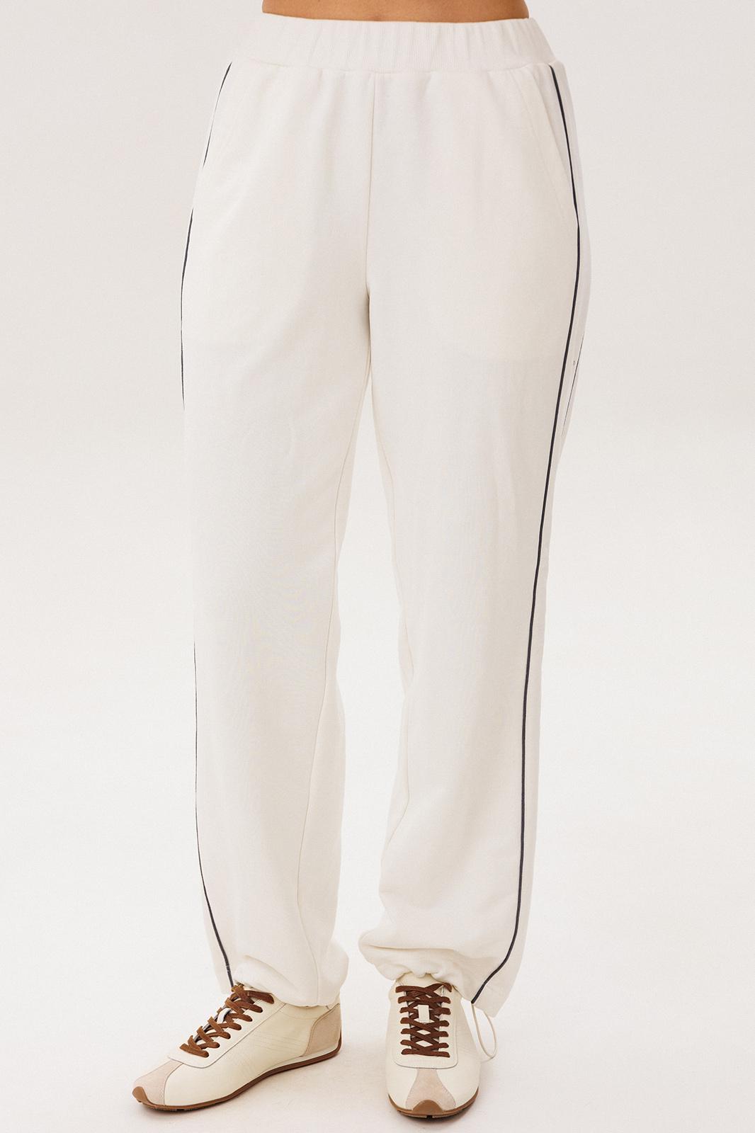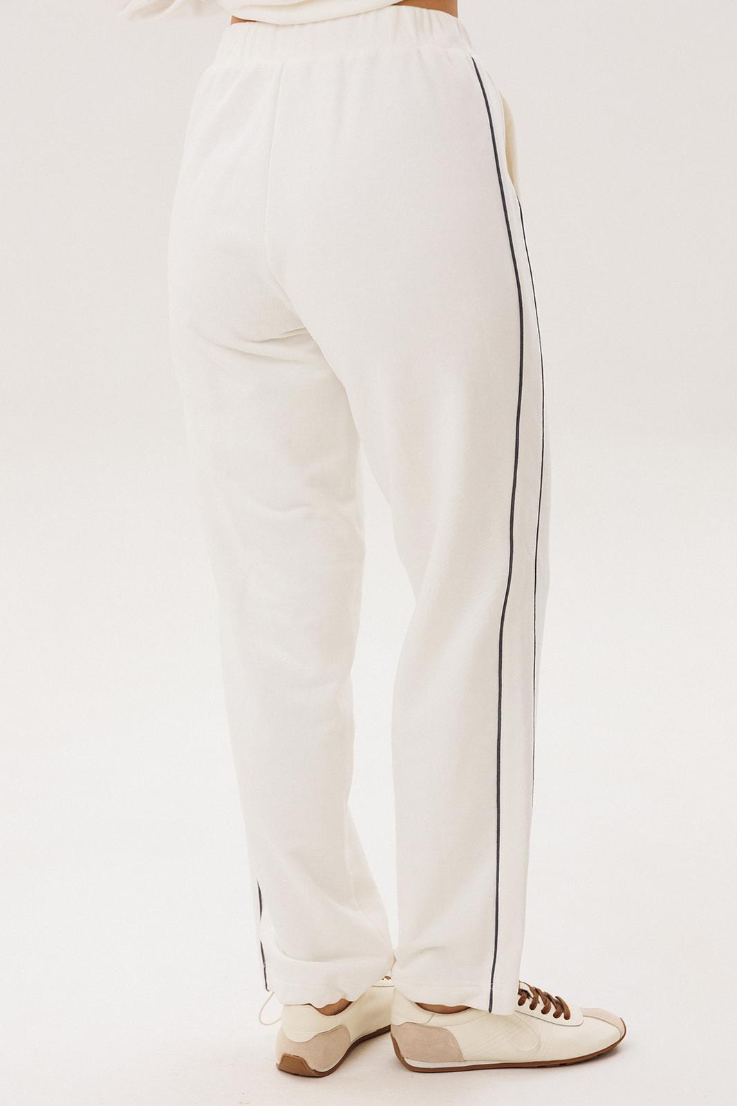 Брюки свободные, расслабленные, на эластичном поясе, с отрезным лампасом, декорированным отделочным кантом. По низу брюк-кулиса с эластичной тесьмой и фиксатором эффектно меняющая стиль брюк с прямого в алладины.