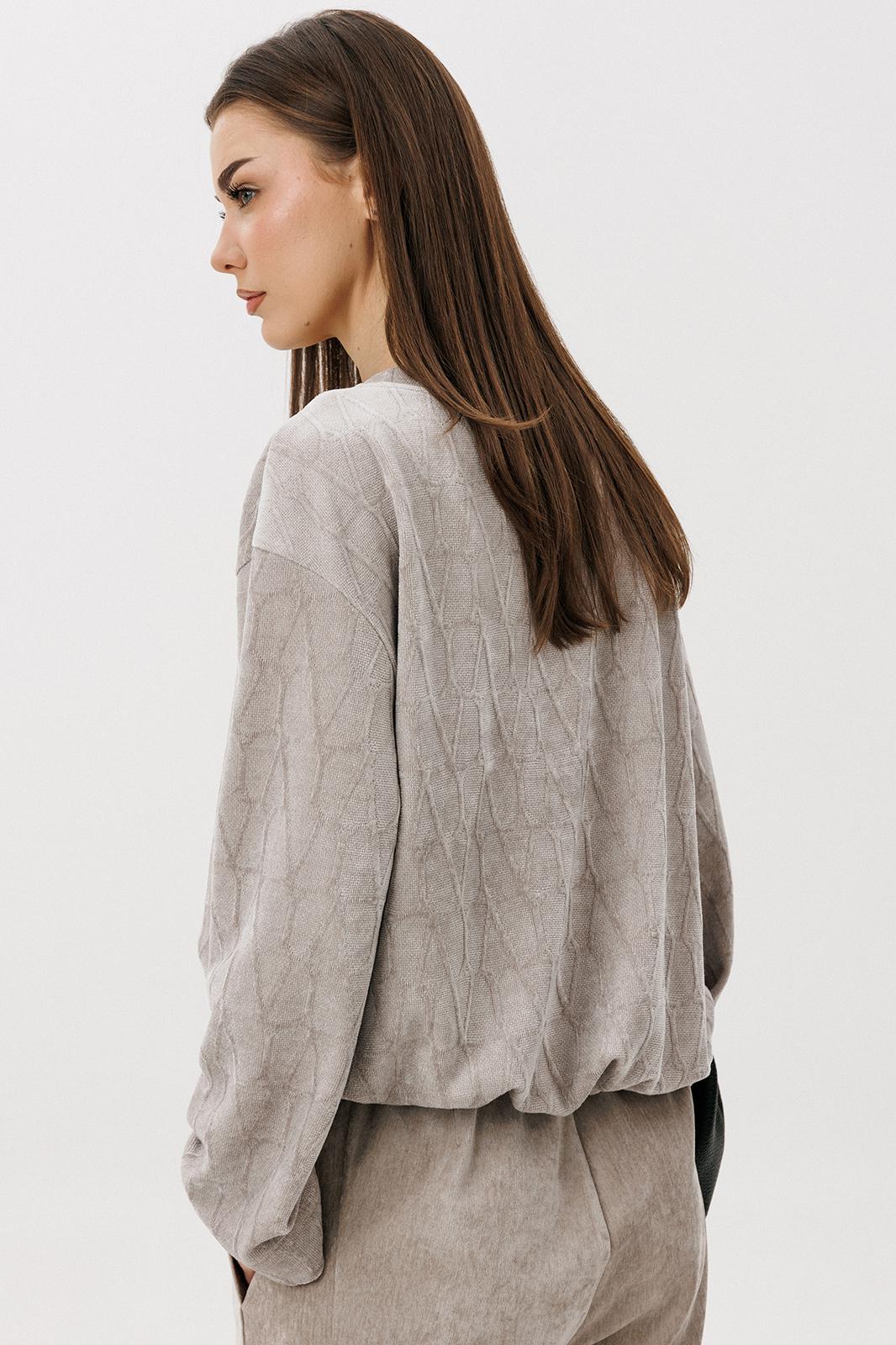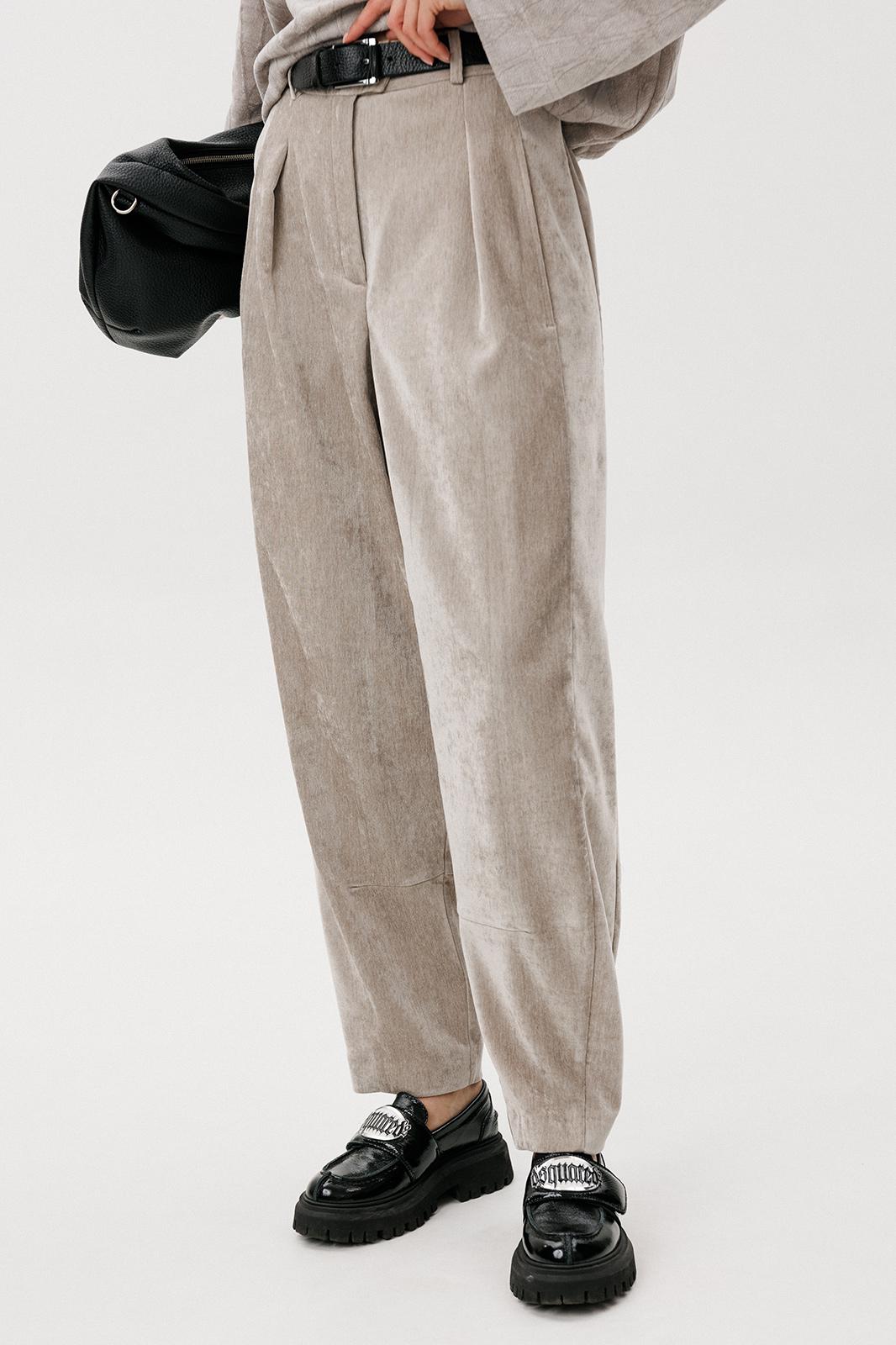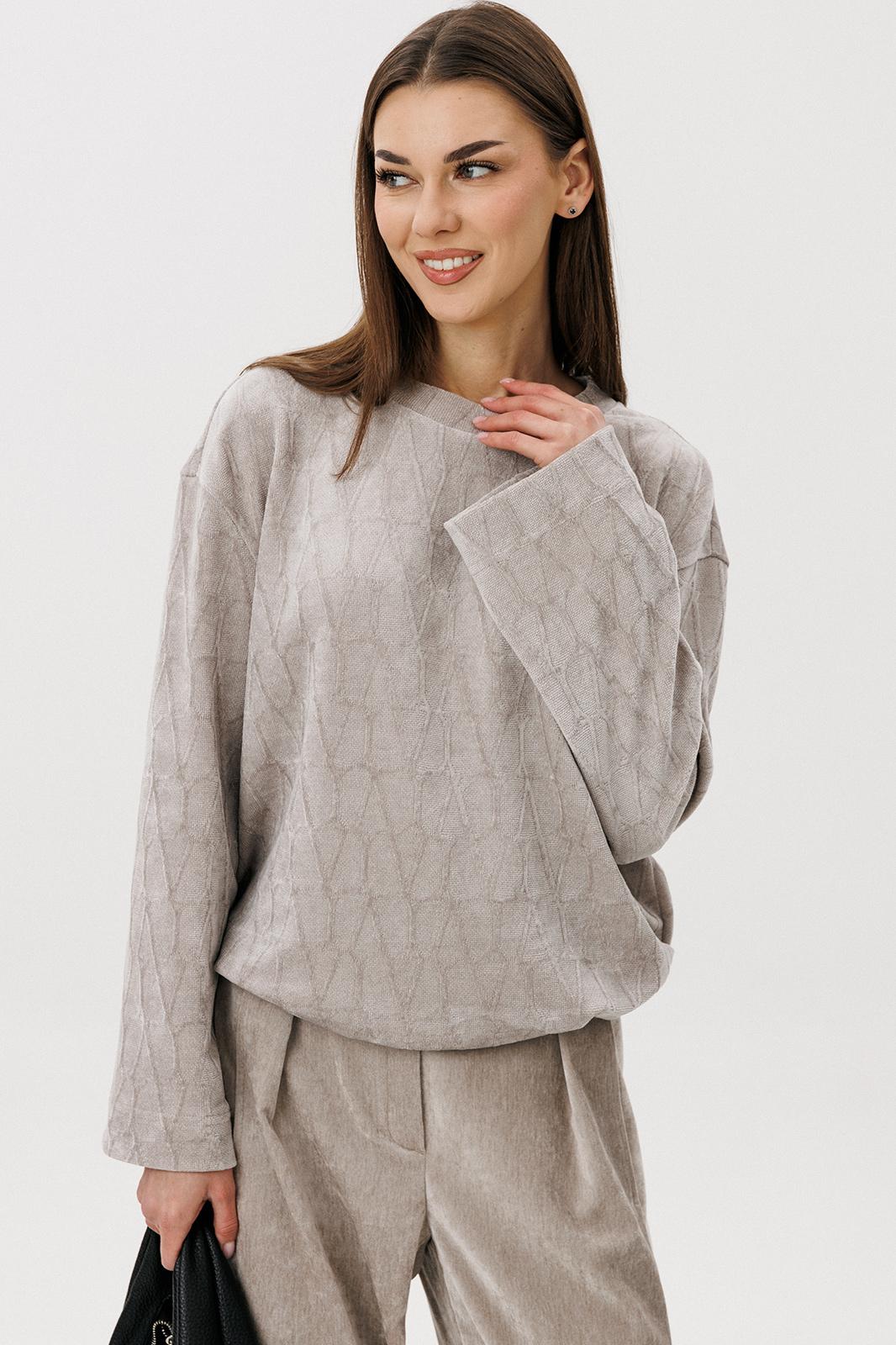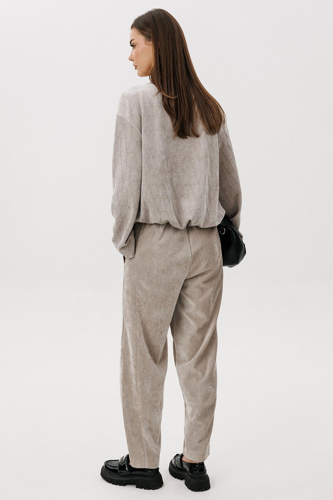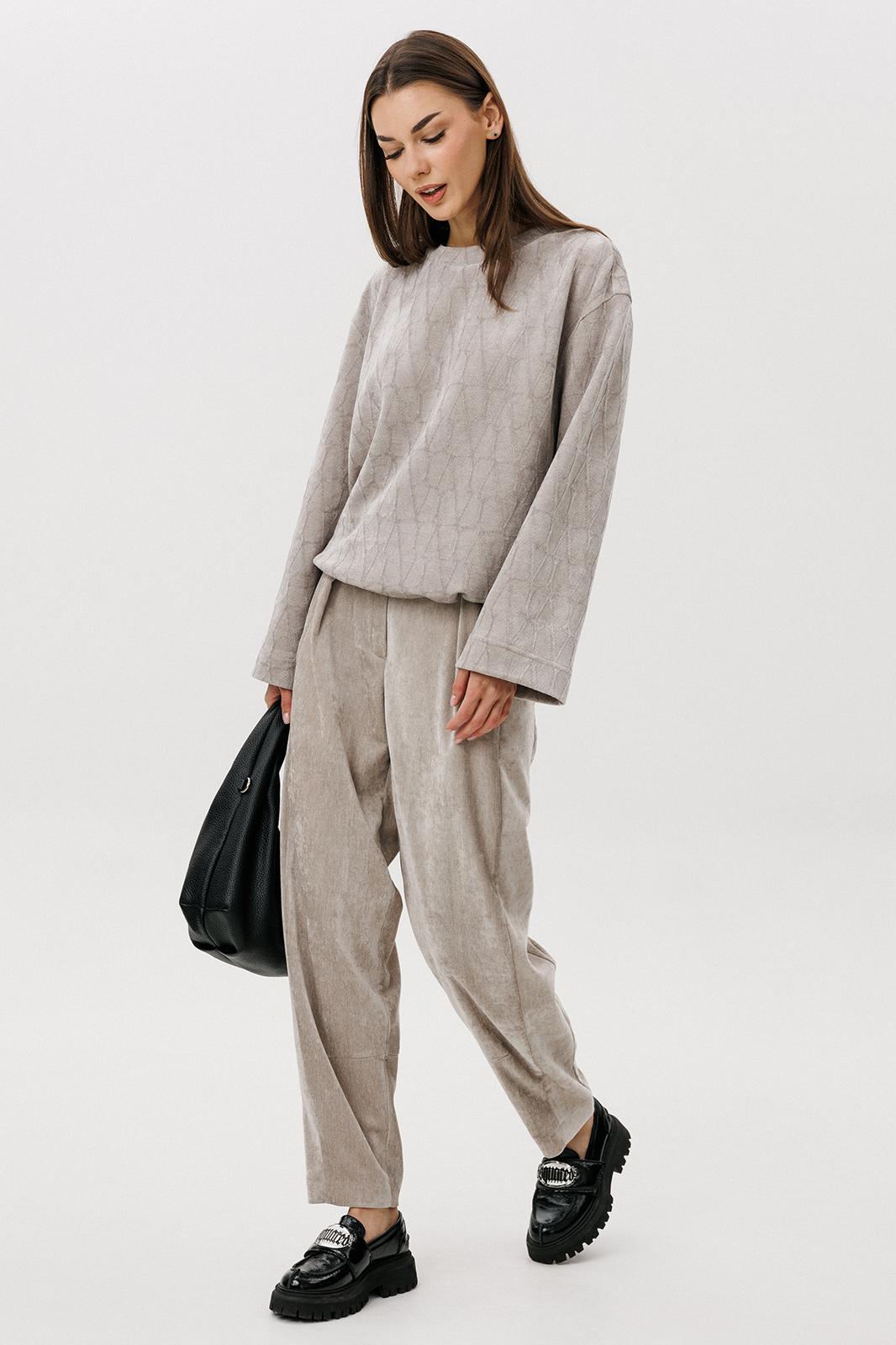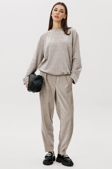 Свободный джемпер расширенного силуэта втачного покроя на заниженной линии плеча. Рукав расширенный в области оката. По низу джемпера шнур- резинка с фиксаторами. Брюки-баррел на притачном поясе со шлёвками (эластичном в области спинки), с наклонными карманами , мягкими складками защипами по верху брюк.
