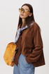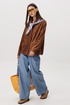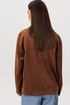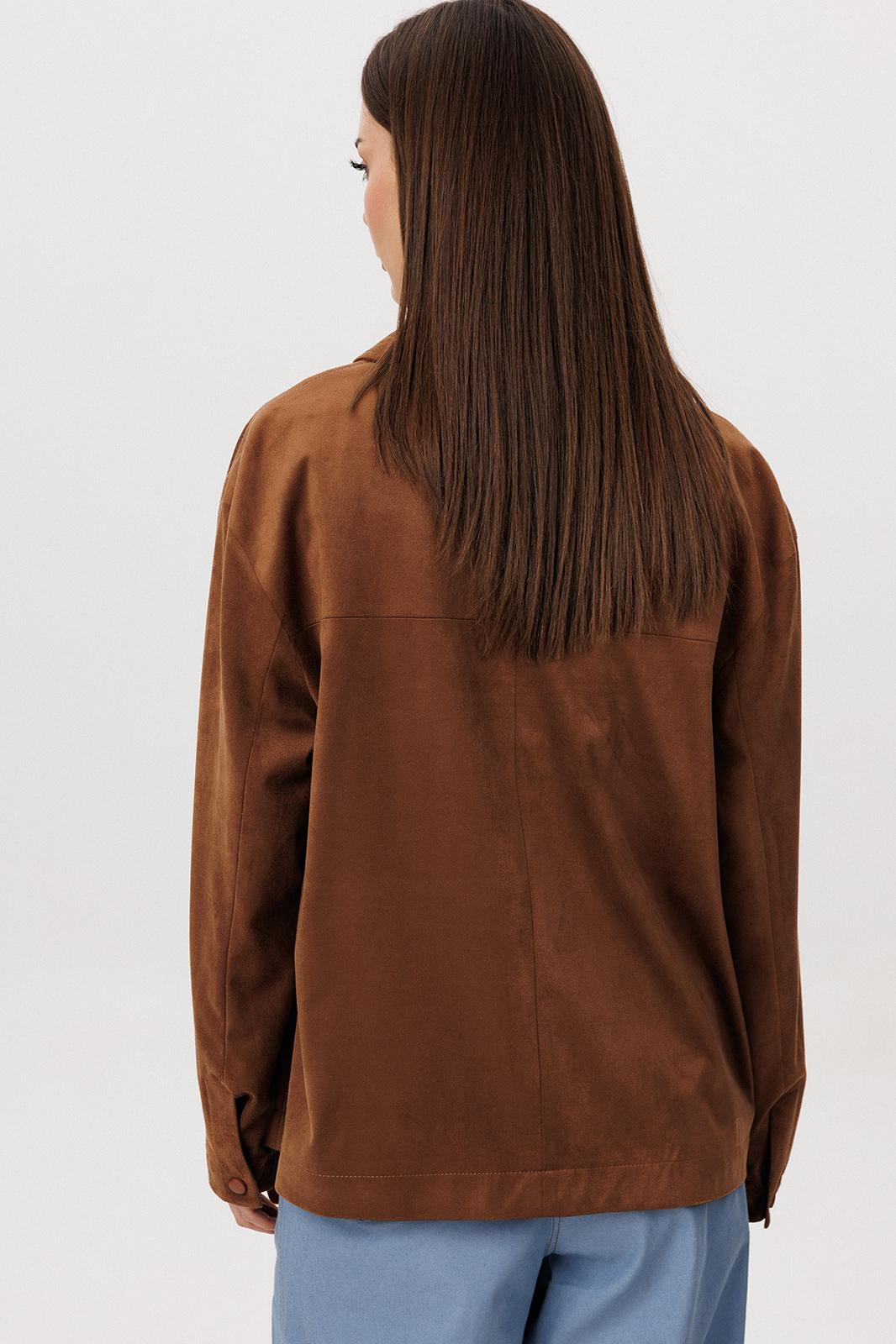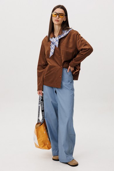 Рубашка: Свободный прямой силуэт, комфортная посадка. Материал под замшу в насыщенном коричневом оттенке. Классический отложной воротник. Застежка на кнопки. Практичные боковые карманы.