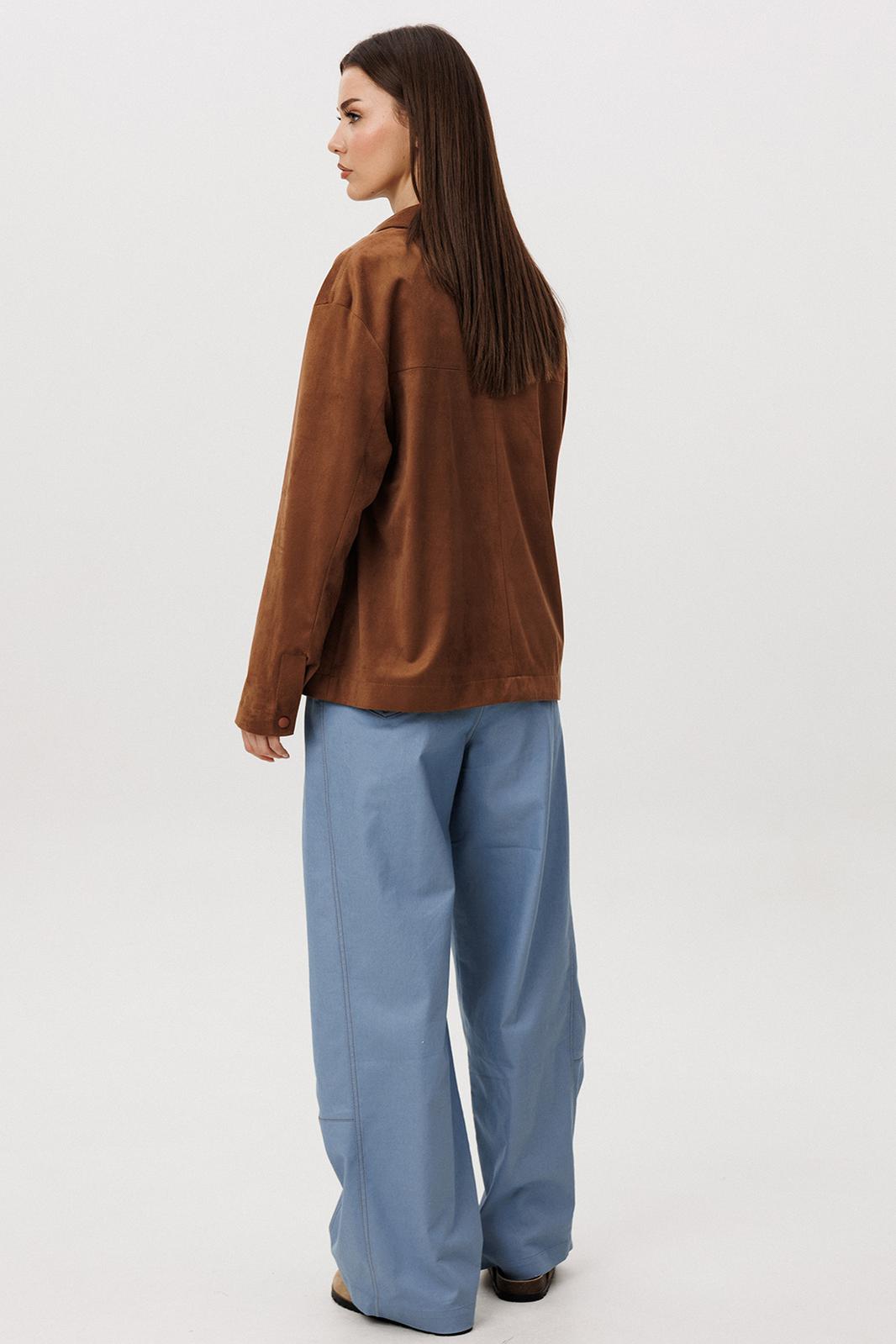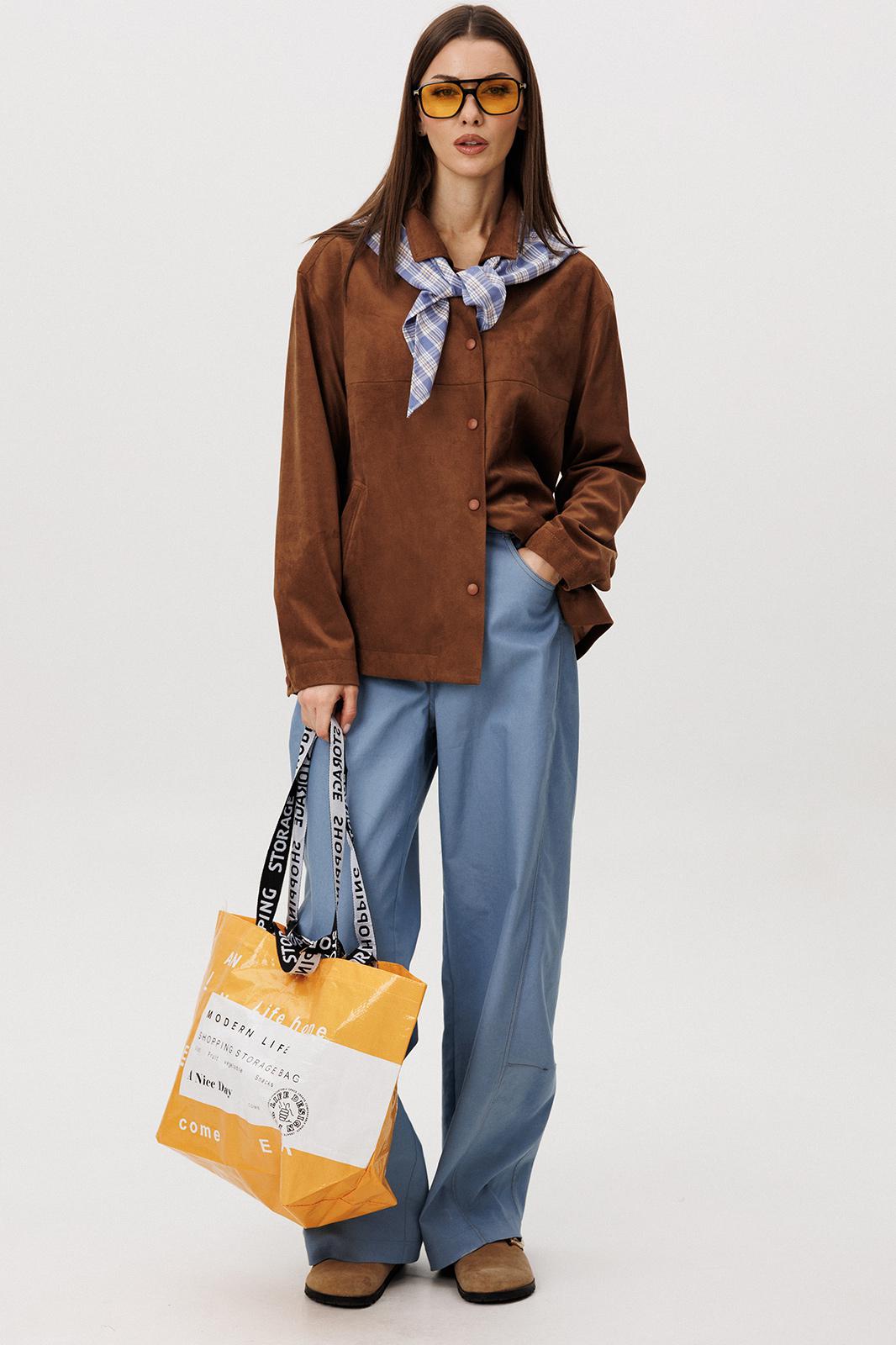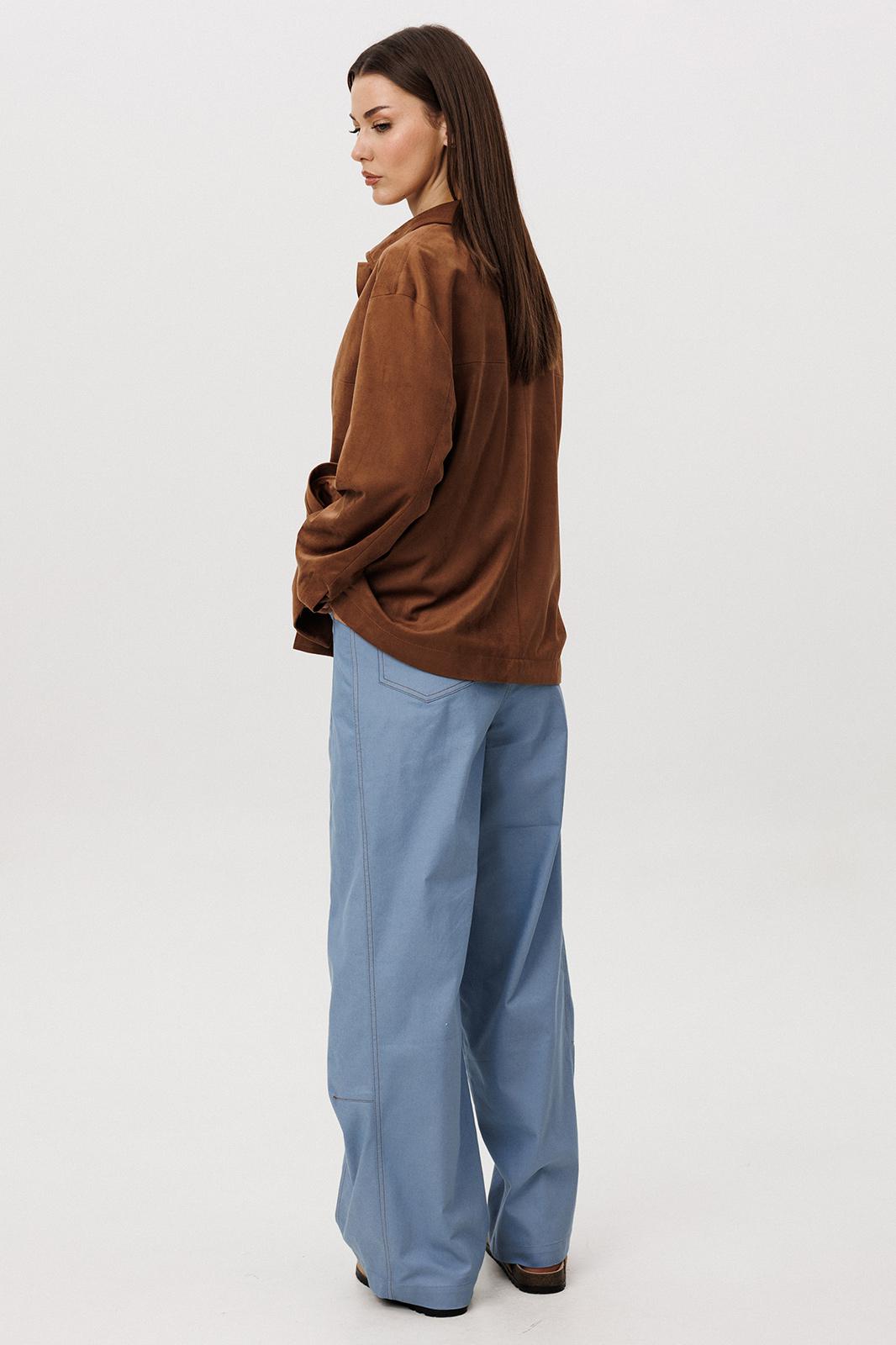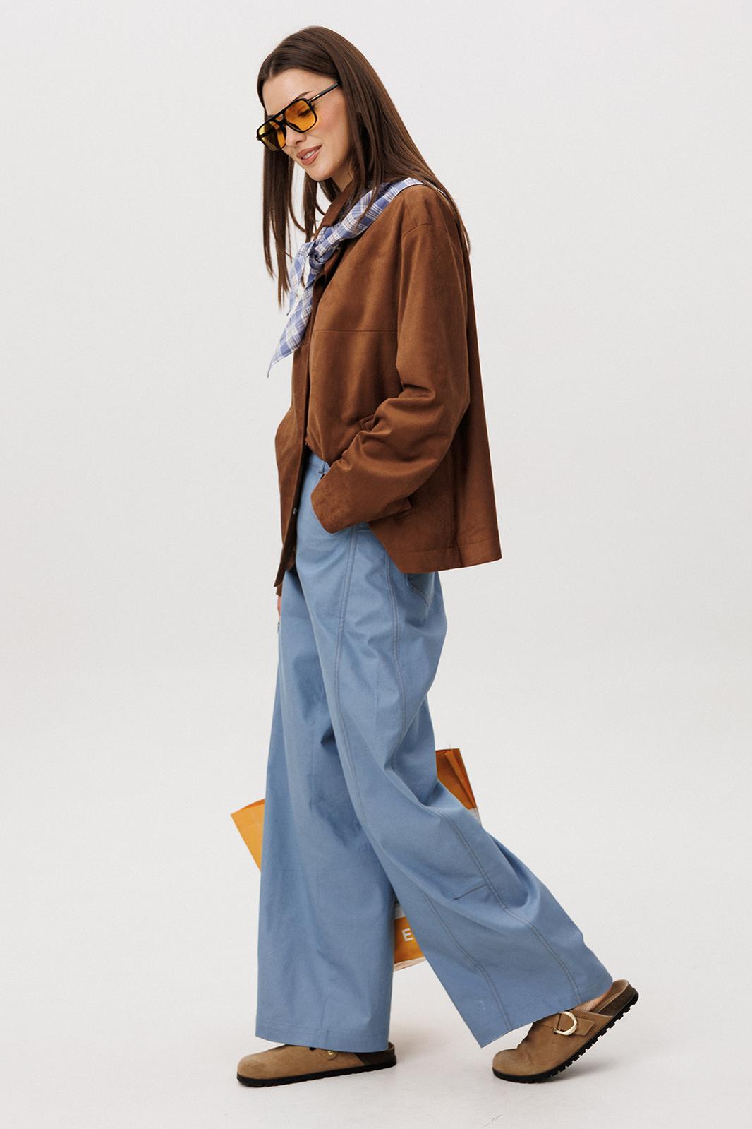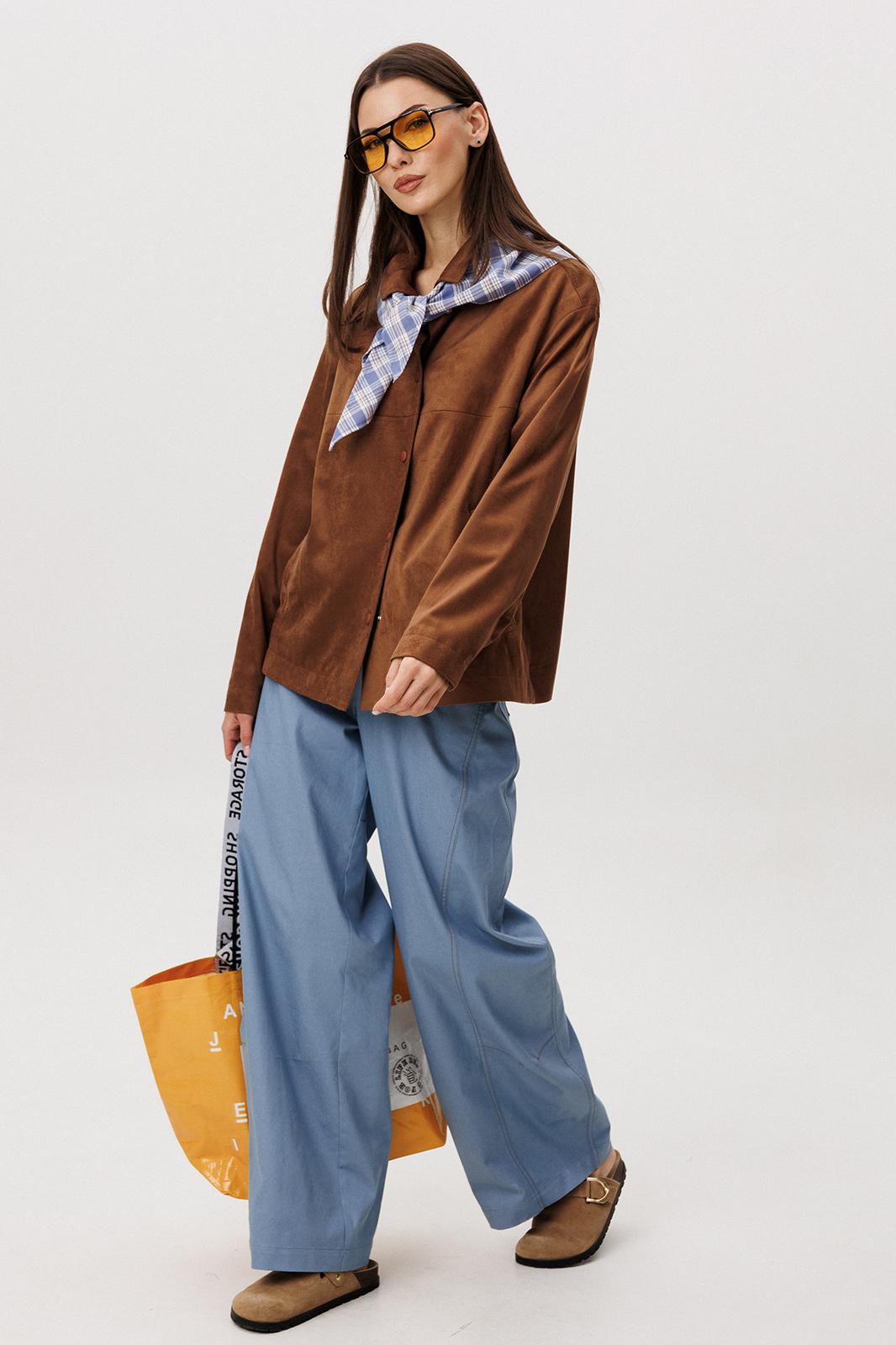 Стильный женский брючный костюм в стиле смарт-кэжуал сочетает комфорт и элегантность. Рубашка выполнена из замшевой ткани, брюки из джинсовой ткани тиффани. Идеальный выбор для повседневных образов.
