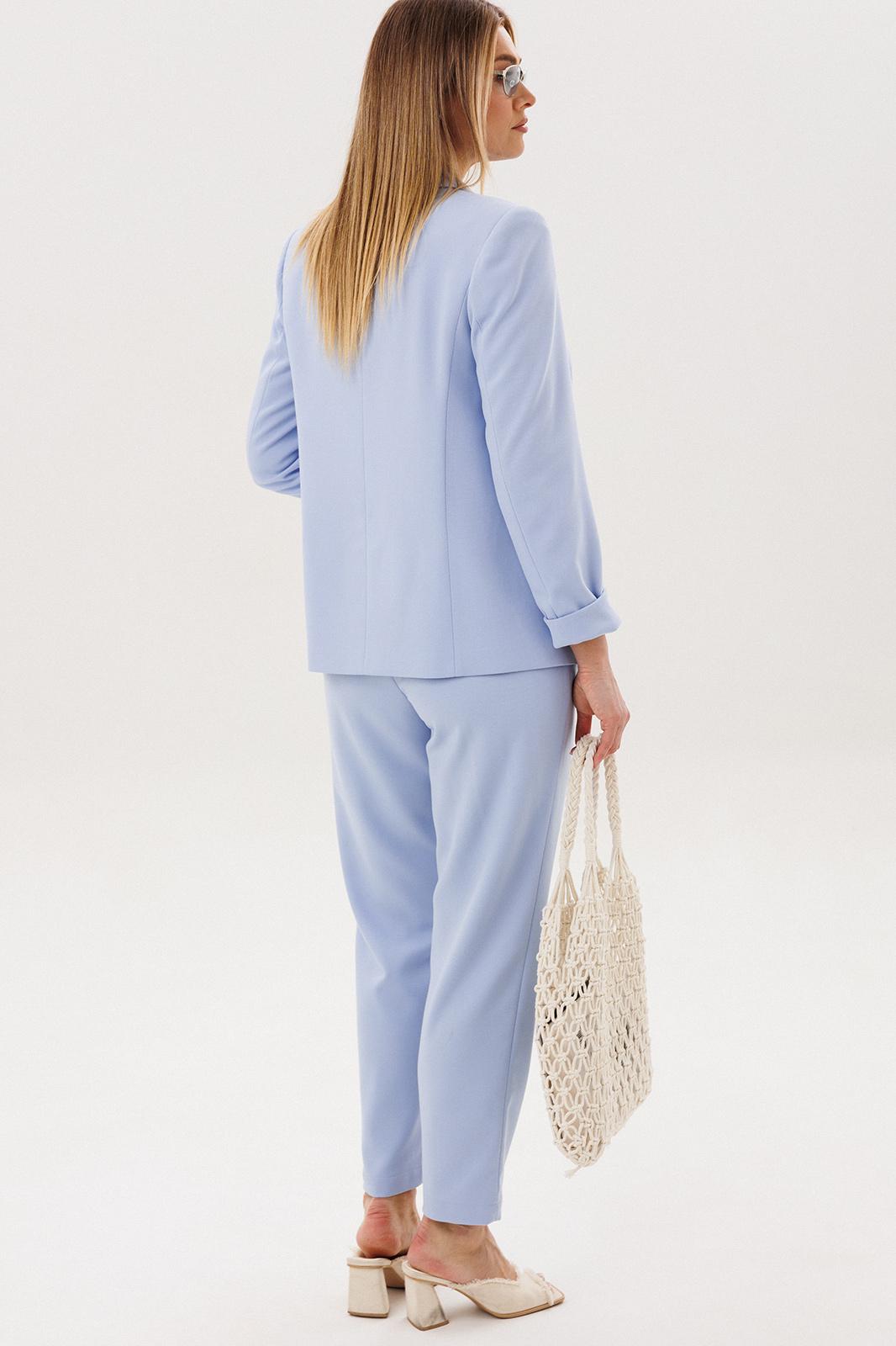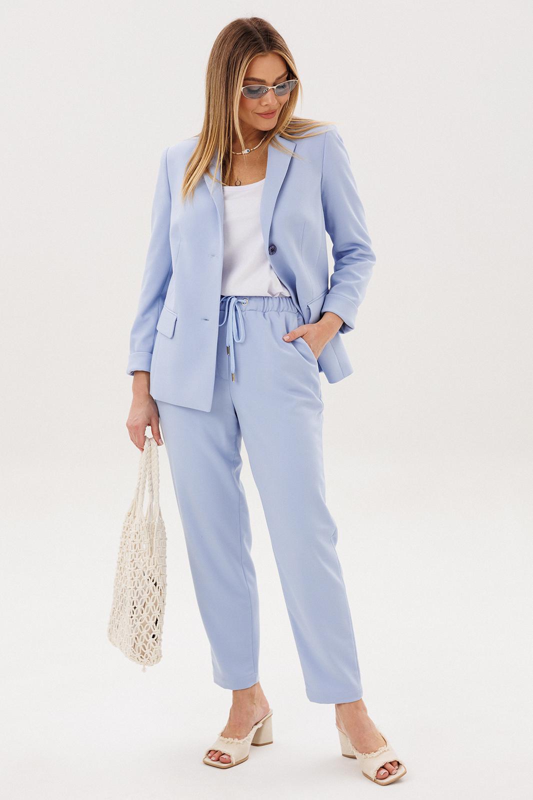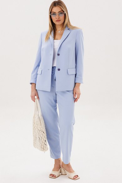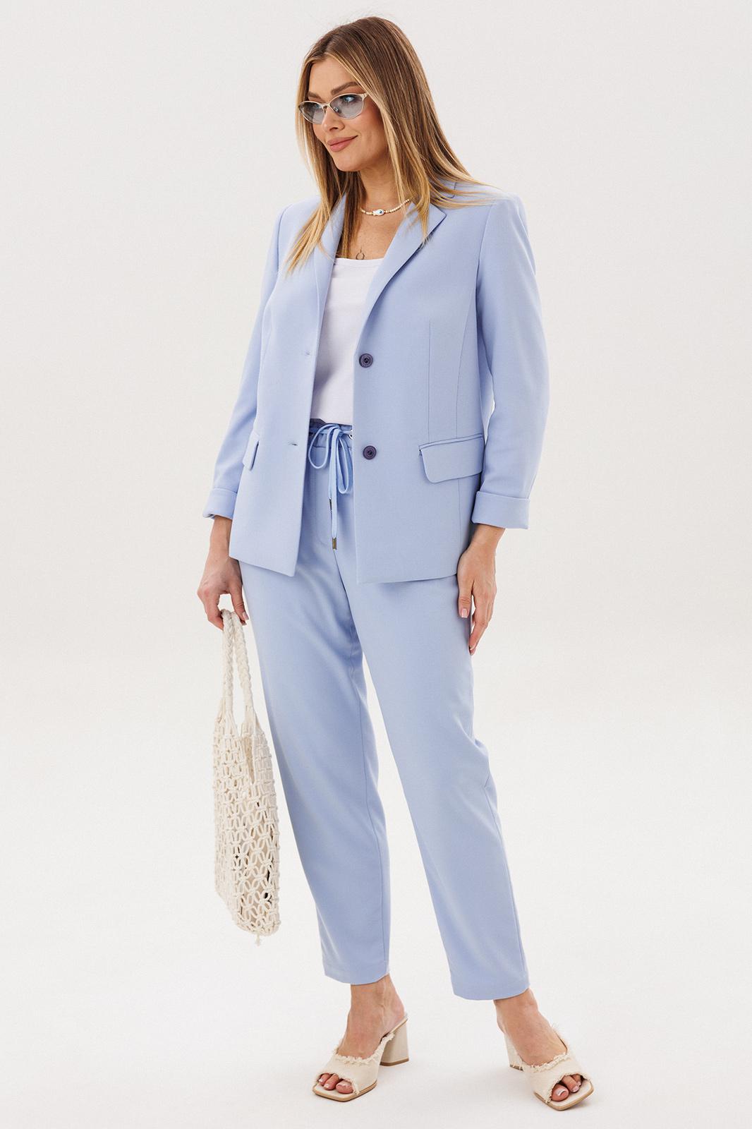 Силуэт свободный, слегка упрямлённый, покрой-втачной, воротник классический английский, линия борта фигурная, застёжка на две петли и пуговицы. Полочка с отрезным бочком, нагрудной вытачкой и прорезным карманом с клапаном. Спинка со средним швом и талиевой вытачкой. Рукав двухшовный с отлетной шлицей и отделочными пуговицами. Брюки свободные, на эластичном поясе с люверсами и отделочным шнуром. Передние половинки с боковыми накладными карманами. Длина пиджака около 67 см, длина рукава около 60 см. Длина брюк около 98 см.