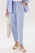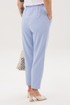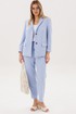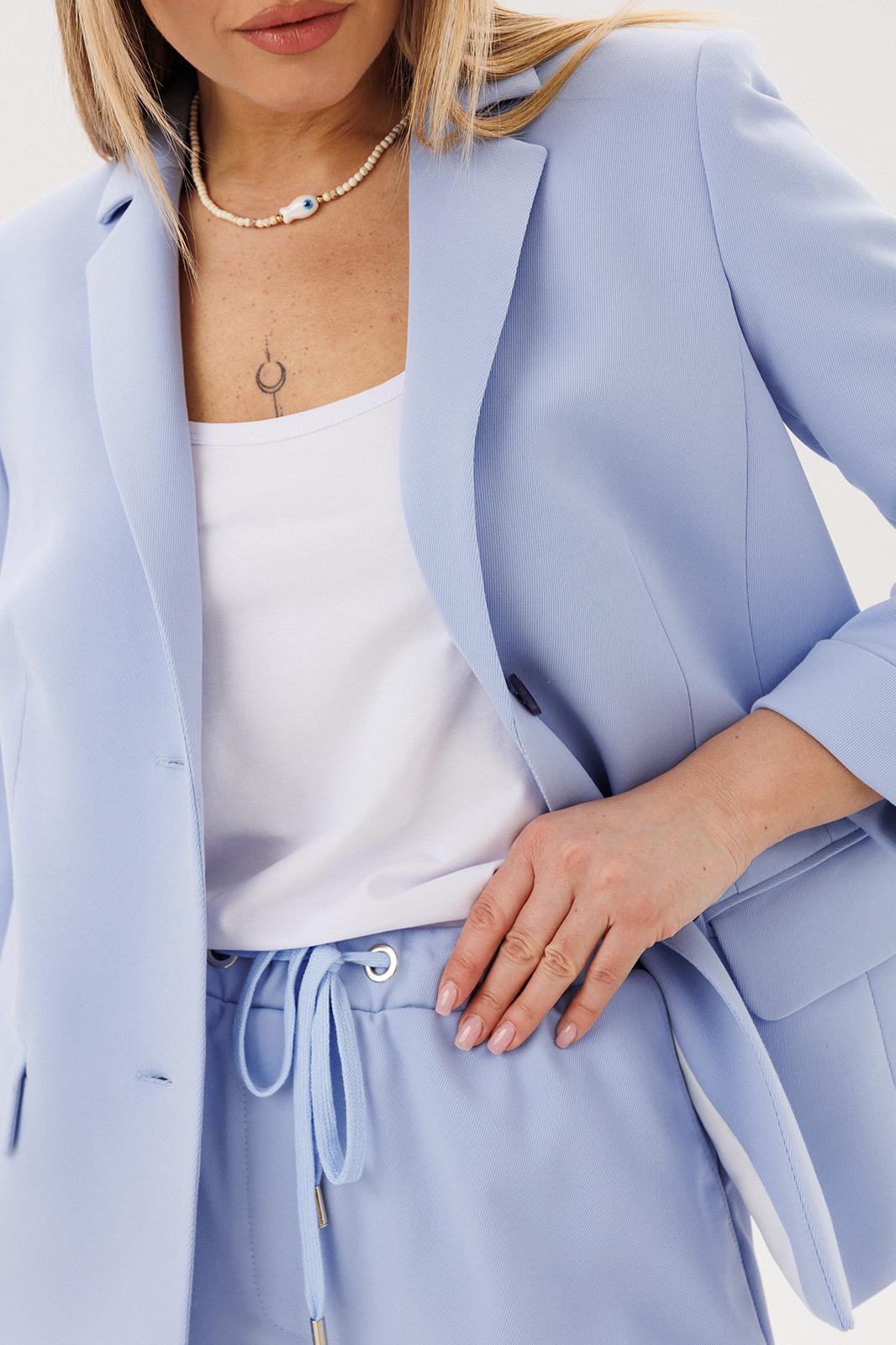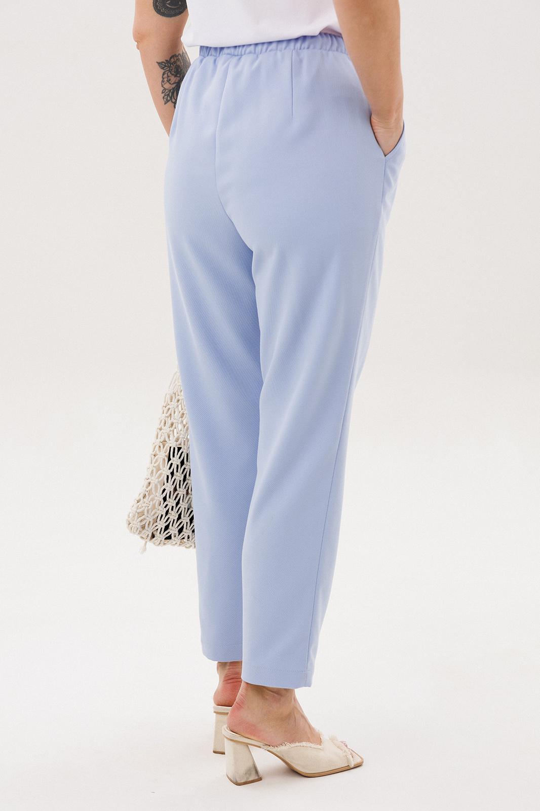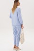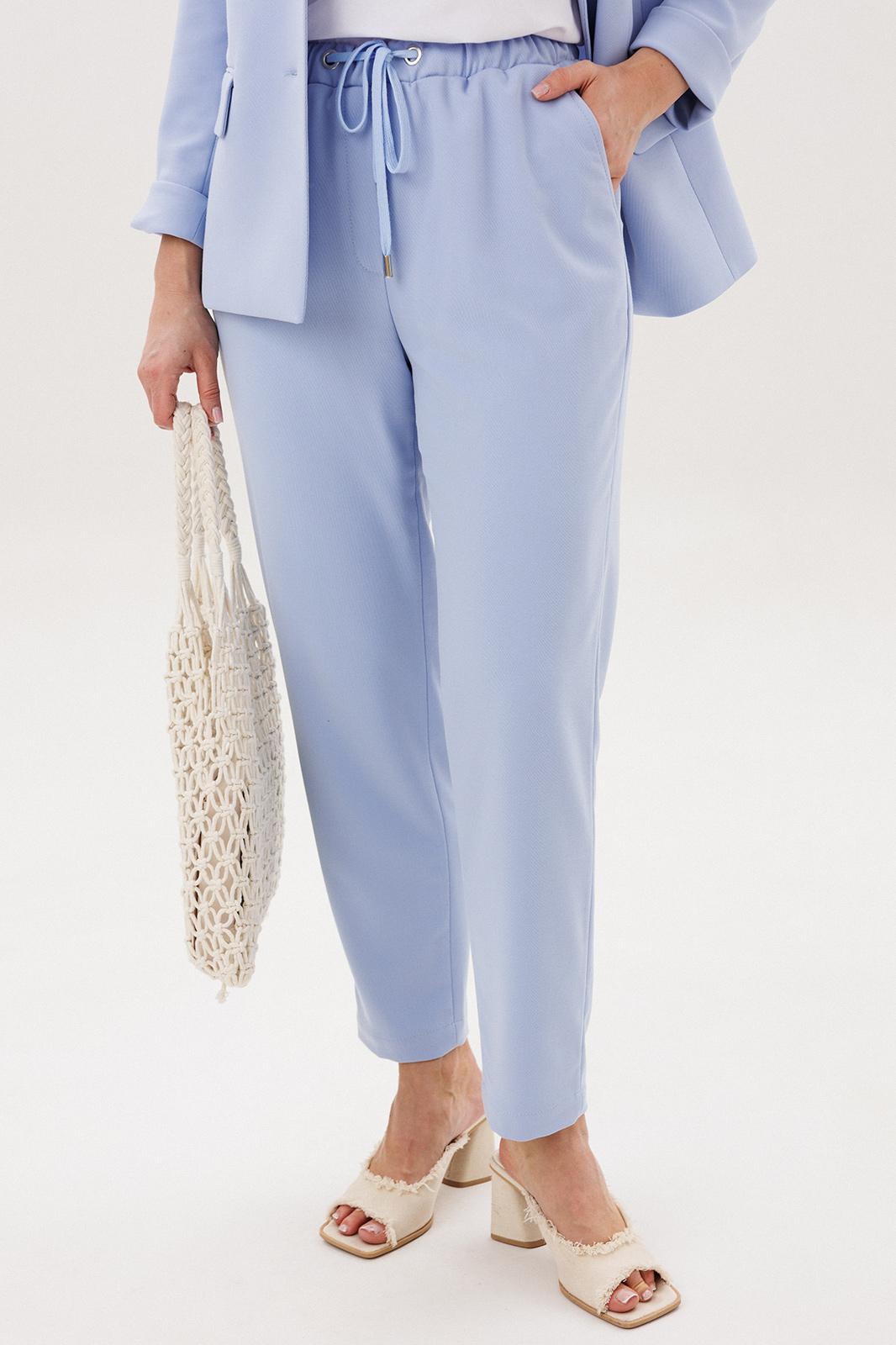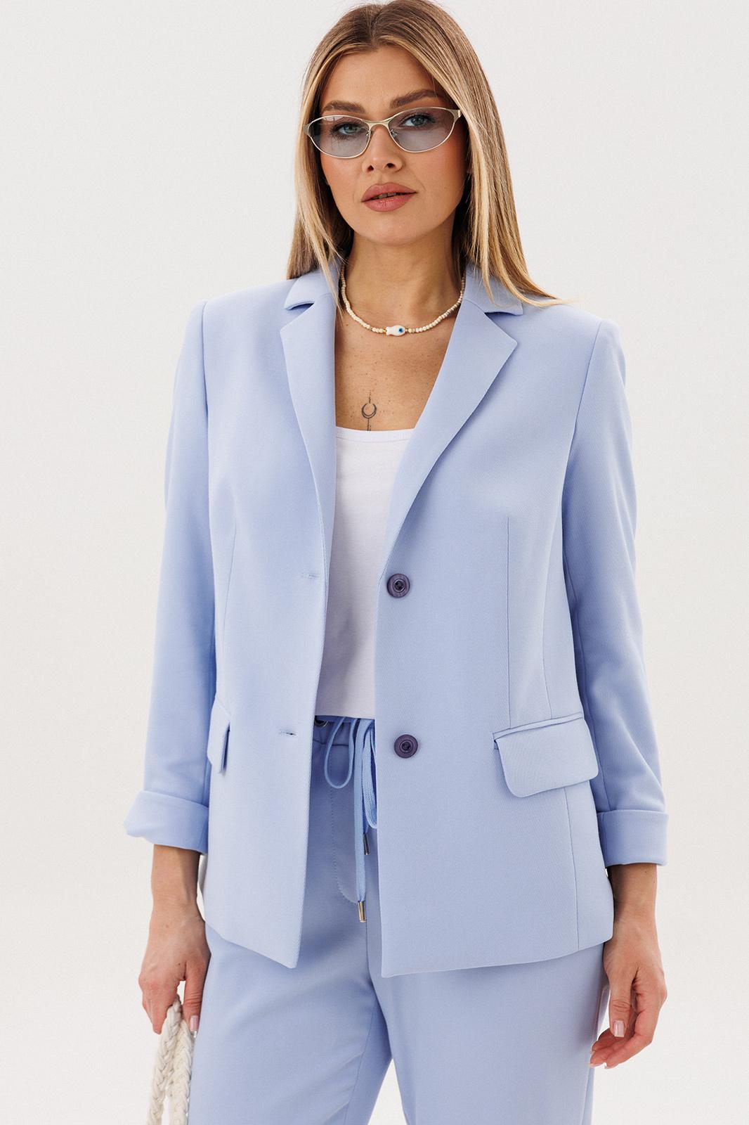 Силуэт свободный, слегка упрямлённый, покрой-втачной, воротник классический английский, линия борта фигурная, застёжка на две петли и пуговицы. Полочка с отрезным бочком, нагрудной вытачкой и прорезным карманом с клапаном. Спинка со средним швом и талиевой вытачкой. Рукав двухшовный с отлетной шлицей и отделочными пуговицами. Брюки свободные, на эластичном поясе с люверсами и отделочным шнуром. Передние половинки с боковыми накладными карманами. Длина пиджака около 67 см, длина рукава около 60 см. Длина брюк около 98 см.