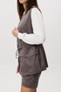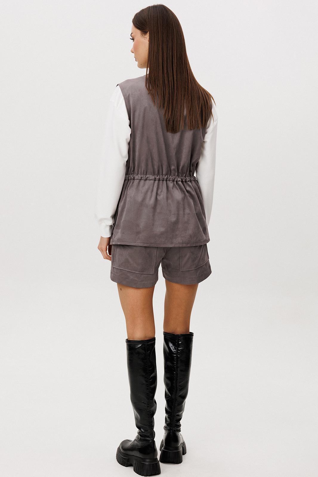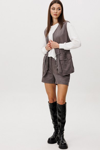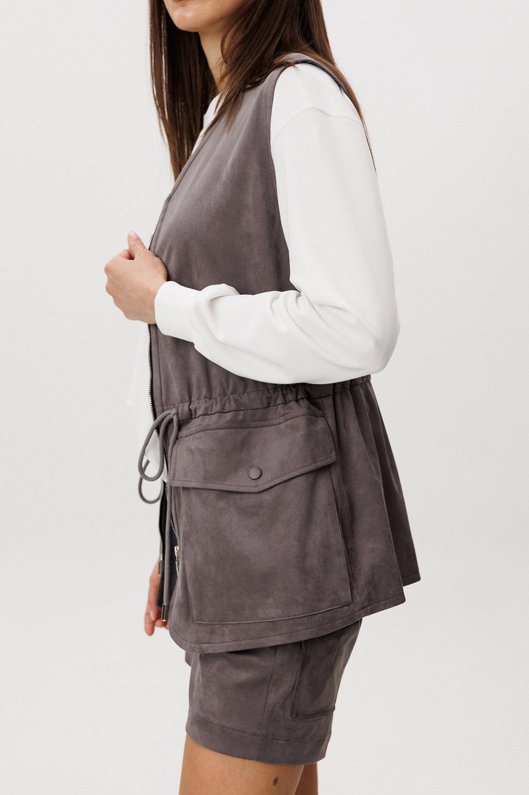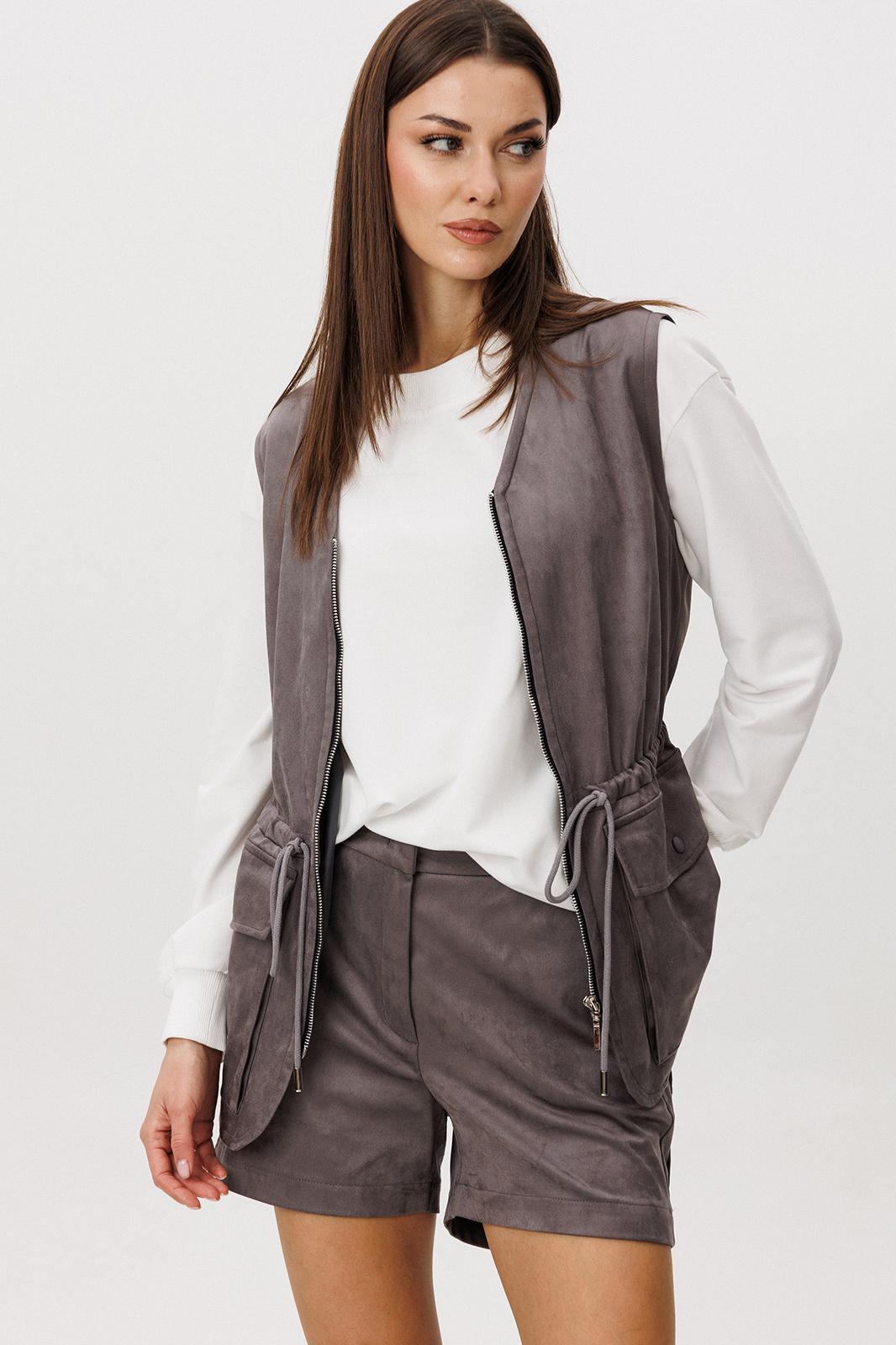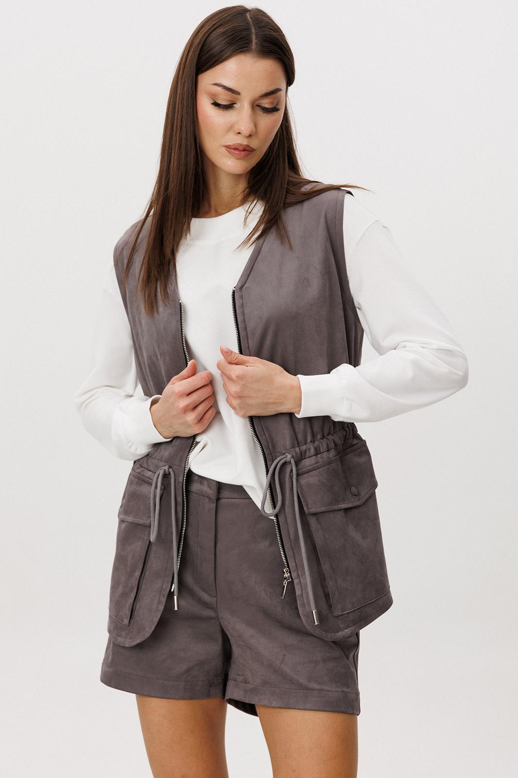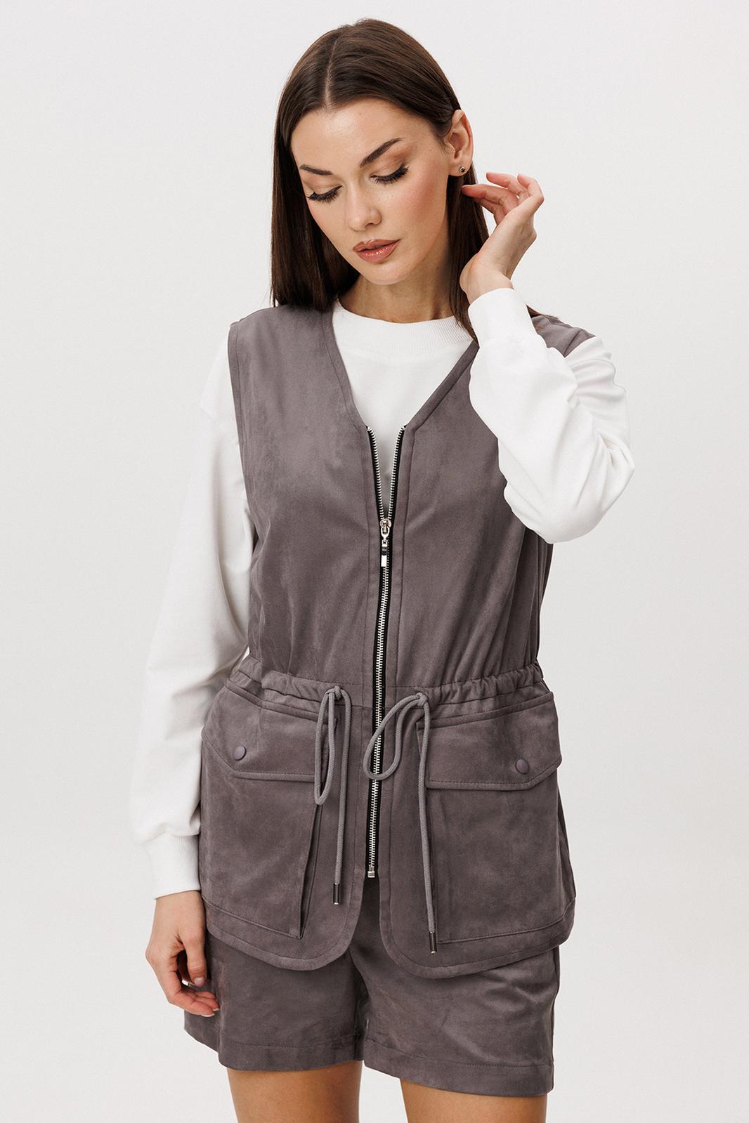 Образ, который говорит сам за себя, смелый и дерзкий, и в то же время очень комфортный. Нестандартный жилет с накладными карманами-пеналами с клапаном. Регулирующая кулиса, подчеркивающая талию. Свободный силуэт, центральная застежка на тесьму молнию, фигурная линия низа. Жилет на подкладке.