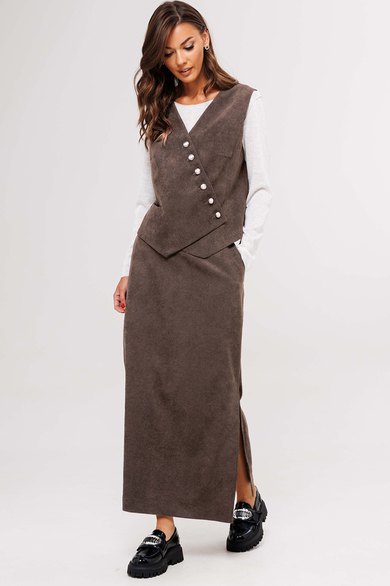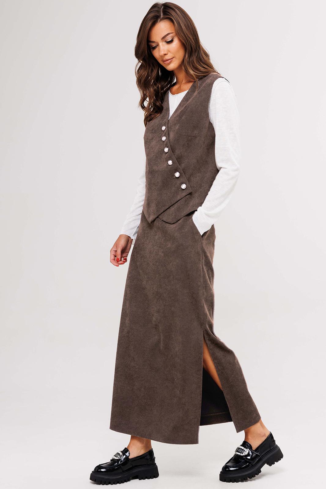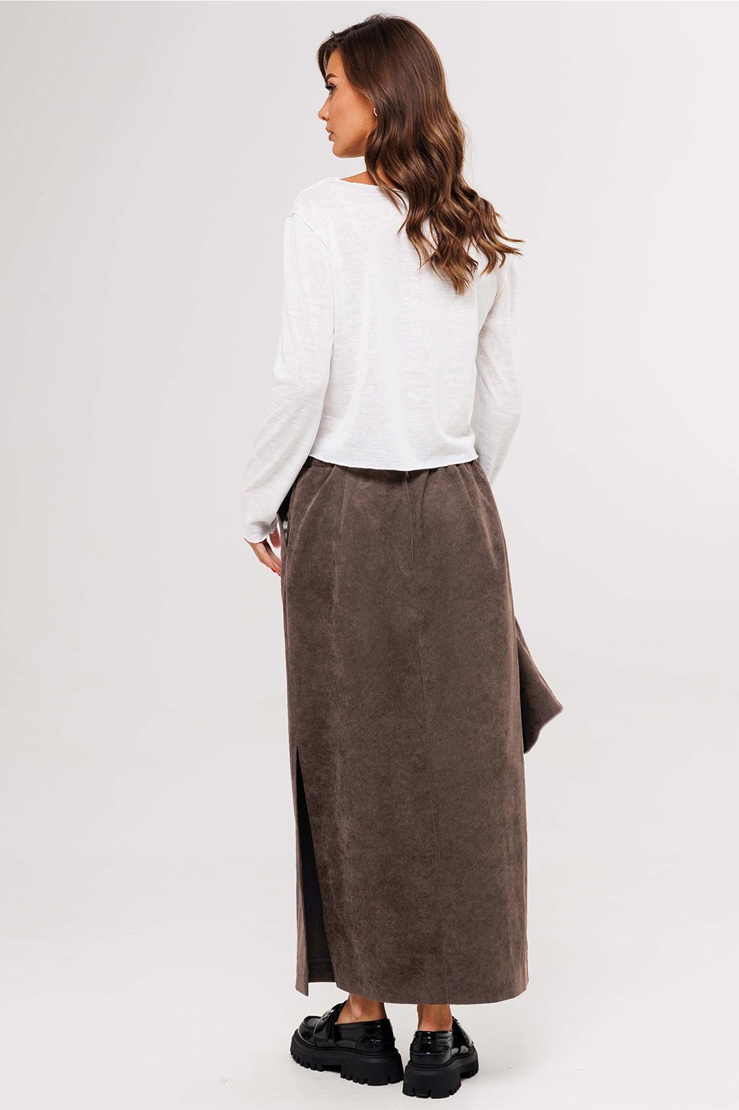 Юбка прямая с застёжкой и боковыми карманами по переднему полотнищу, и разрезом сбоку, из текстильного трикотажного полотна эффекта вельвет. Пояс эластичный в области спинки.
