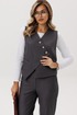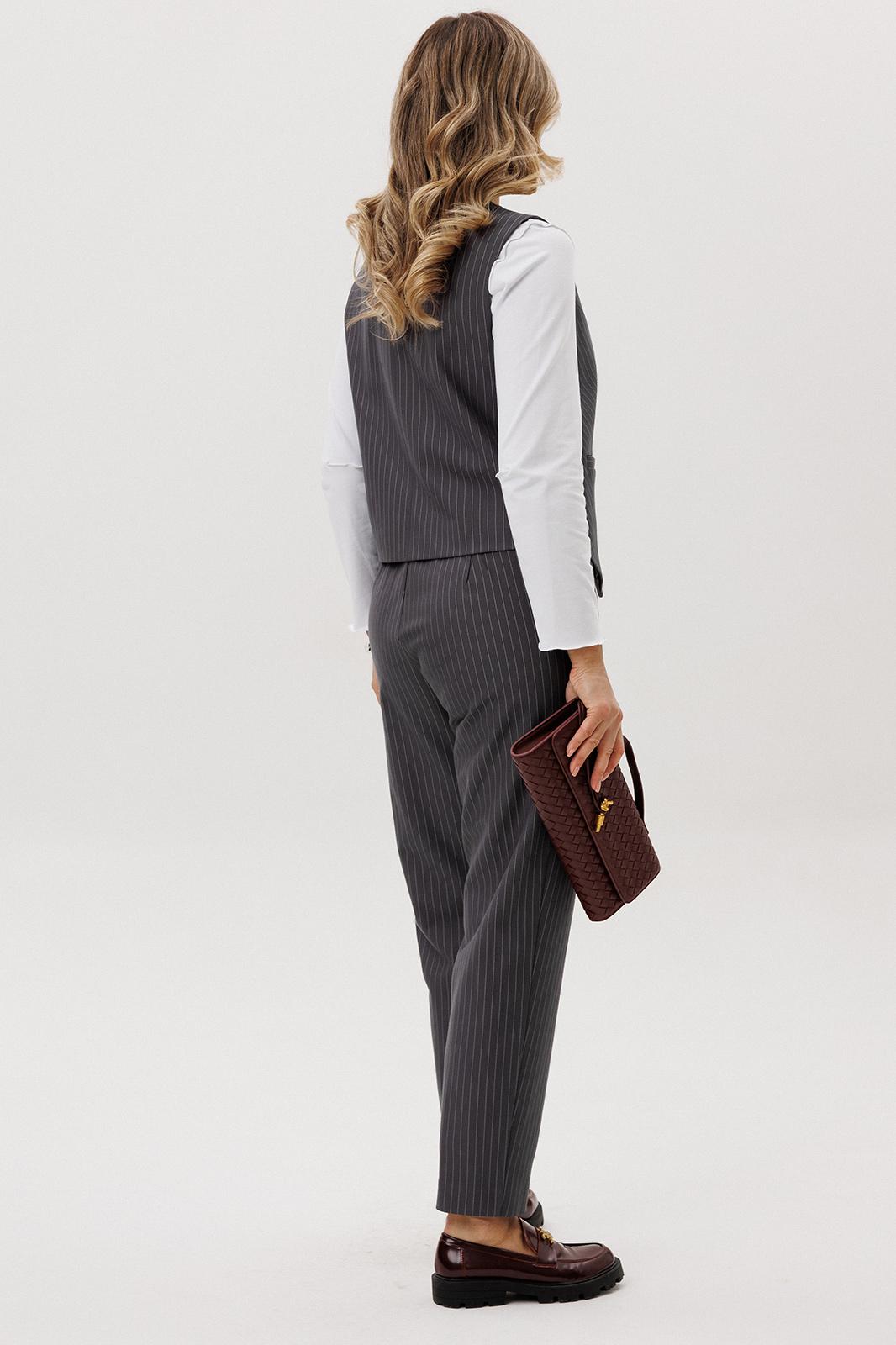 Модель выполнена из плотной трикотажной ткани с тонкой вертикальной полоской, которая визуально вытягивает силуэт и подчёркивает стройность. Жилет без рукавов застёгивается на декоративные пуговицы, создавая выразительный акцент в образе. Брюки классические, прямые. Джемпер трикотажный, с длинным рукавом, полуприлегающего силуэта.