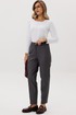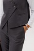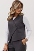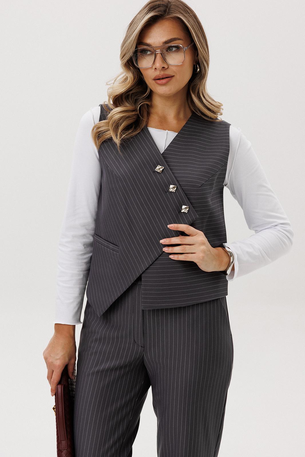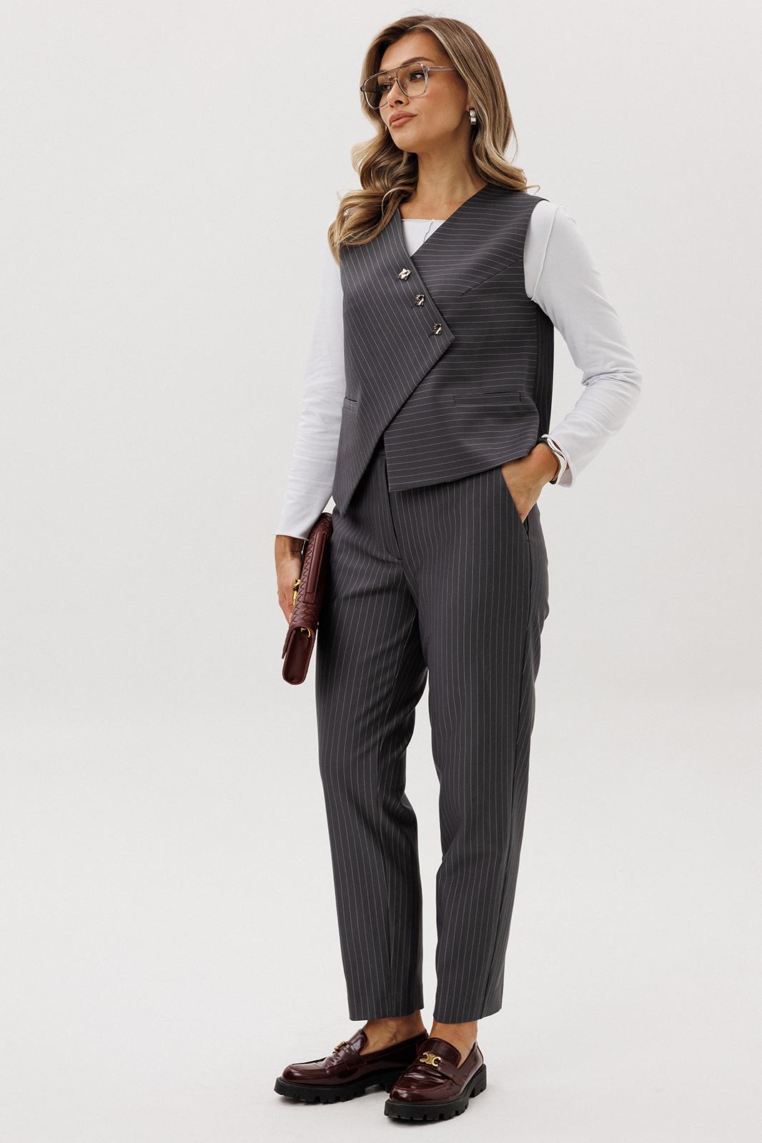 Стильный женский костюм в полоску — идеальное сочетание элегантности и современного минимализма. Комплект состоит из жилета оригинального кроя с асимметричной застёжкой, брюк и джемпера с длинным рукавом.