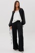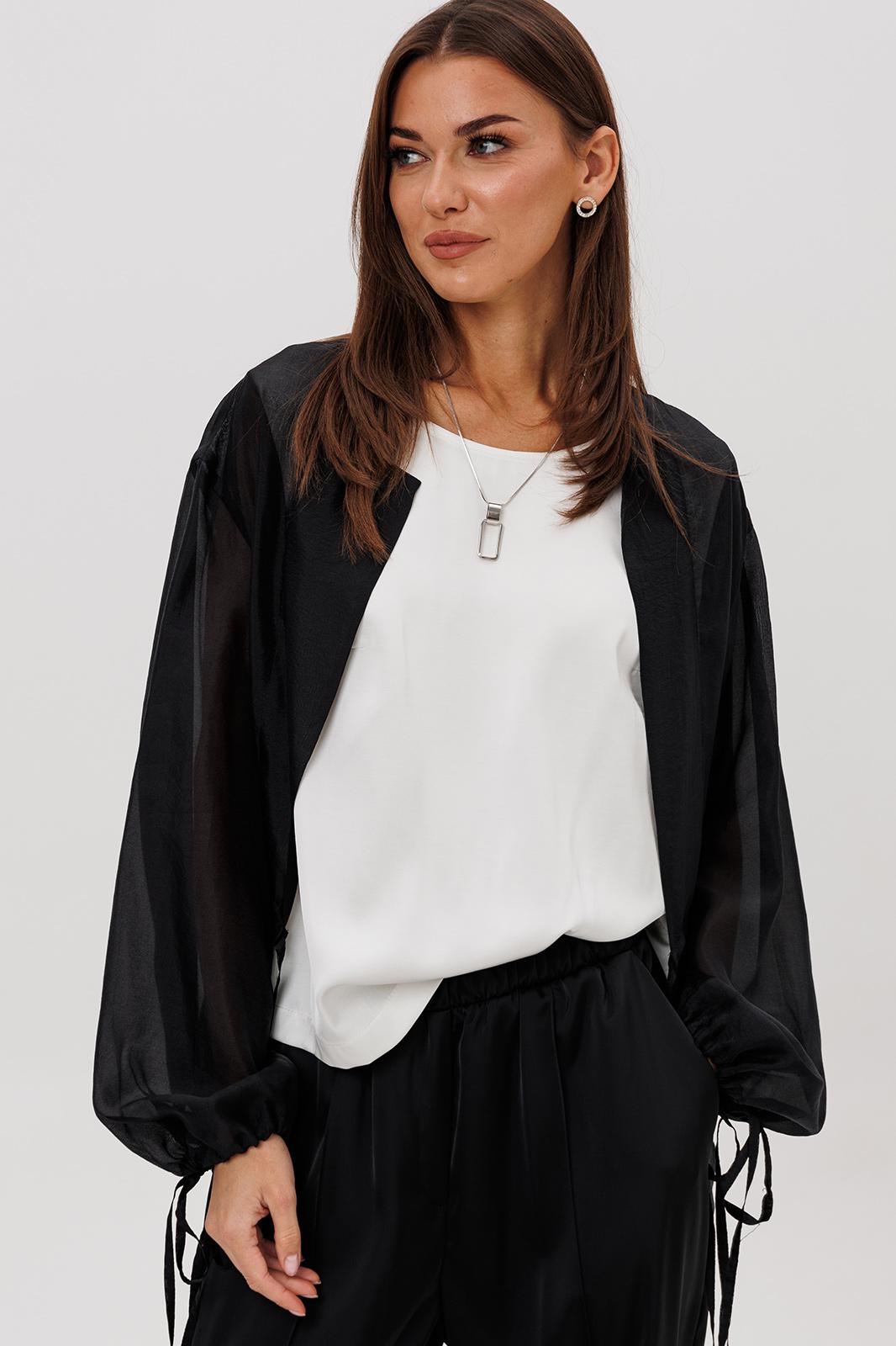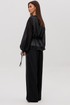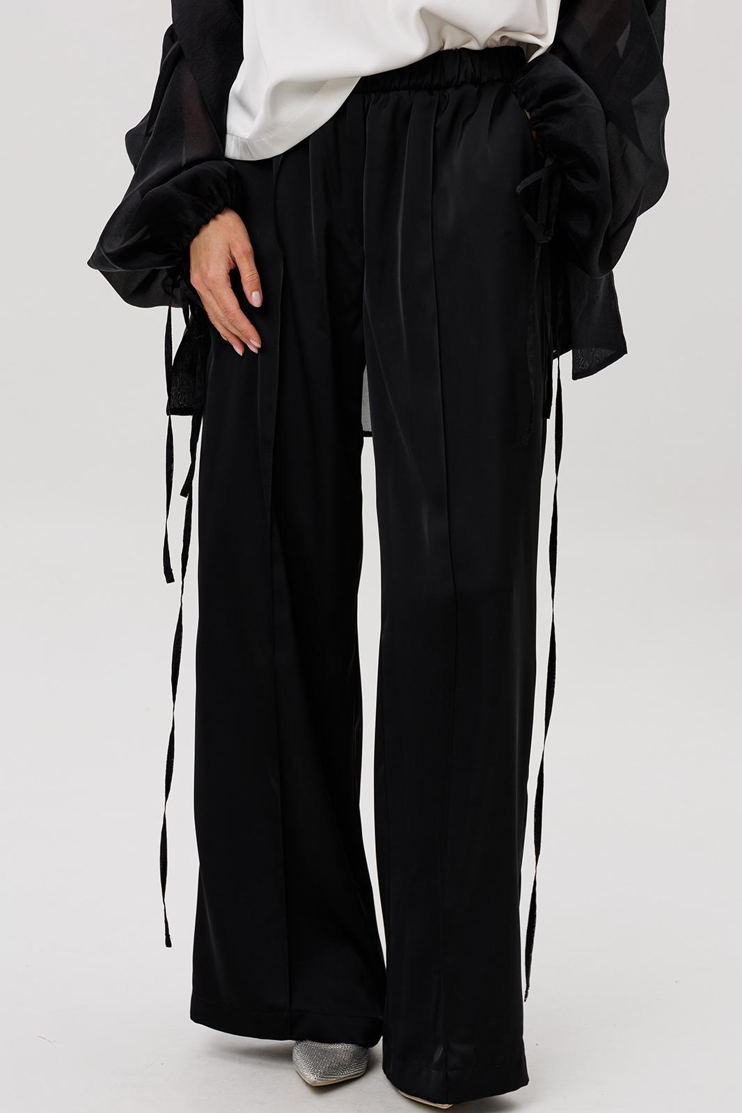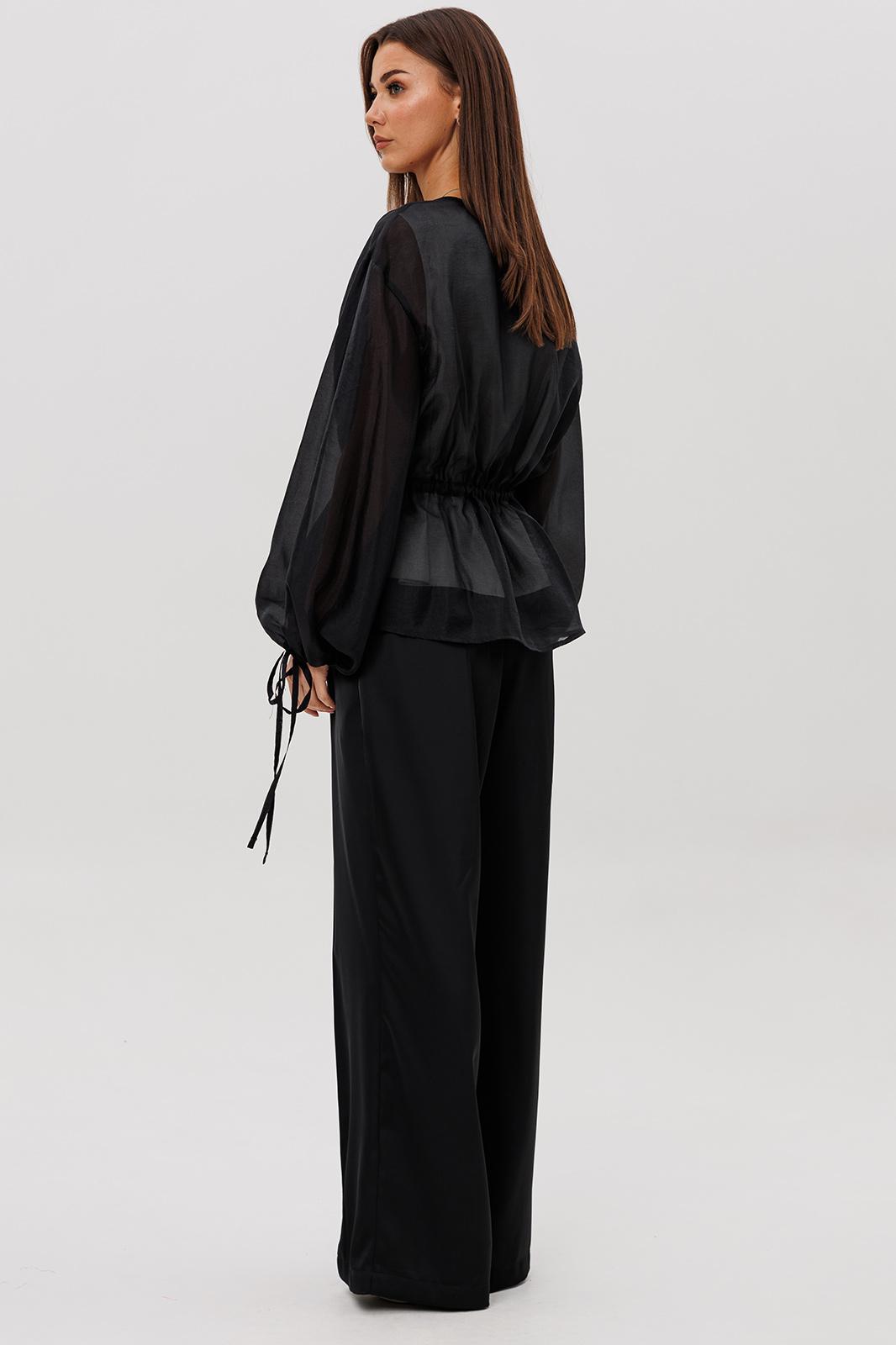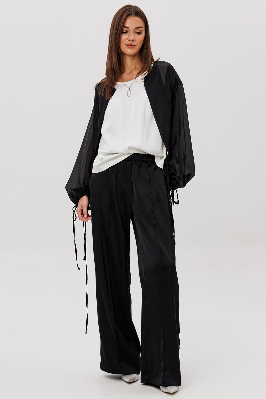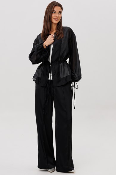 Эффектный ансамбль-тройка, в котором каждая деталь работает на утончённый и современный образ. Полупрозрачный блузон из воздушной вискозной органзы создаёт легкую дымку и добавляет образу благородной загадочности, а акцентные завязки подчёркивают талию и делают силуэт более выразительным. Контрастный атласный топ вносит нотку сияния и гармонично освежает тёмную гамму комплекта. Широкие атласные брюки со стрелкой и комфортным эластичным поясом добавляют образу сдержанной элегантности и подчёркивают его продуманную роскошность.