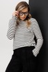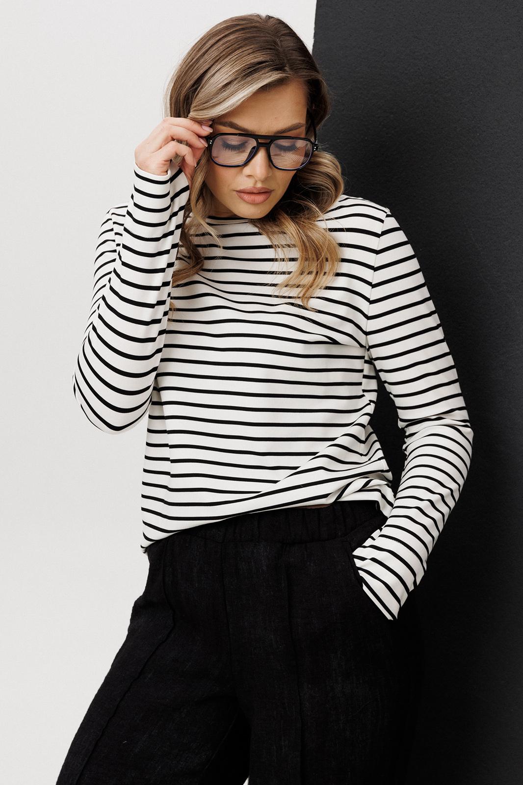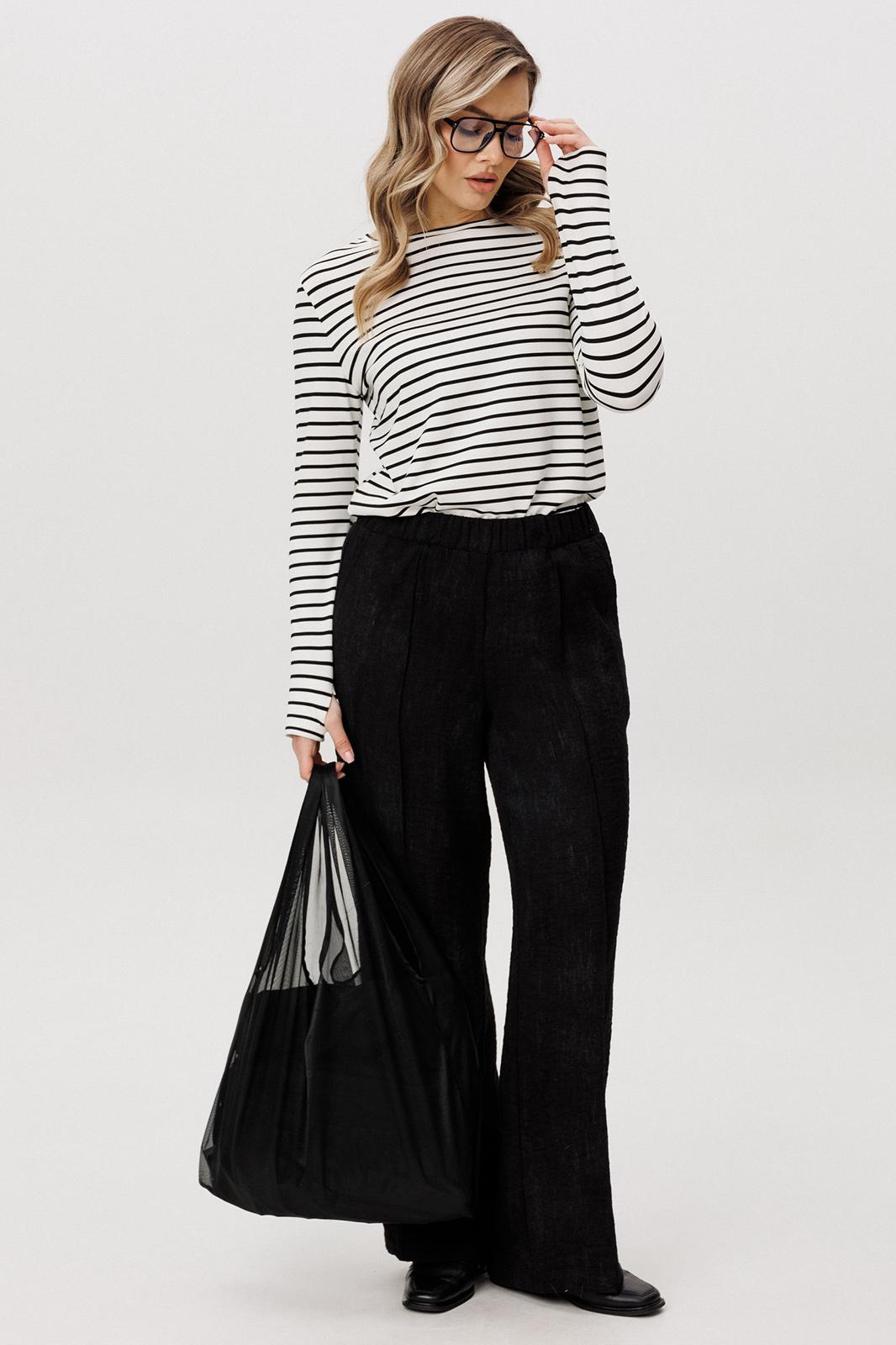 Лонгслив из мягкого трикотажа с горизонтальной полоской освежает комплект и делает его менее формальным. Эластичная ткань приятна к телу и комфортна в течение всего дня.