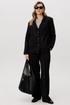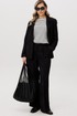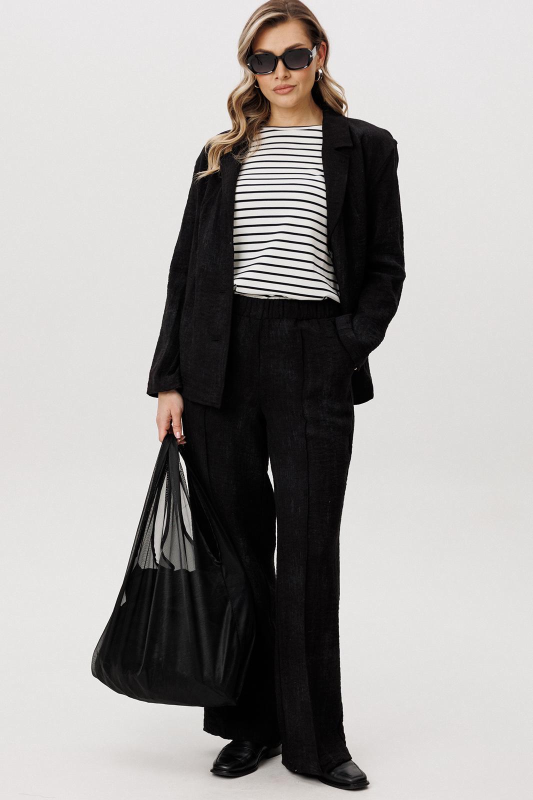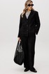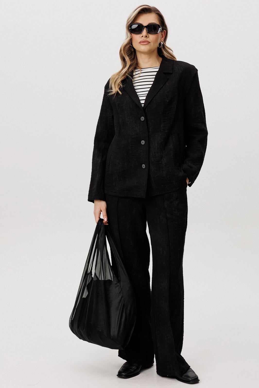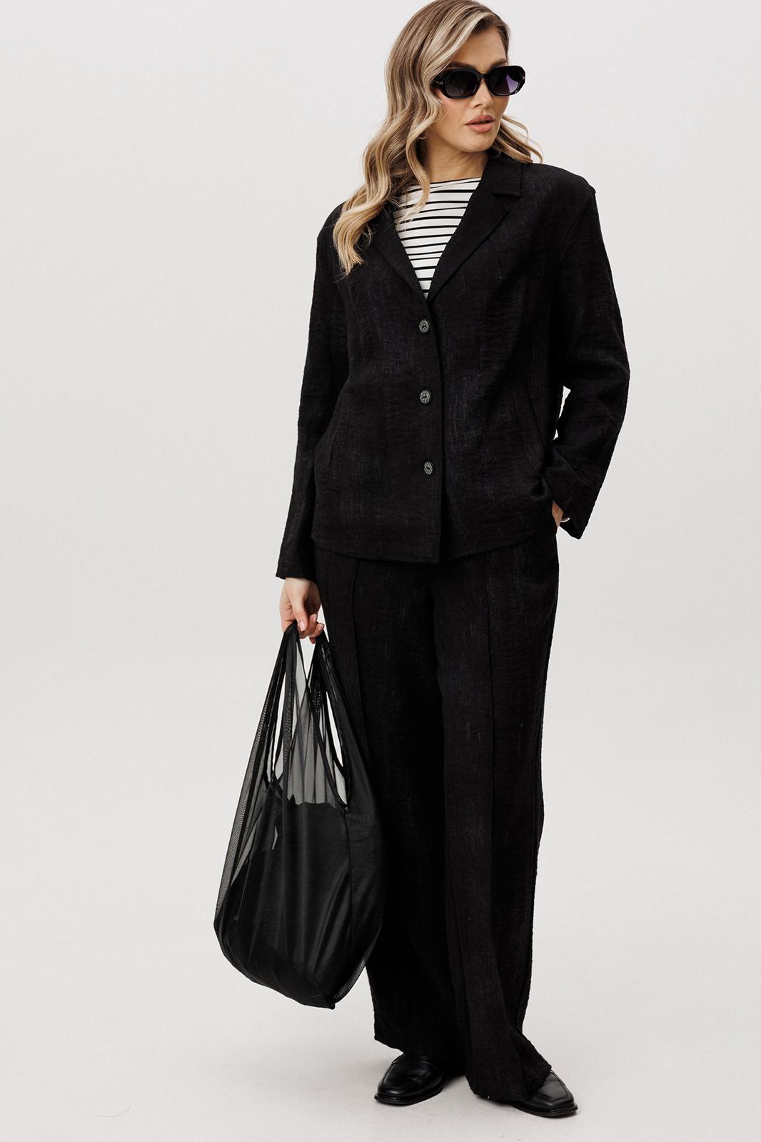 Жакет и брюки формируют лаконичный, структурированный силуэт, визуально вытягивая фигуру. Широкий крой брюк добавляет образу динамики и обеспечивает свободу движений.