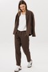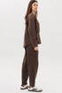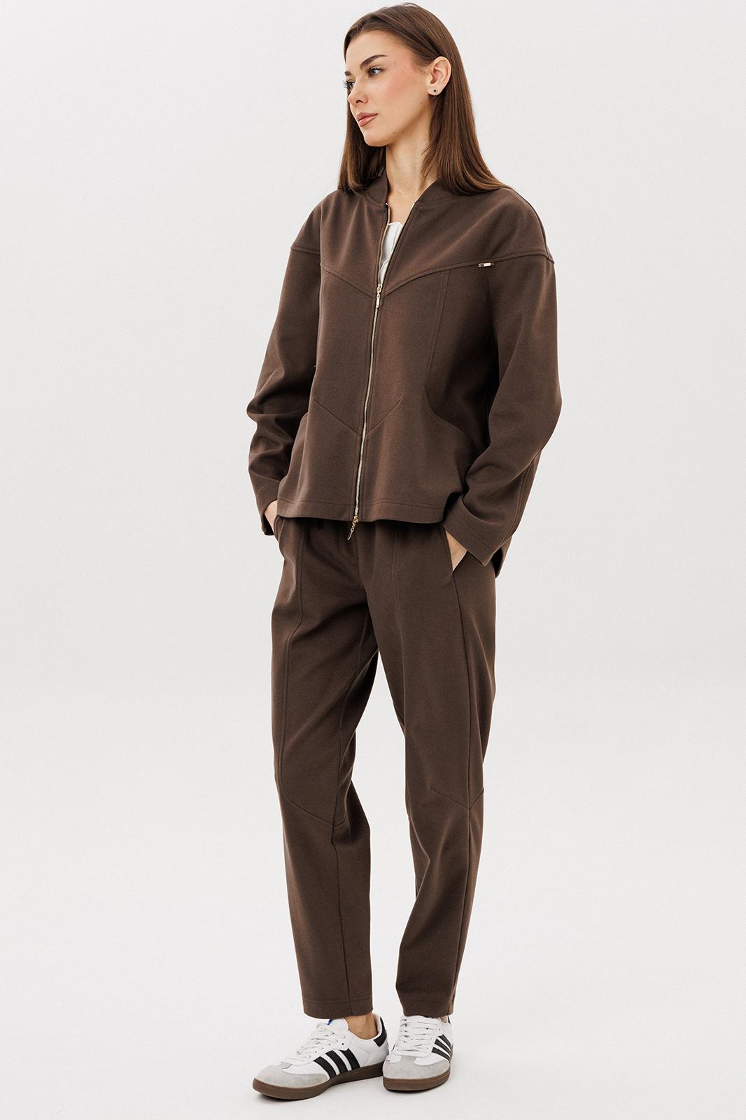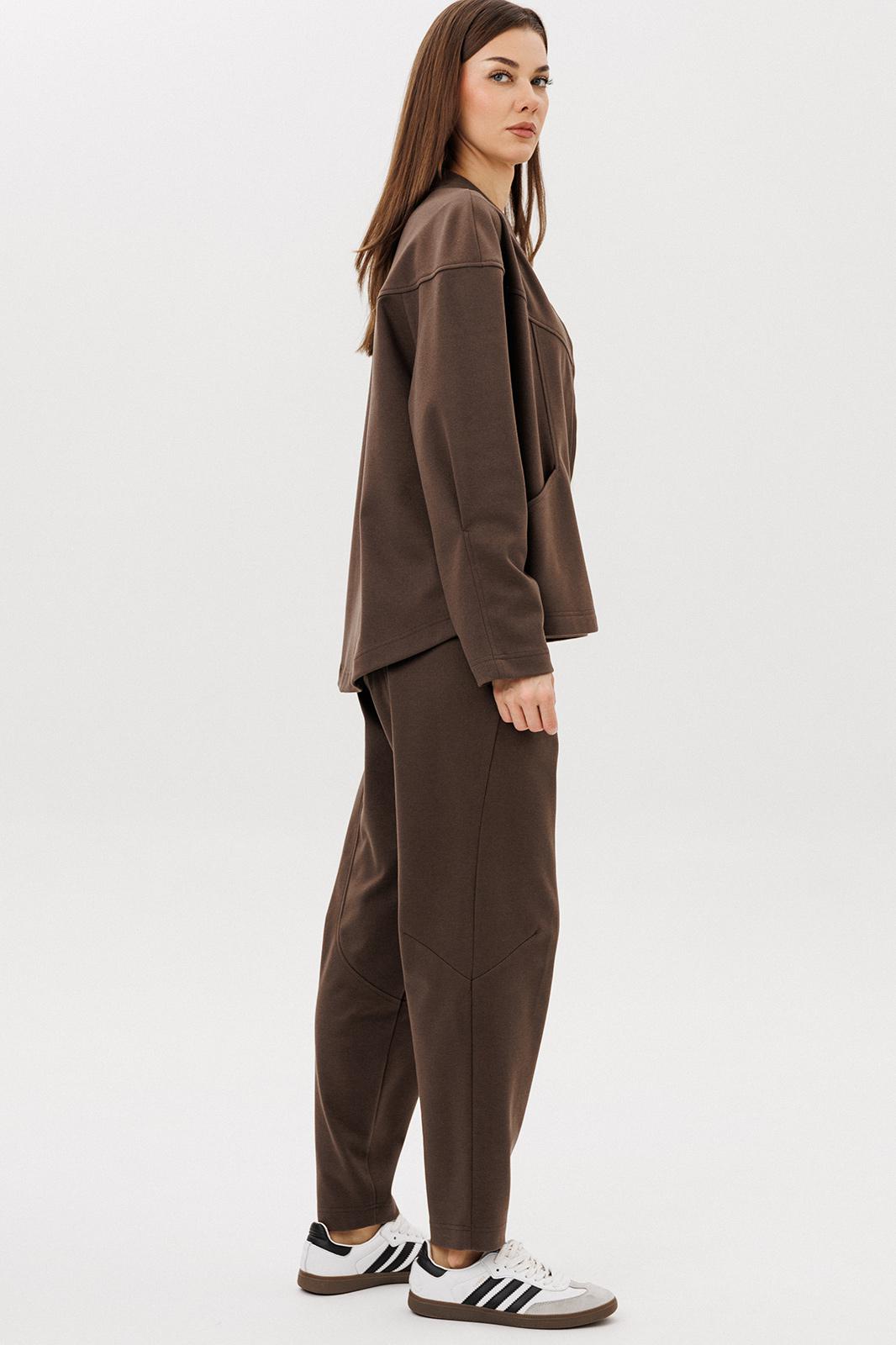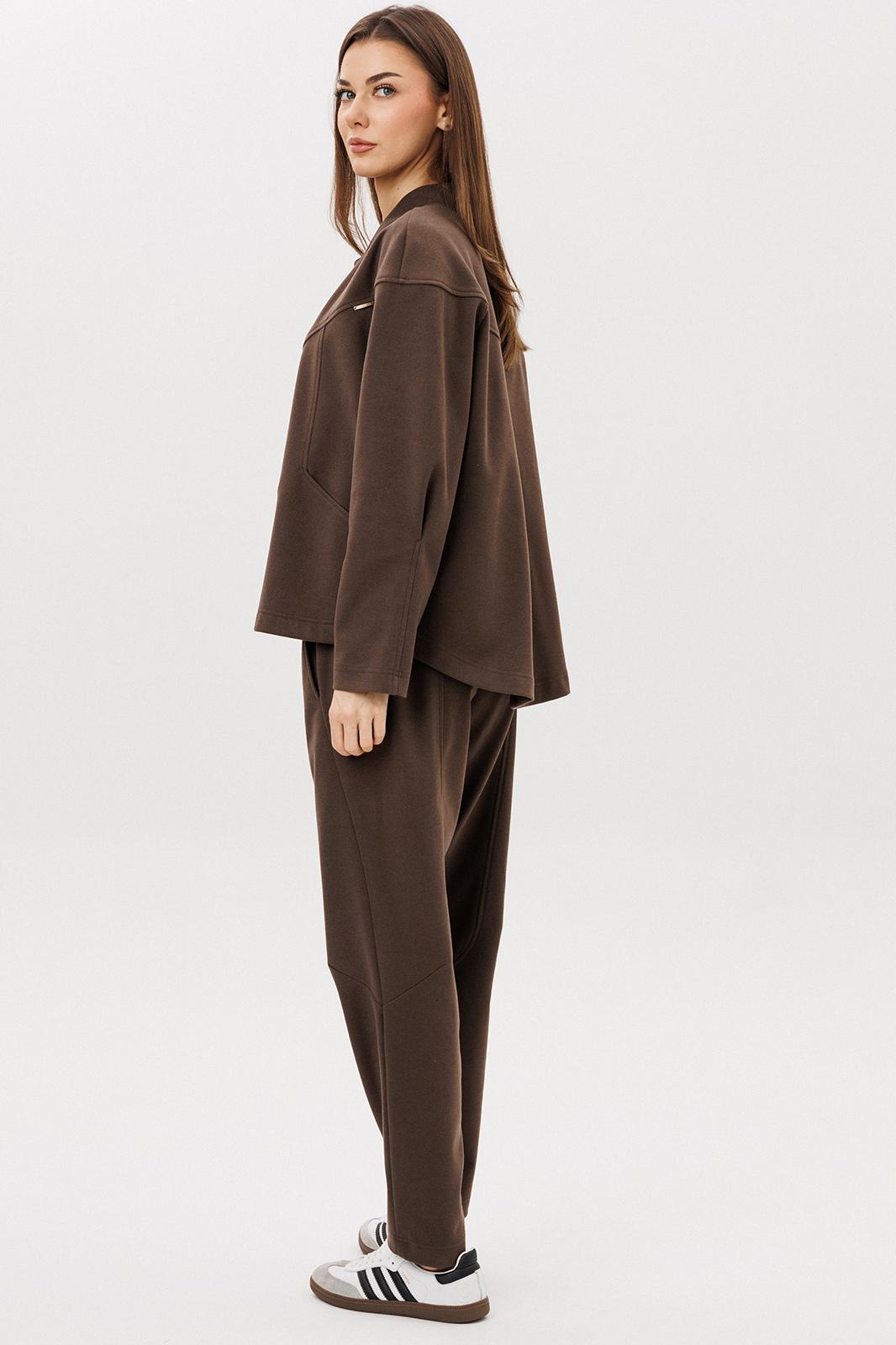 Свободный силуэт, комбинированный покрой, центральная застежка на тесьму-молнию, капюшон рукав-частичный реглан с отрезной широкой манжетой и мягкой складкой в области локтя. Полочка с отрезной кокеткой и фигурным рельефом, переходящим в карман. Спинка с отрезной кокеткой. Брюки свободные, на эластичном поясе в области спинки, с фигурными вертикальными рельефами по центру передних и задних половинок, вытачками в области колена и боковым наклонным карманом. В комплекте топ прилегающего силуэта без рукава.