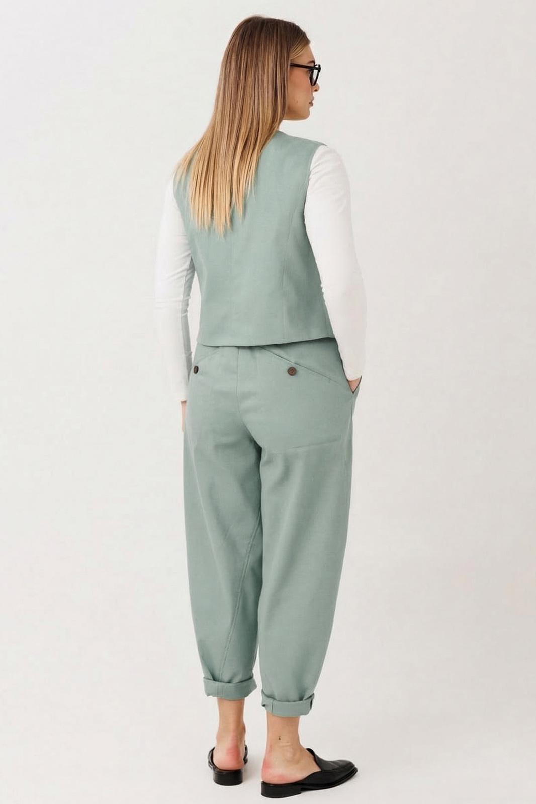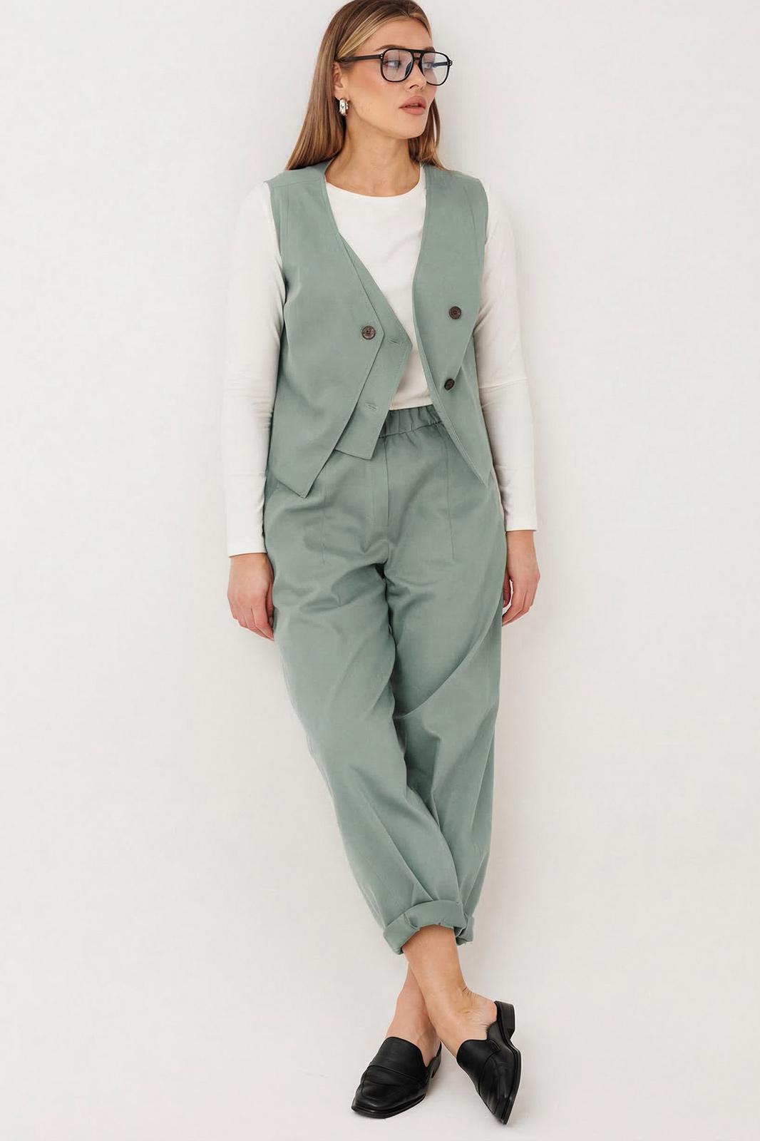 Элегантный брючный комплект в нежном фисташковом оттенке — стильное решение для создания актуального и утончённого образа. Свежий цвет придаёт лёгкость и современное звучание классическому силуэту.
