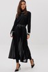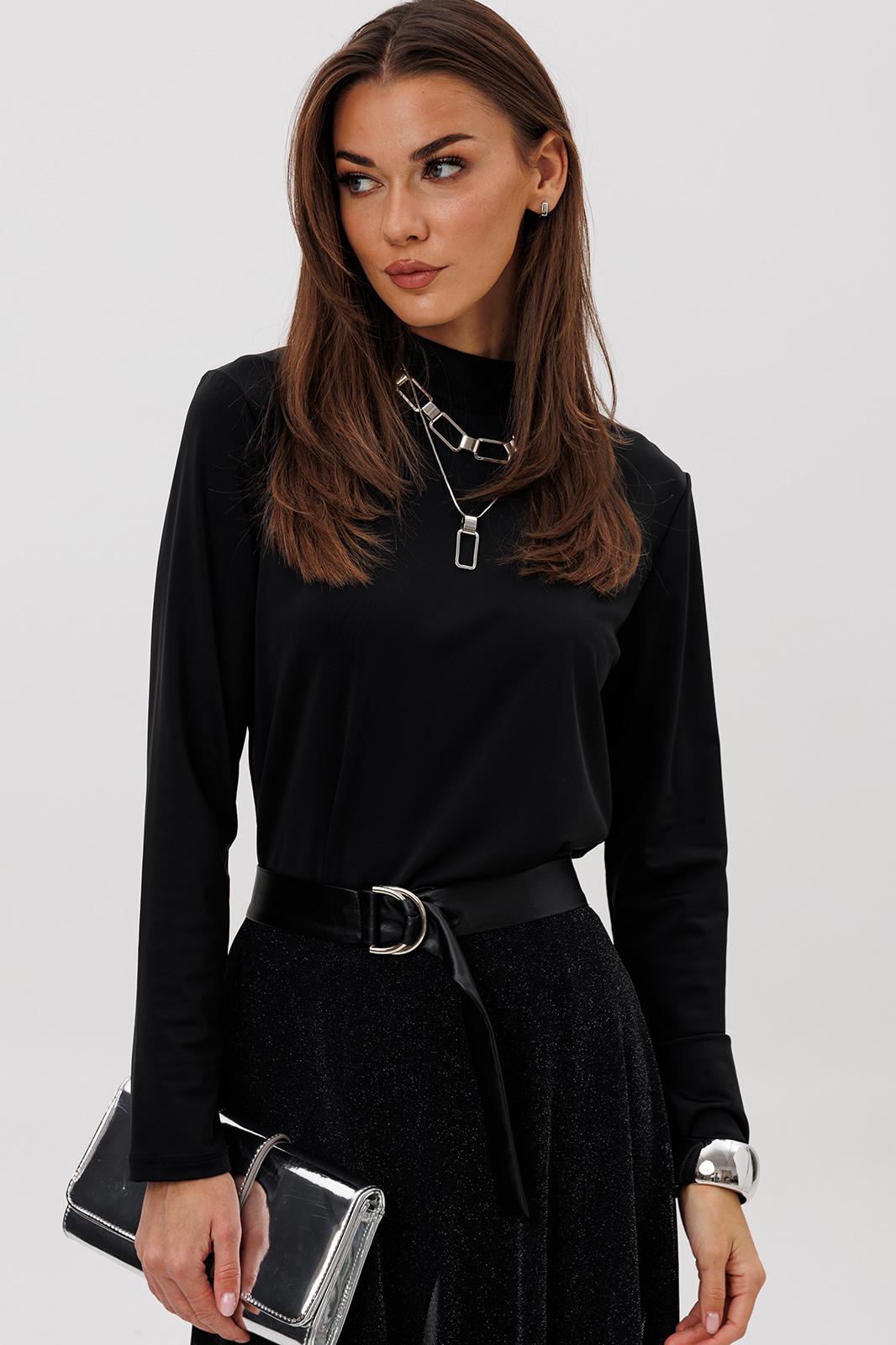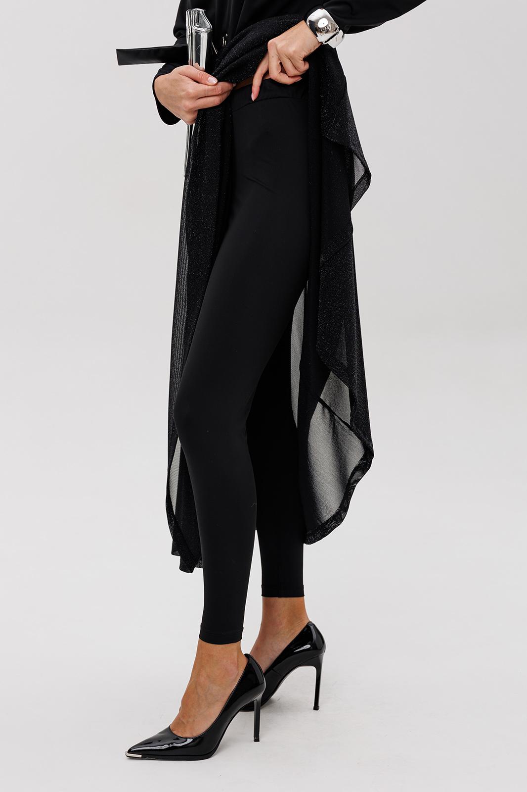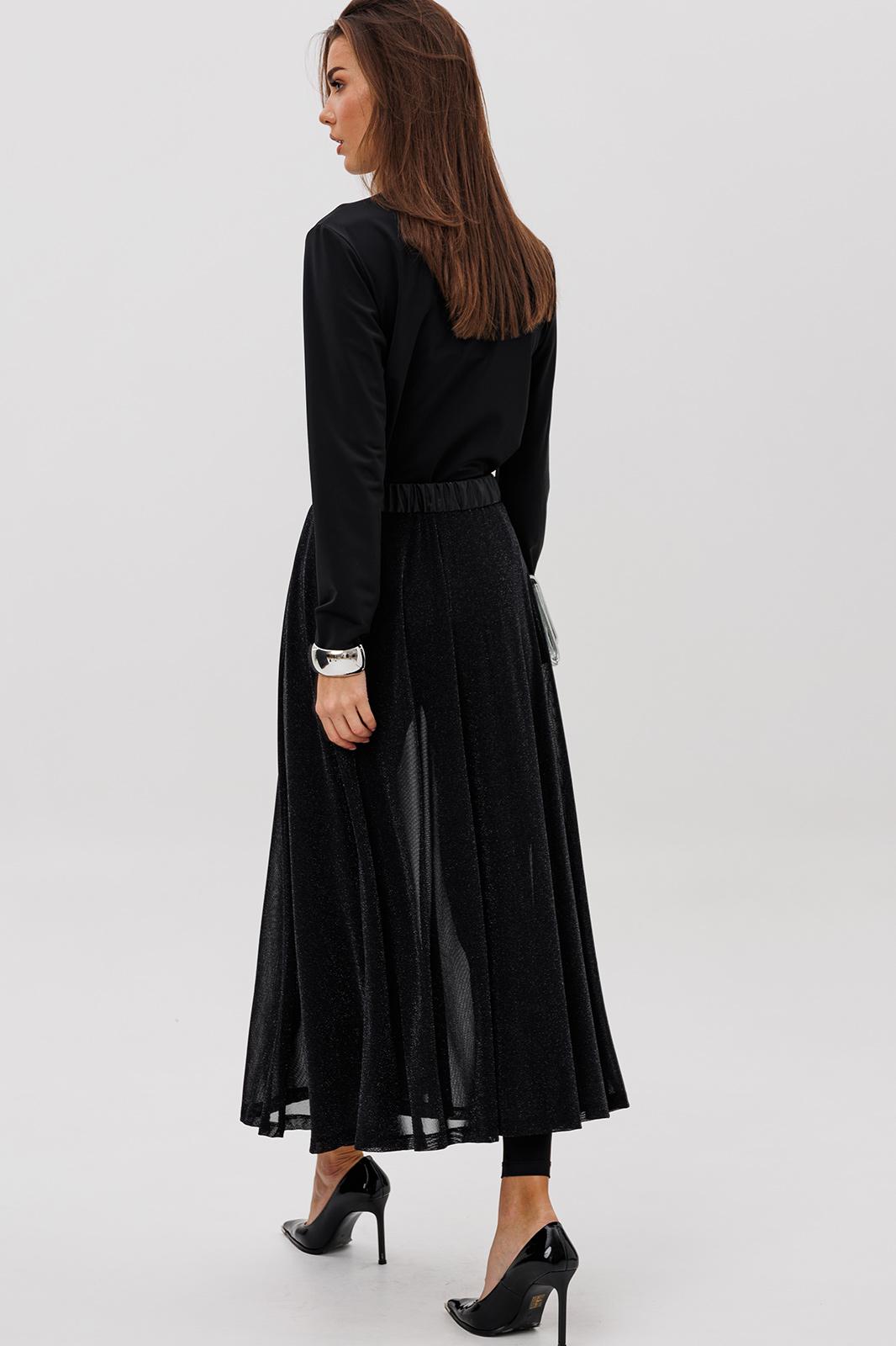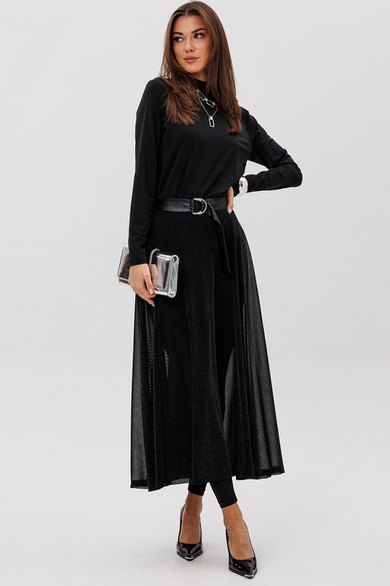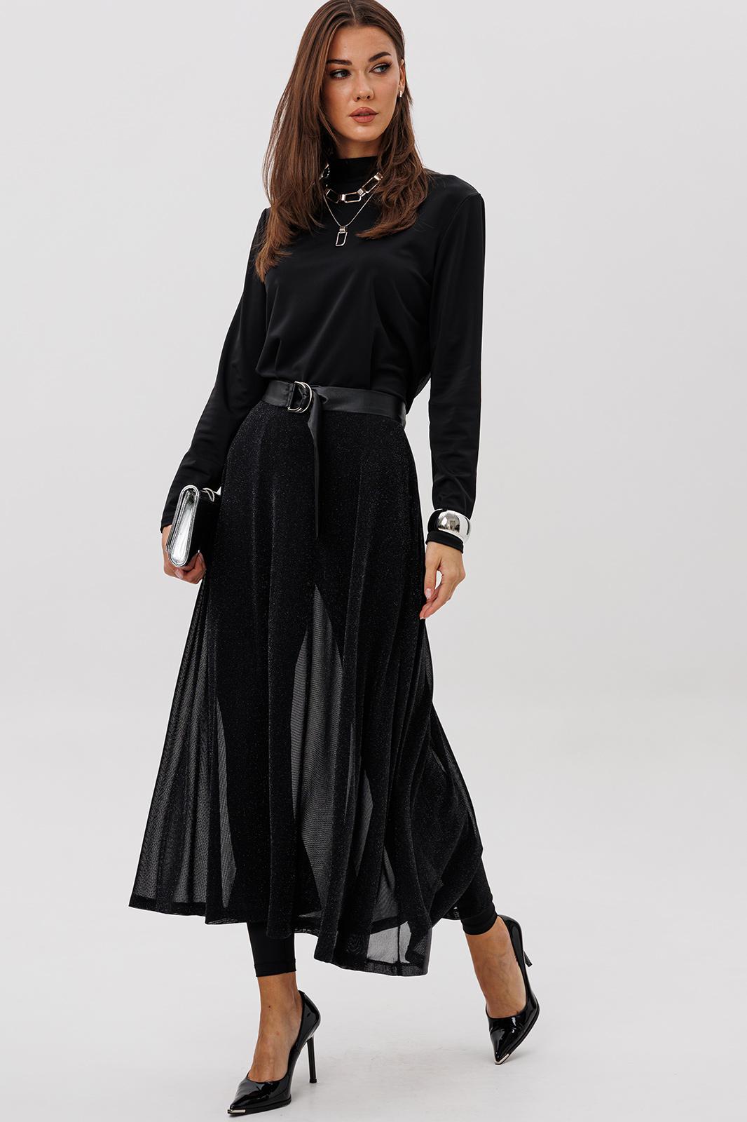Юбка выполнена из воздушной мерцающей сетки, которая красиво ловит свет при каждом движении, создавая по-настоящему нарядное, торжественное настроение. Лёгкое сияние ткани добавляет образу утончённости, а отделочный пояс из экокожи акцентирует талию и придаёт современной графичности.
