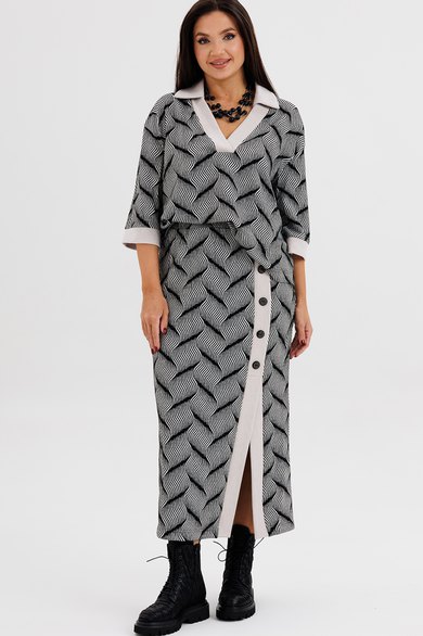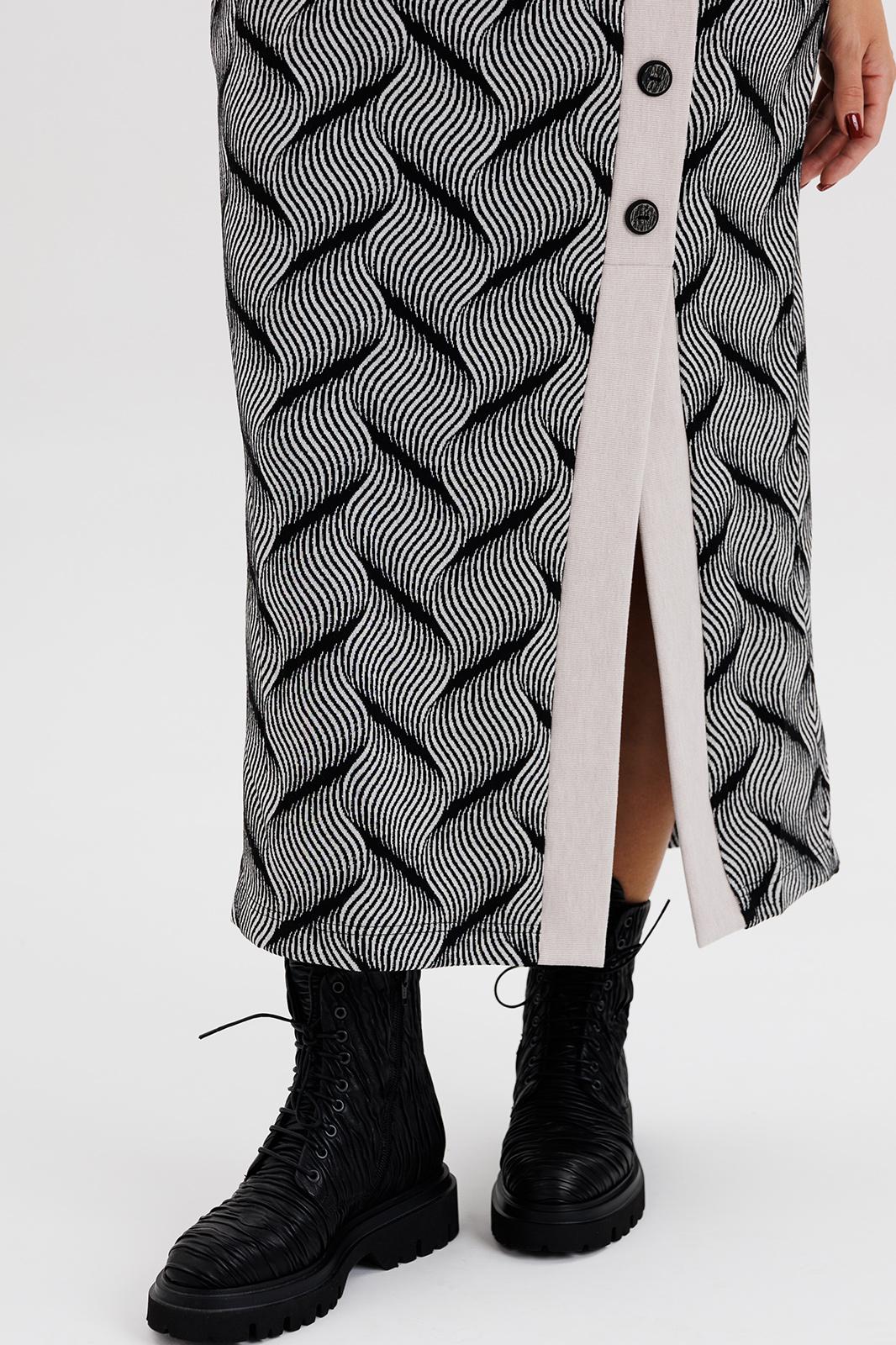 Юбка прямая. с эффектной шлицей по левой стороне переда и отделкой из контрастного полотна. Пояс юбки на эластичной тесьме в области спинки, с застёжкой по центру заднего полотнища.