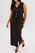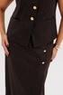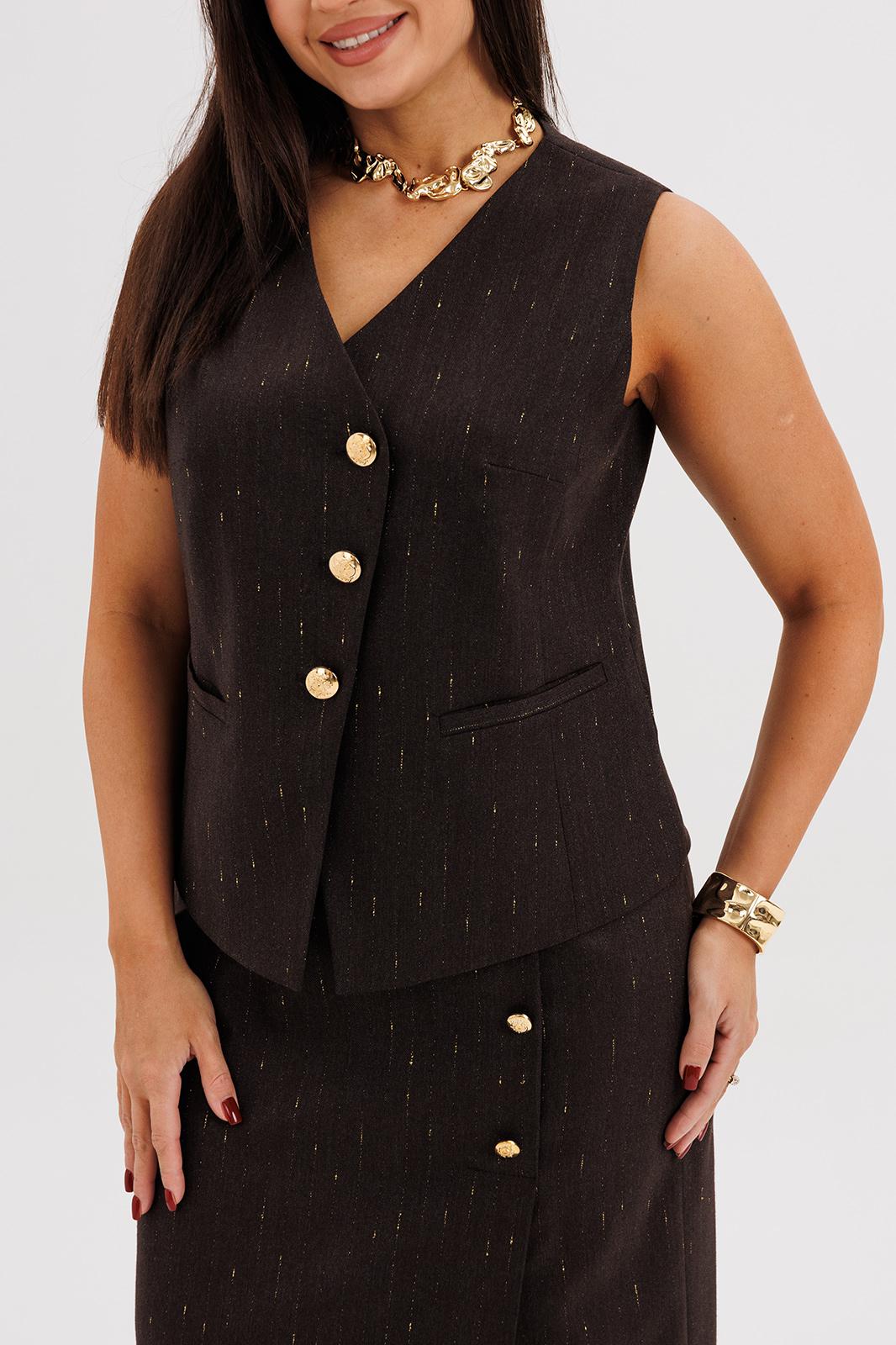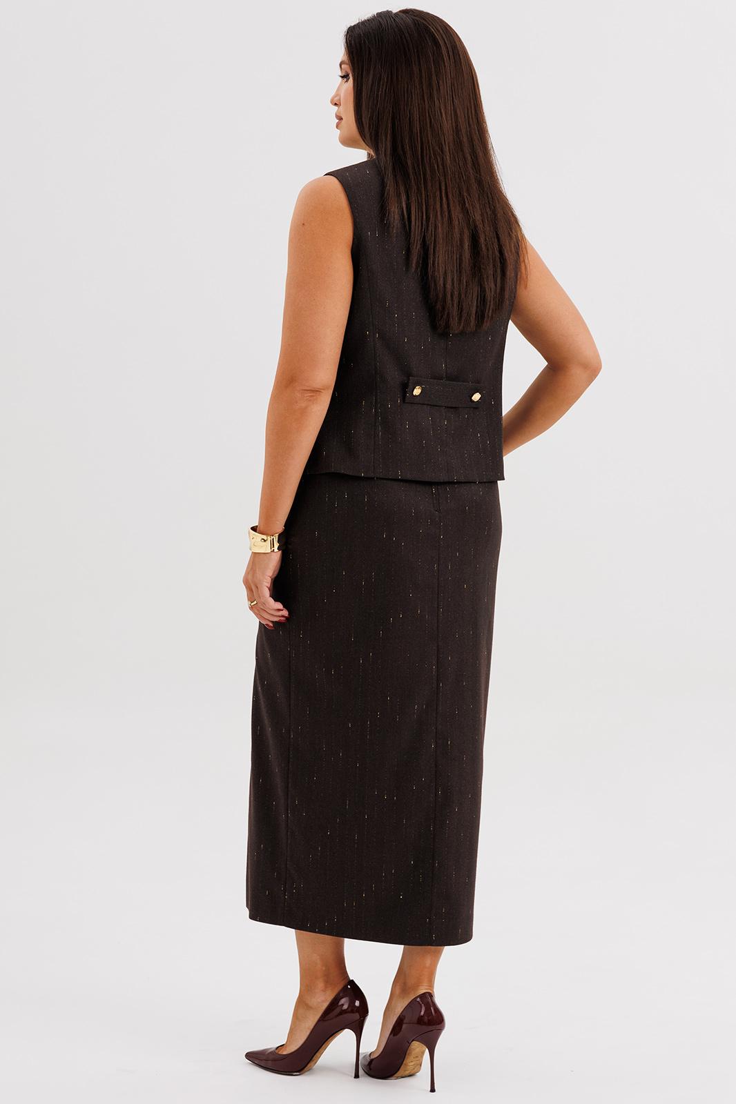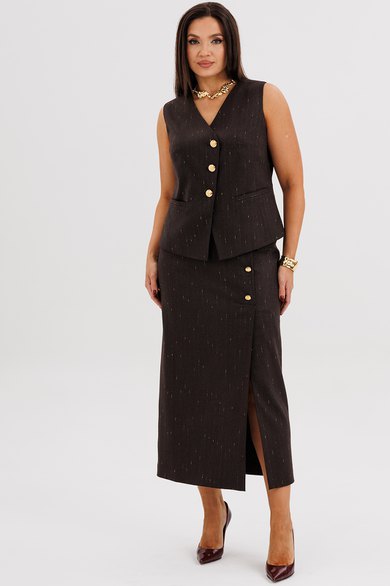 Жилет полуприлегающего силуэта подчёркивает линию талии и застёгивается на крупные декоративные пуговицы, создавая акцент на вертикали фигуры. Юбка миди с разрезом спереди и асимметричной застёжкой добавляет динамику и визуально удлиняет силуэт.