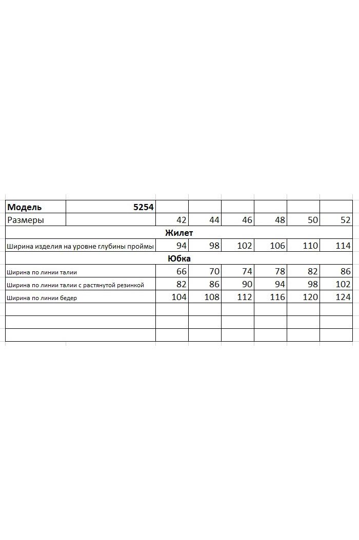 Костюм с жилетом - прекрасное решение для смелых экспериментов. Выполненный в ахроматической цветовой гамме, он позволяет дополнять себя различными аксессуарами и создавать каждый раз новые актуальные образы. Жилет прямого силуэта с центральной застёжкой и фигурным разноуровневым бортом. Спинка с декоративной разноуровневой планкой, которая иммитирует застежку. Юбка А-образного силуэта с центральным швом с высоким разрезом по переднему полотнищу. Заднее полотнище с центральным швом, отрезной кокеткой, в швах которой карманы, и застёжкой на тесьму-молнию. Пояс отрезной с эластичной тесьмой по спинке. По боковым швам - наклонный карман.