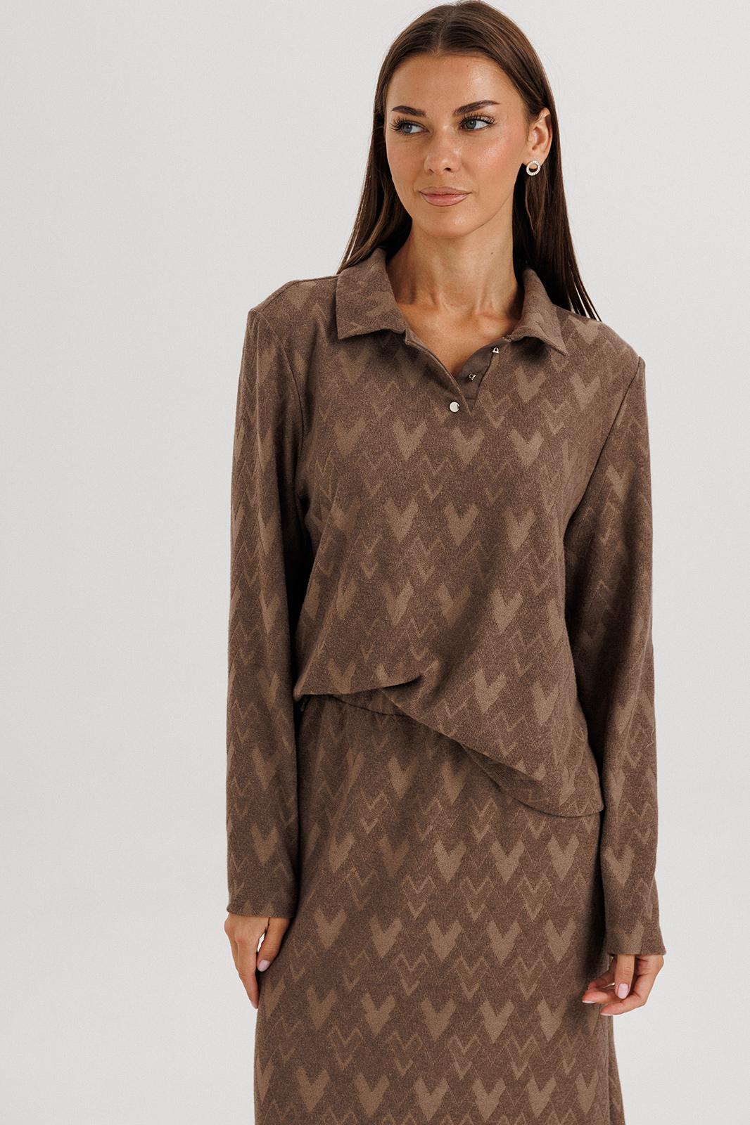 Это модный сет из мягкого трикотажа, включающий в себя джемпер-поло и юбку-«рыбку».