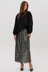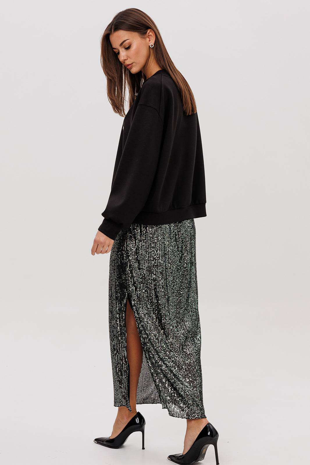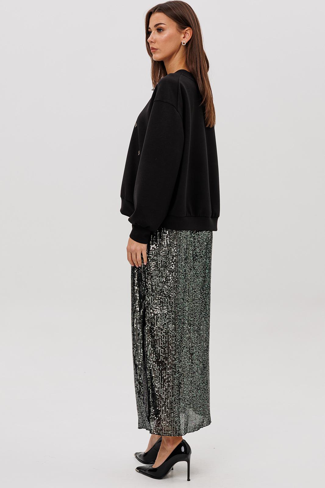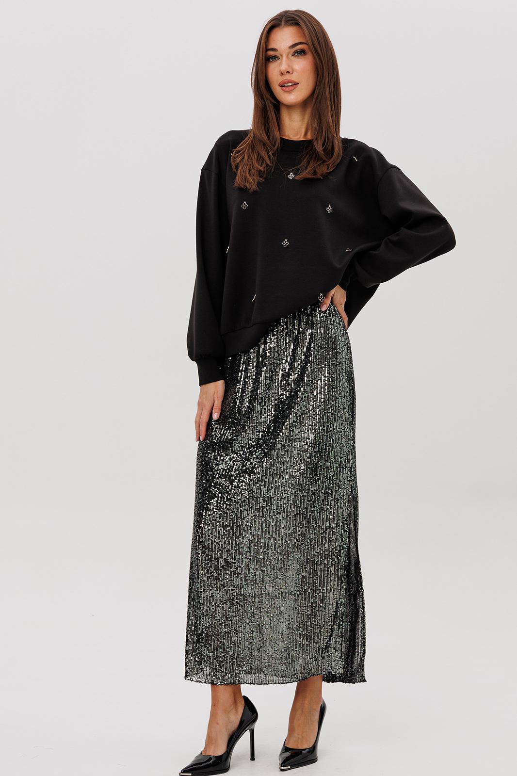 Стильный комплект, сочетающий уют и женственность. Мягкий свитшот из комфортного трикотажа украшен ручной расшивкой декоративными элементами в форме «клевера» — утончённая деталь, создающая акцент на естественной элегантности. Юбка выполнена из трендового полотна в пайетку. Юбка прямая, длинная на эластичном поясе и подкладке. Длина юбки около 90 см.