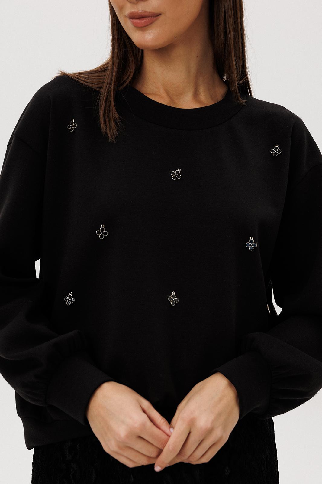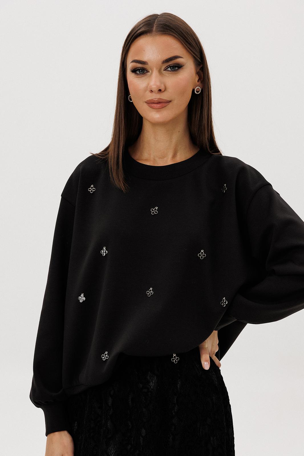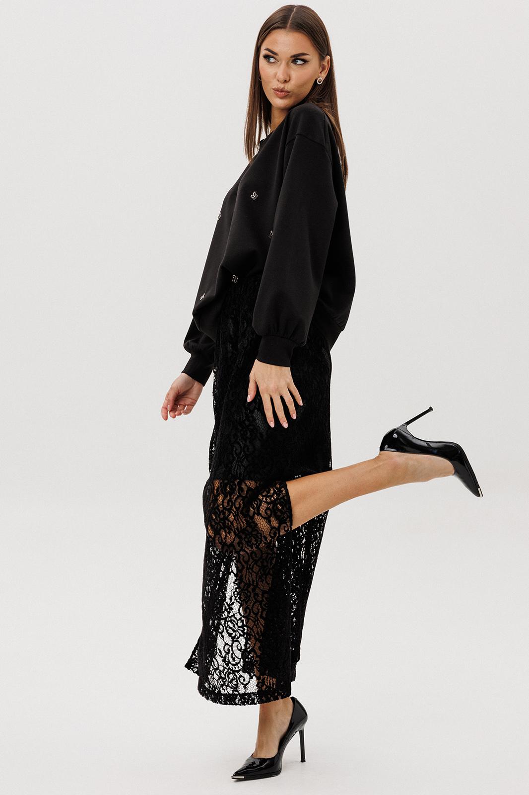 Стильный комплект, сочетающий уют и женственность. Мягкий свитшот из комфортного трикотажа украшен ручной расшивкой декоративными элементами в форме «клевера» — утончённая деталь, создающая акцент на естественной элегантности. Юбка выполнена из трендового шенилового гипюра с укороченной подкладкой, что придаёт образу лёгкость и современную многослойность.