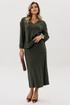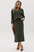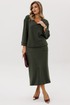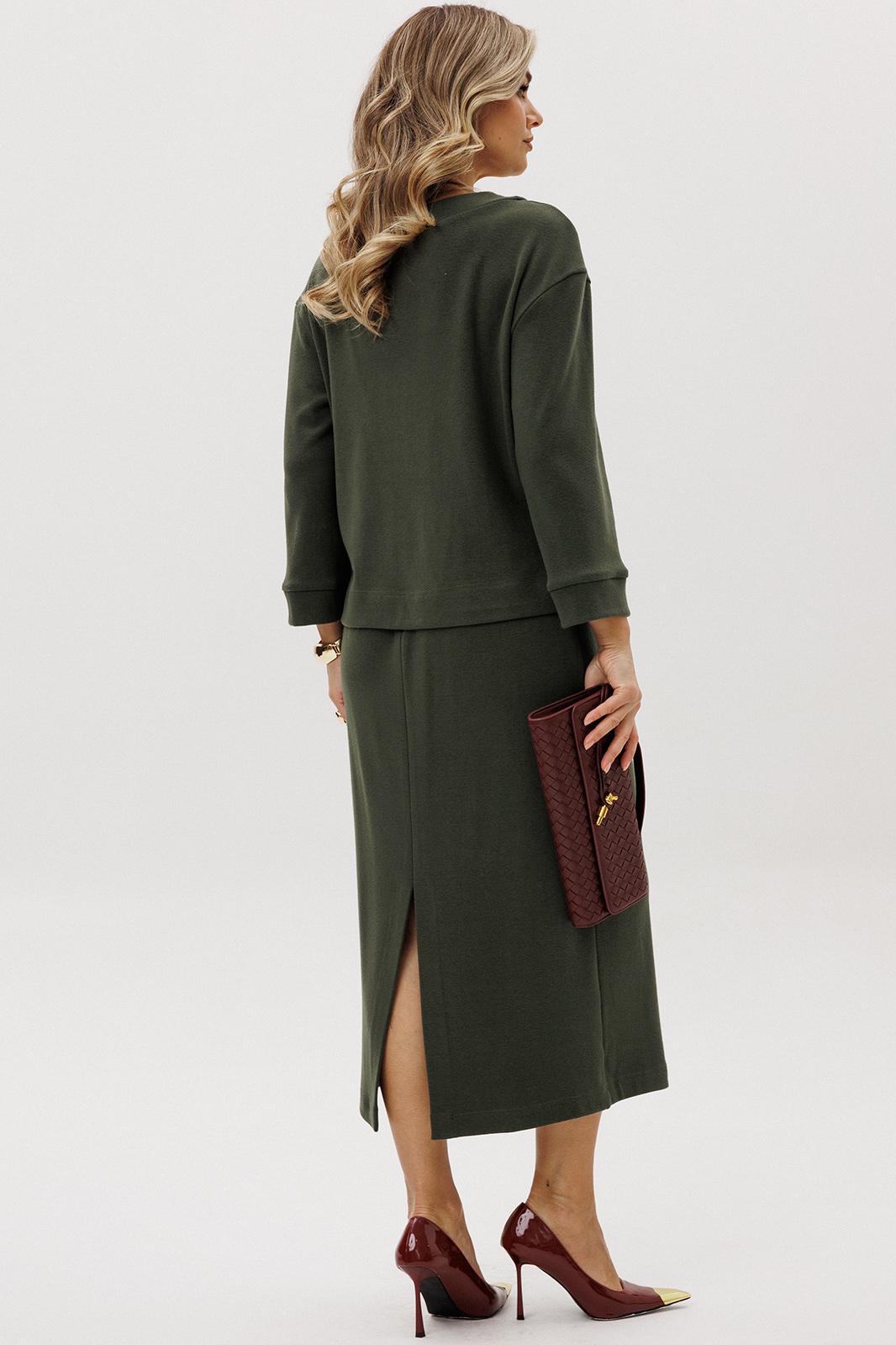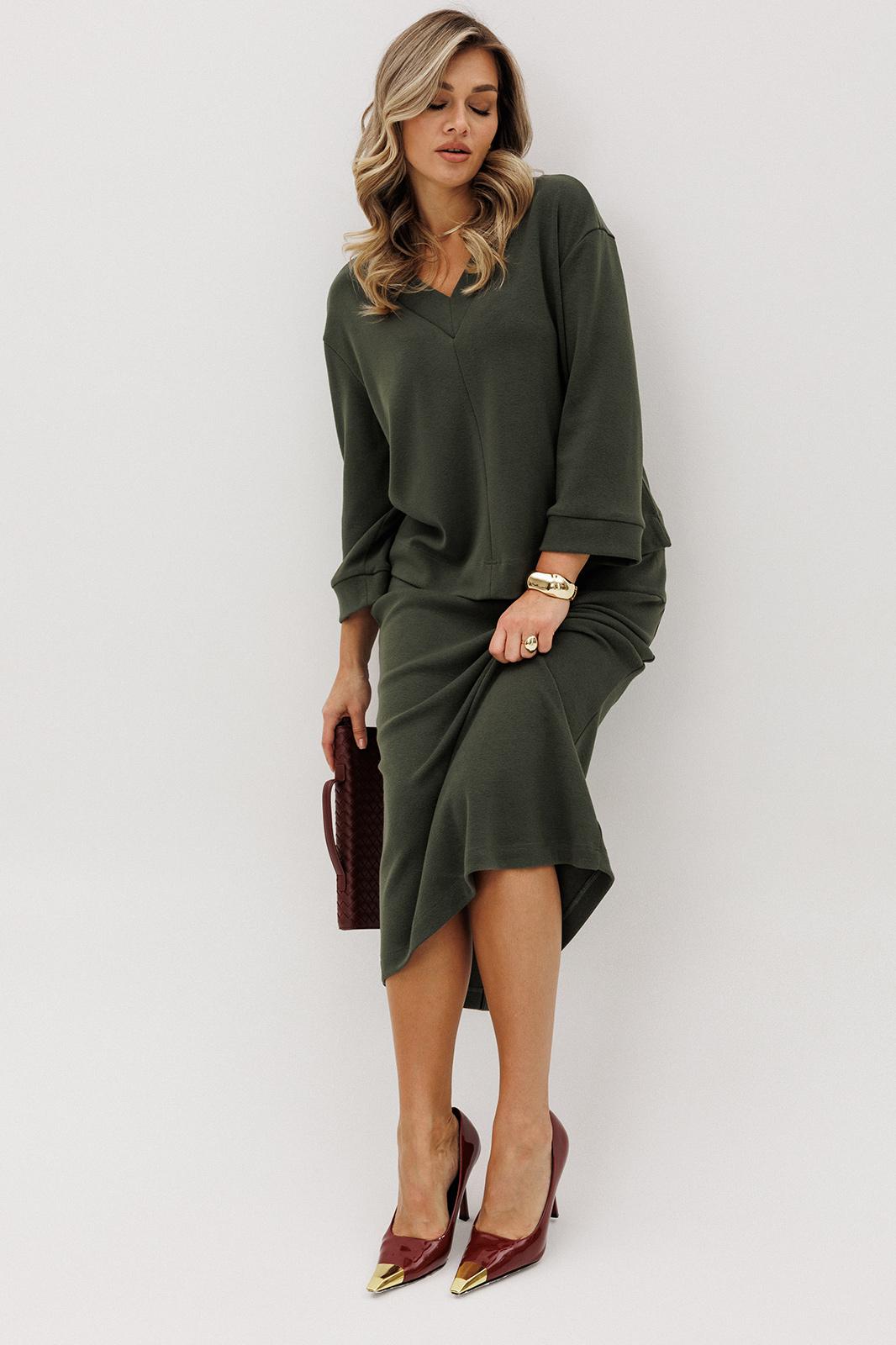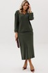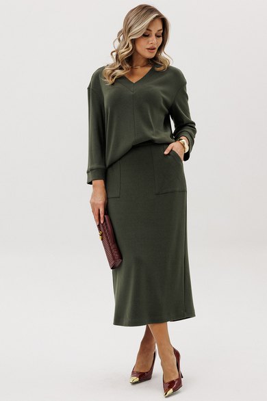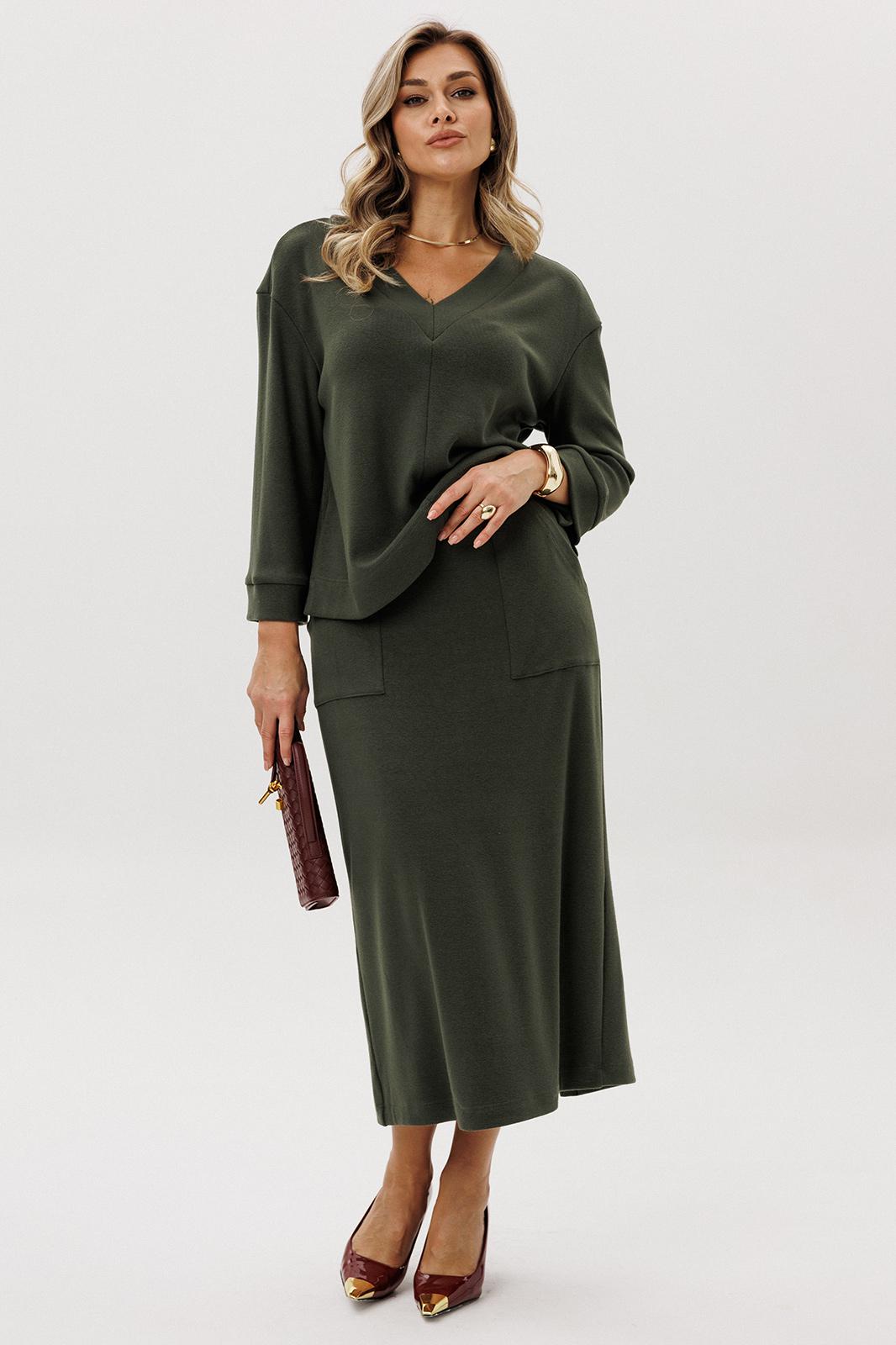 Юбка макси, на притачном эластичном поясе с большими накладными карманами на переднем полотнище. Заднее полотнище с центральным швом, шлицей, талиевыми вытачками и застёжкой.