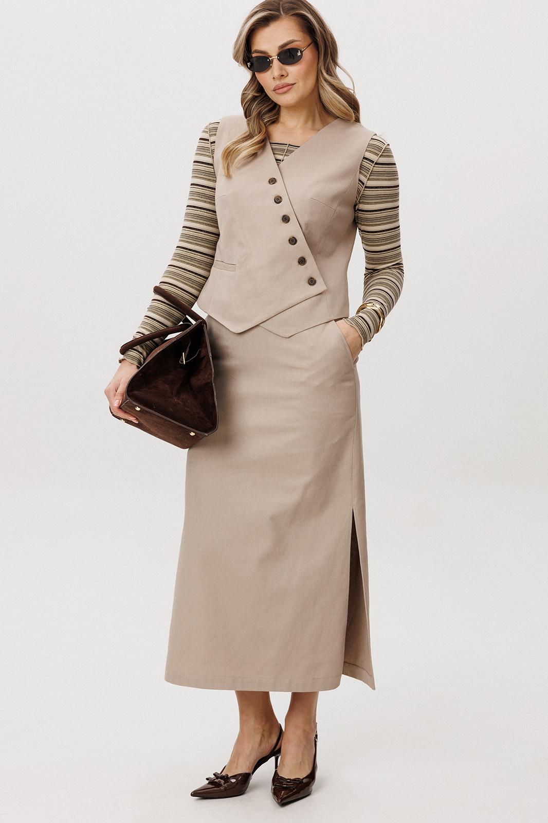 - Тип ткани: Джемпер: вискоза 75% пэ 25% Жилет и юбка: хлопок 99% эластан 1%.